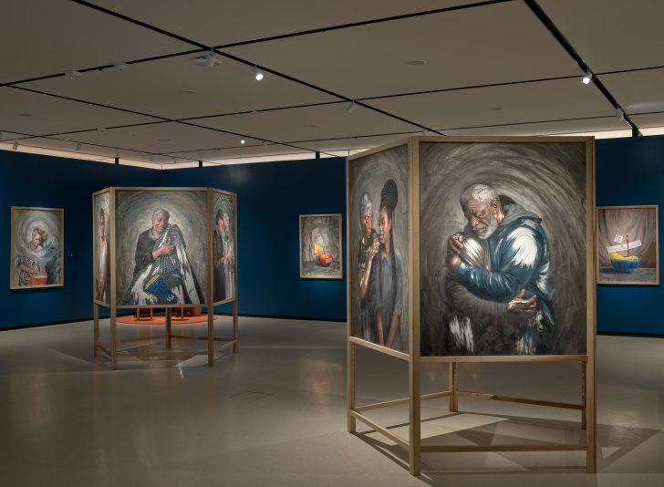 Installation views of three oil paintings in light wooden frames on a blue wall, the left being a still life of strawberries in a blue bowl, the middle a portrait of an older woman with dark skin tone embracing a young toddler with medium to dark skin tone wearing a green hoodie, and the right being a still life of two bananas with a newspaper clipping behind them
