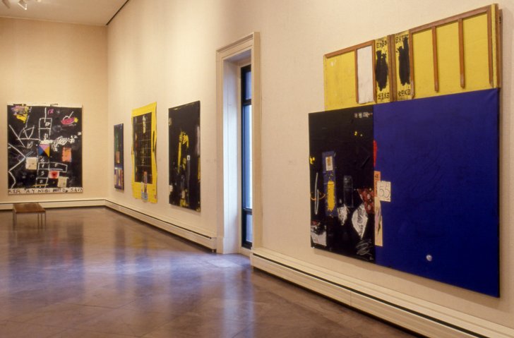 Raymond Saunders’ paintings are visual organisms which function as repositories of memory and expose layers of experience that have permeated each other over time. An influence of 19th century landscape painting is also evident in the luminous and transcendental character of his work, as seen in China Parts, 1987, a triptych constructed of canvas and wood modules painted luminous black, blue, and yellow.