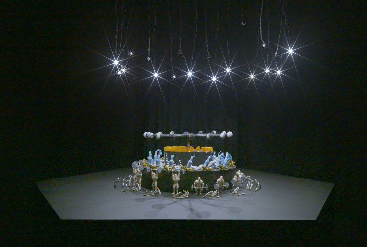 Camille Henrot (French, born 1978). October 2015 Horoscope, 2015. Five different sets of resin cigarette figures, set of resin weightlifter figures, set of resin Buddha figures, set of found object and resin vodka bottle figures, set of resin sad figures, set of found objects and resin pill bottles and pills, set of resin moon figures, Arduino motor, LED strobe lights, splitter connecting LED and motor, and control switch. 38 x 88 x 100 inches