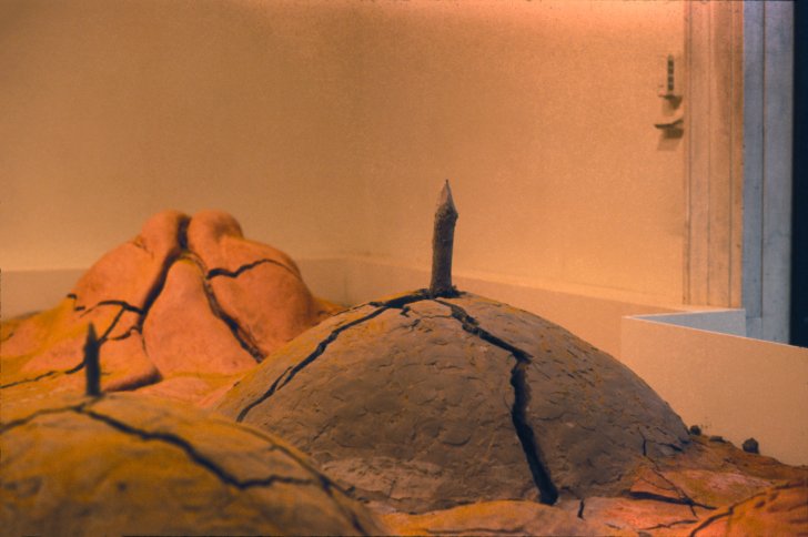 Temenos, an ancient Greek word meaning a sacred space dedicated to gods, was the title chosen by Simonds for his indoor installation created especially for the Albright-Knox. It was a fantasy landscape of colored clay, sticks, and stones covering the floor of a gallery, where it could be observed from three doorways. The landscape, a ritual place for Simonds' Little People, reflected "their scale and the shapes and forms of their life cycles." Photographs, drawings, and clay models were installed in an adjacent gallery.