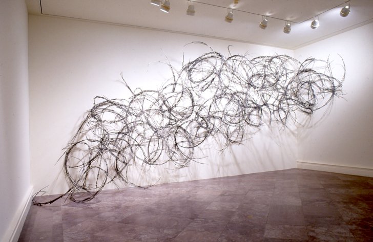 John Bisbee's sculptures, made exclusively of welded nails, blend elements of Surrealism and Minimalism with mystery and humor to create a truly unique and engaging sculptural vision. These elegant, abstract geometric sculptures have an organic quality to them, which is especially surprising given the industrial medium from which they are made. The combination of fine craftsmanship and sharp nails in his works has led one commentator to call them "a cross between a Faberge egg and a porcupine."