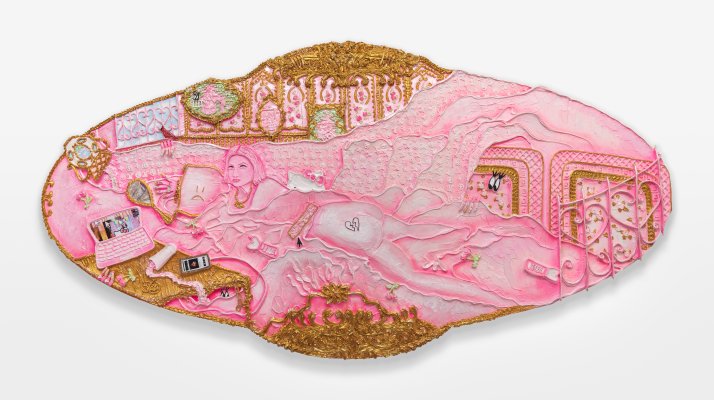 Yvette Mayorga (Lives and works in Chicago). The Brunette Latinx Self Portrait After François Boucher’s “The Brunette Odalisque,” c.1745, 2022. Acrylic nails, acrylic marker, false eyelashes, collage, plastic rings, plastic nail charms, rhinestones, car wrap vinyl, and acrylic piping on panel / Uñas acrílicas, marcador acrílico, cejas postizas, collage, anillos de plástico, decoraciones de plástico para uñas, diamantes de imitación, vinil de auto y acrílico aplicado con manga pastelera sobre panel. Overall 60 × 120 × 2 in. (152.4 × 304.8 × 5.1 cm). Courtesy of the artist. Photo: Robert Chase Heishman