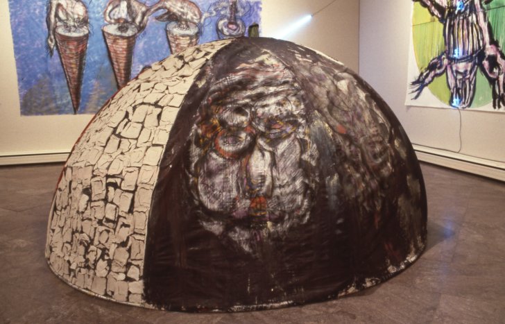 Mario Merz was the seventh in a continuing series of cooperative projects organized by the Albright-Knox with HALLWALLS and CEPA Gallery. Recent paintings and constructions—replete with colossal primitive beats and turgid plant forms—were the focus of the exhibition. These paintings, with their densely worked surfaces and looming fervency, are highly expressionistic in impulse and replete with Merz’s personal iconography. Intrinsic to Merz’s work has always been visionary spirit and belief in the pure forces of creativity. For nearly two decades, the artist’s work in its multitudinous forms has continued to be an inspiring force, primarily in Europe. Merz has ventured into a visionary realm, all the while staying on the edge of theatricality and romantic effusion.