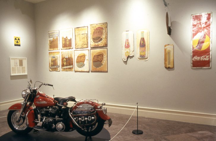 In conjunction with The Tumultuous Fifties: A View from the New York Times Photo Archive, The Material Fifties was a special installation devoted to 1950s mass culture. Objects featured include original recordings of the era; a rare cherry-red 1952 Harley; a Coke machine; posters advertising cigarettes and fast cars; highway signs; first editions of Beat fiction and poetry; Wonder Woman, Mad, and Atomic War comic books; US government Cold War pamphlets; and pulp fiction. This installation provides a tangible complement to the black-and-white world represented in the photographs from the New York Times Photo Archives.