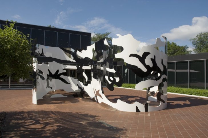 Jim Hodges—a internationally renowned artist who transforms ordinary objects into poetic spectacles—brought his largest work to date to the Albright-Knox’s Sculpture Garden in the summer of 2006. This sculpture, entitled look and see, is a nearly 12-foot, twisting plane of stainless steel with a surface that has been cut with a laser, polished, and painted black and white to create a stylized camouflage pattern, which includes reflective areas through which one can see the surrounding architecture. As a result, the sculpture becomes an installation, quietly and sensually reorienting your experience in its environment. This work was originally a public art commission for Creative Time’s Art on the Plaza, located at The Ritz-Carlton New York, Battery Park.