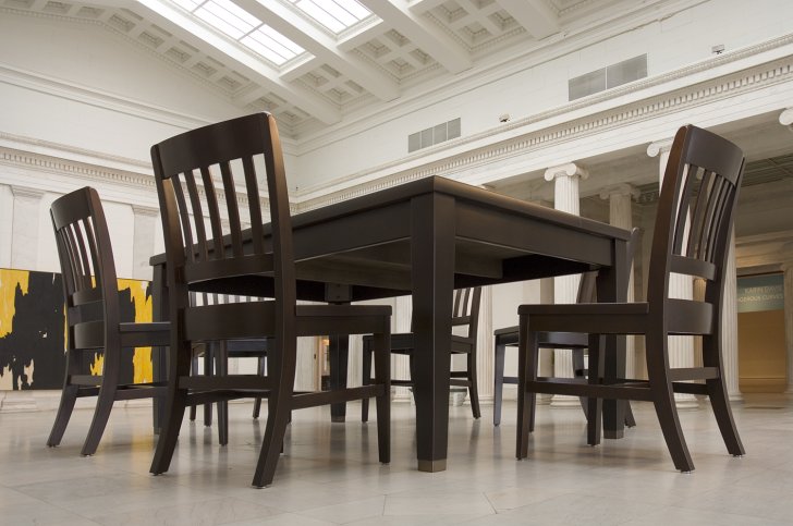 This work was inspired by a series of black-and-white Polaroid photographs the artist made of the underside of his kitchen table, which captured the mix of vertical and horizontal lines formed by the various surfaces, legs, and rungs of the furniture. Therrien enlarged the original object to reproduce the dramatic perspectives captured in the photos, creating a new and unexpected way of seeing these familiar forms.