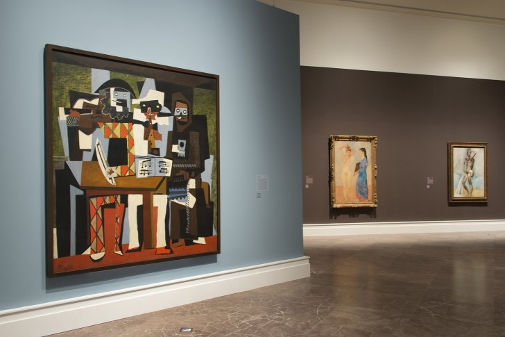 Installation view of Picasso: The Artist and His Models, with Picasso's Three Musicians, 1921; La toilette, 1906; and Bather, winter 1908–09. Photograph by Tom Loonan.