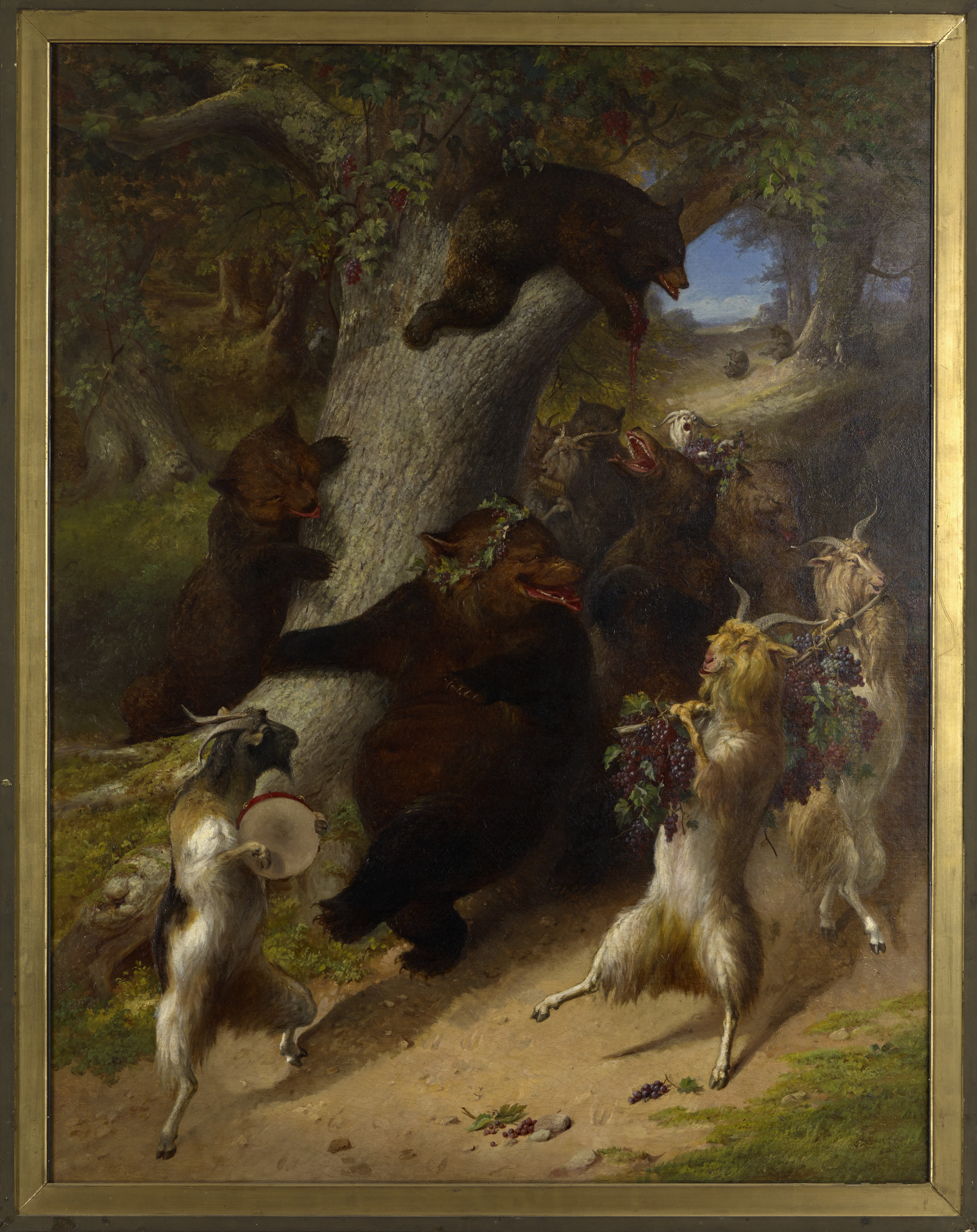 William Holbrook Beard is best known for his nuanced, allegorical depictions of human behavior, and the delightful characters he created appealed to the mid-nineteenth-century taste for humorous, anecdotal scenes. The March of Silenus is a lively satire of mankind’s folly aimed at exposing social vulgarities. Beard depicts a mock procession in which Silenus, a companion of Dionysus, the Greek god of wine, appears as a rotund brown bear accompanied by a troupe of drunken, cavorting accomplices. Goats dance, play musical instruments, and carry grapes while bears can be seen hanging from and hiding behind trees and rolling down the trail in the distance. All are anxious to taste the “nectar of the Gods”—some of them are even poised with their mouths wide open in anticipation.