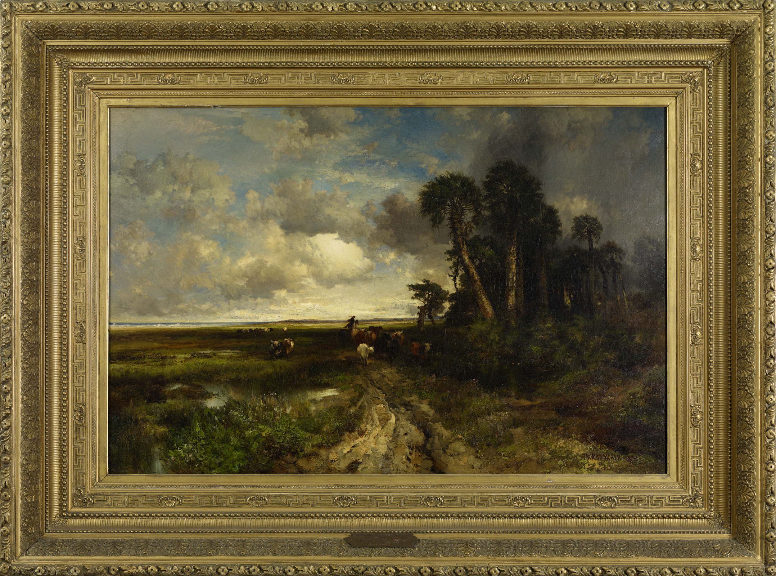 Thomas Moran traveled throughout the United States, painting large canvases of picturesque and dramatic views complete with the effects of storm clouds, sunsets, rainbows, and other atmospheric phenomena. Such images found favor with the newly wealthy leaders of American commerce and industry. Not only did Moran’s paintings echo the country’s widening horizons, but they were also an appropriate size for imposing Victorian drawing rooms. Here, the popular theme of livestock in a landscape is spacious and animated. The glow of the evening sky to the left of the canvas contrasts dramatically with trees that stir in the wind of an oncoming storm to the right. The farmer’s work, however, is not done until his cattle are out of harm’s way and secure for the night.