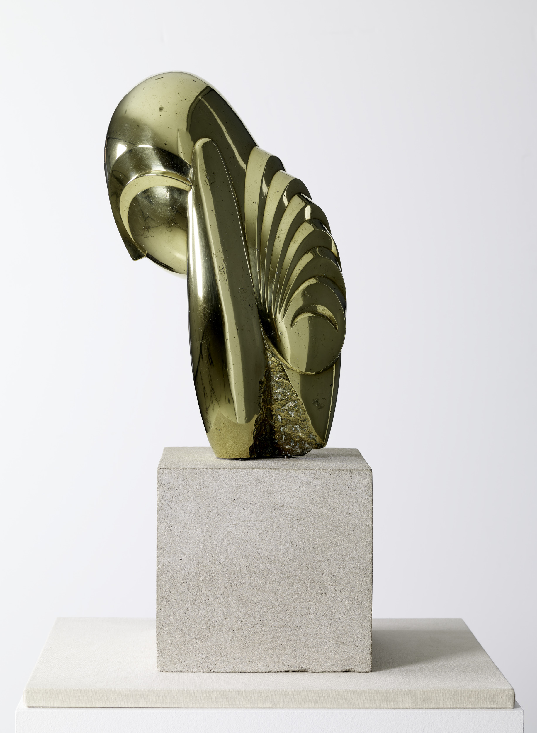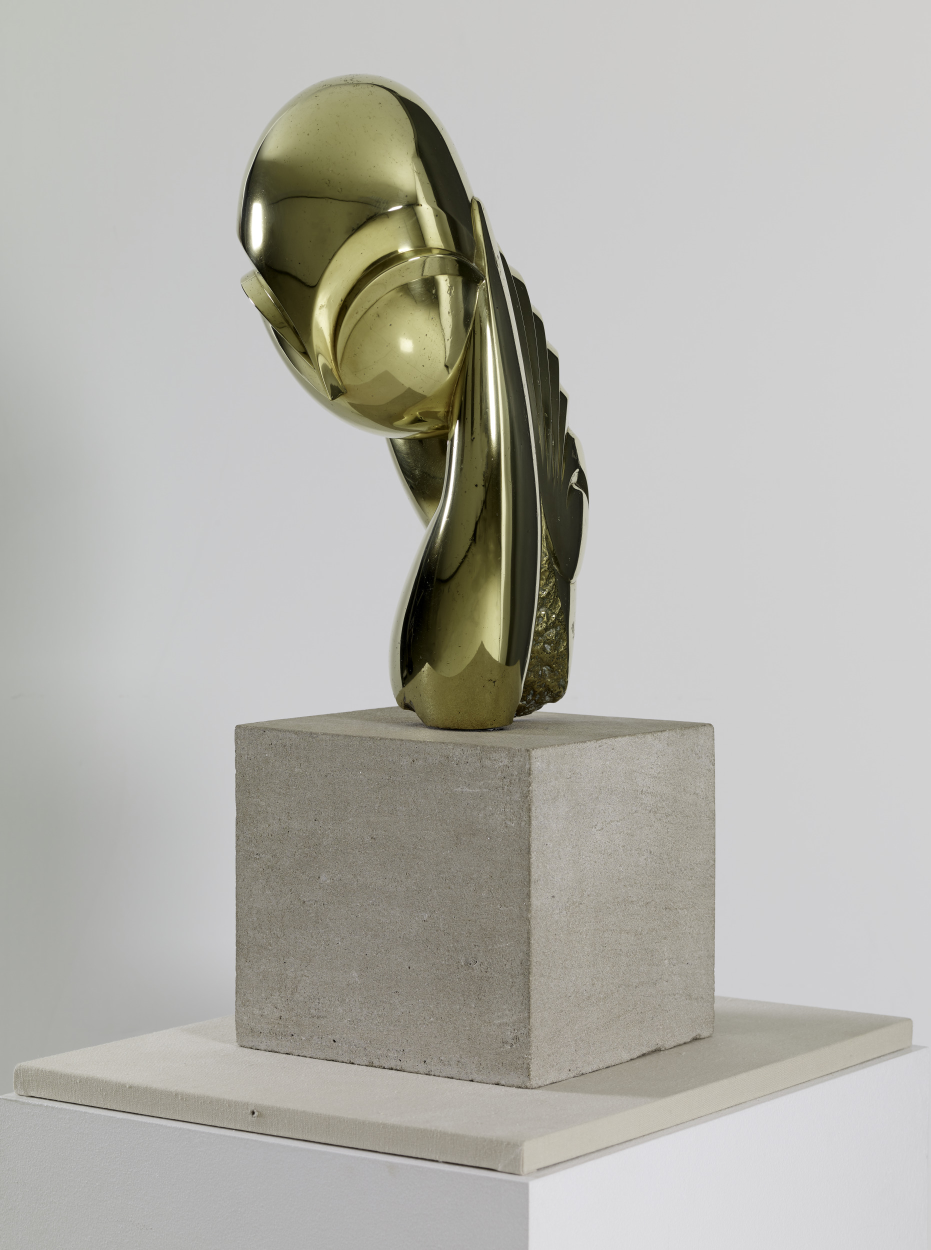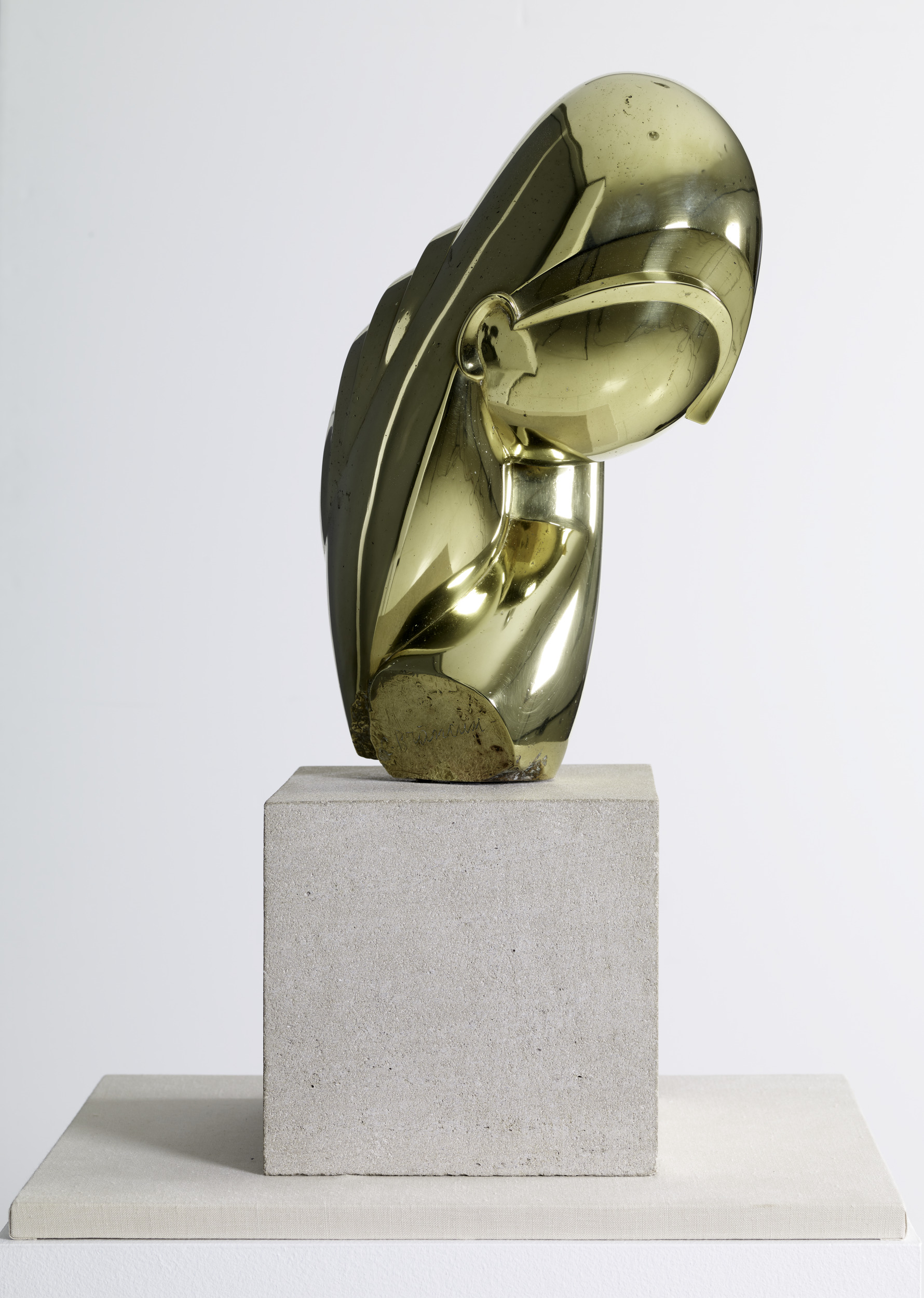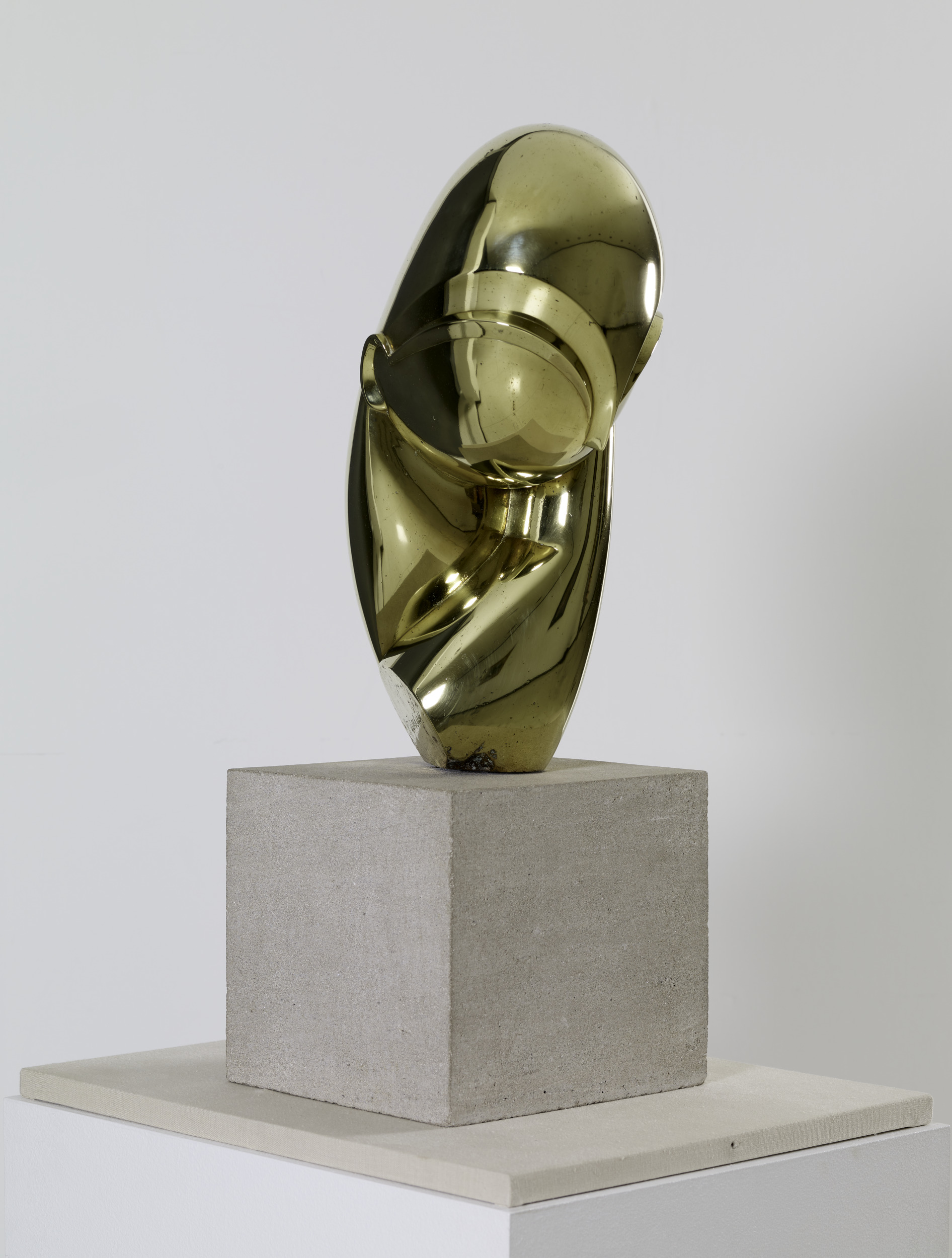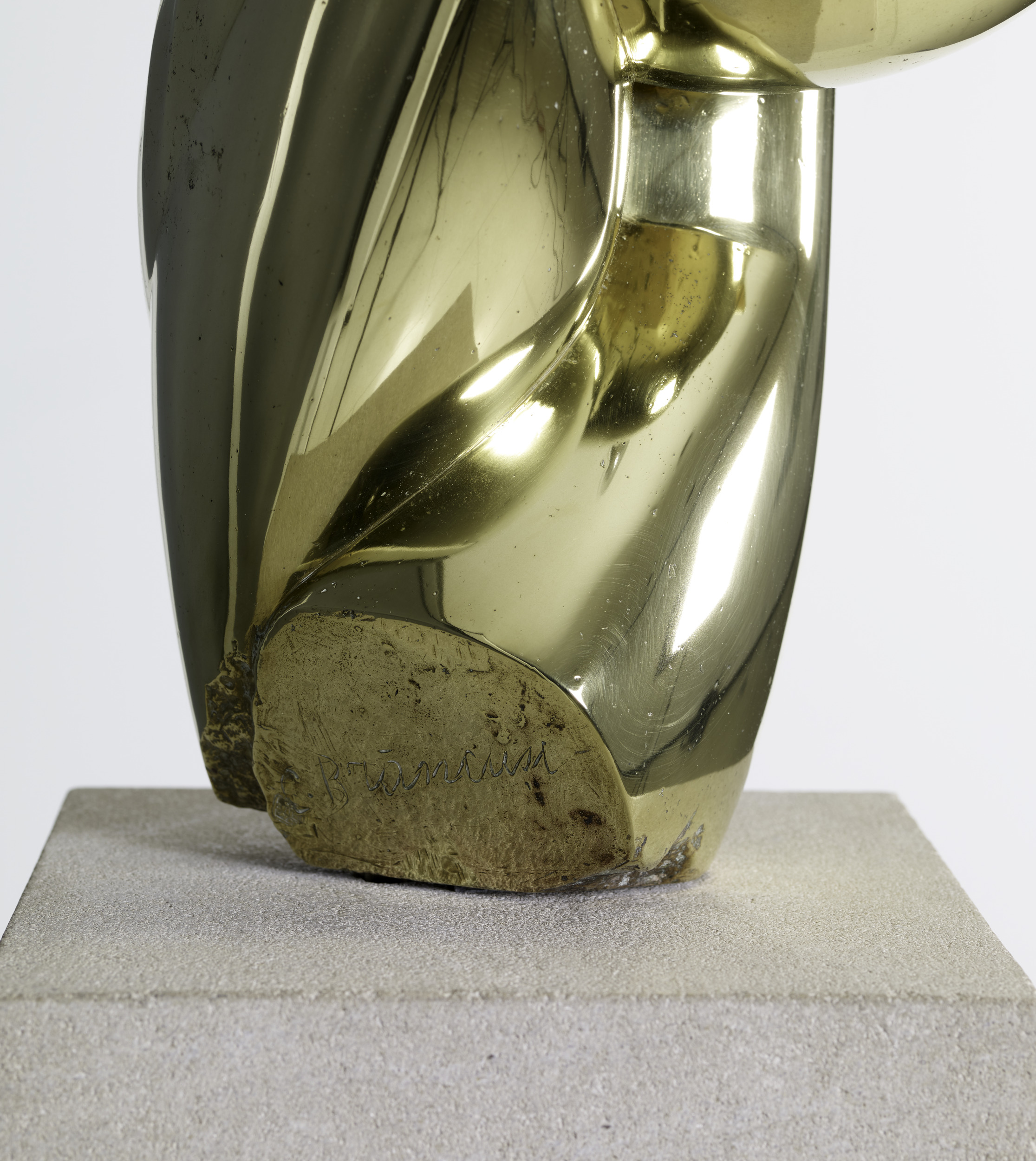 Constantin Brancusi’s gracefully restrained forms are recognized as one of the major sculptural developments of the early twentieth century. In Paris in 1910, Brancusi met this sculpture’s subject, the landscape painter Margit Pogány (Hungarian, 1879–1964). After Pogány visited Brancusi’s studio in Paris, she requested that he create her portrait and sat for him several times. Pogány later recounted how the portrait came to be: “Once I had to sit for my hands but the pose was quite different to that of the present bust, he only wanted to learn them by heart as he already knew my head by heart.” It was not until after Pogány returned to Hungary in early 1911, however, that Brancusi carved her likeness in marble from memory. A bronze cast was then made from the marble original. Seven years later, Brancusi created a second version of her portrait, both in marble and, as seen here, in bronze. The mannerist forms of Mademoiselle Pogany II are at once a statement of the inherent beauty of Brancusi’s medium and a representation of female beauty. Not unlike a caricaturist, Brancusi has simplified, and therefore emphasized, his subject’s features: large, almond-shaped eyes; severe brows; a slender nose; an ornate chignon of hair; and the demure gesture of hands resting against a chin.