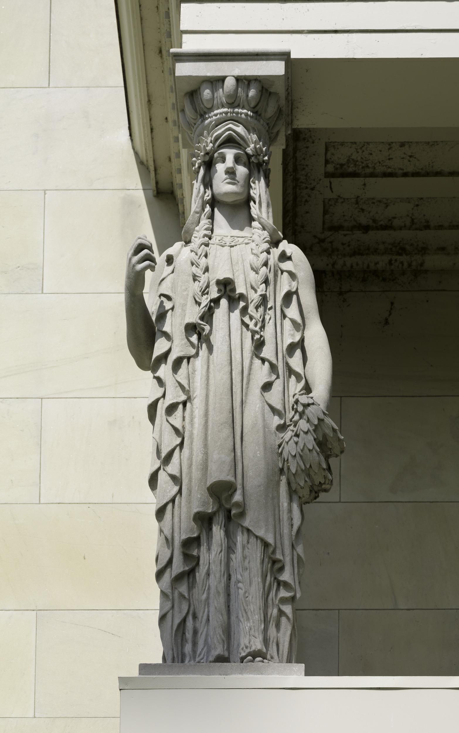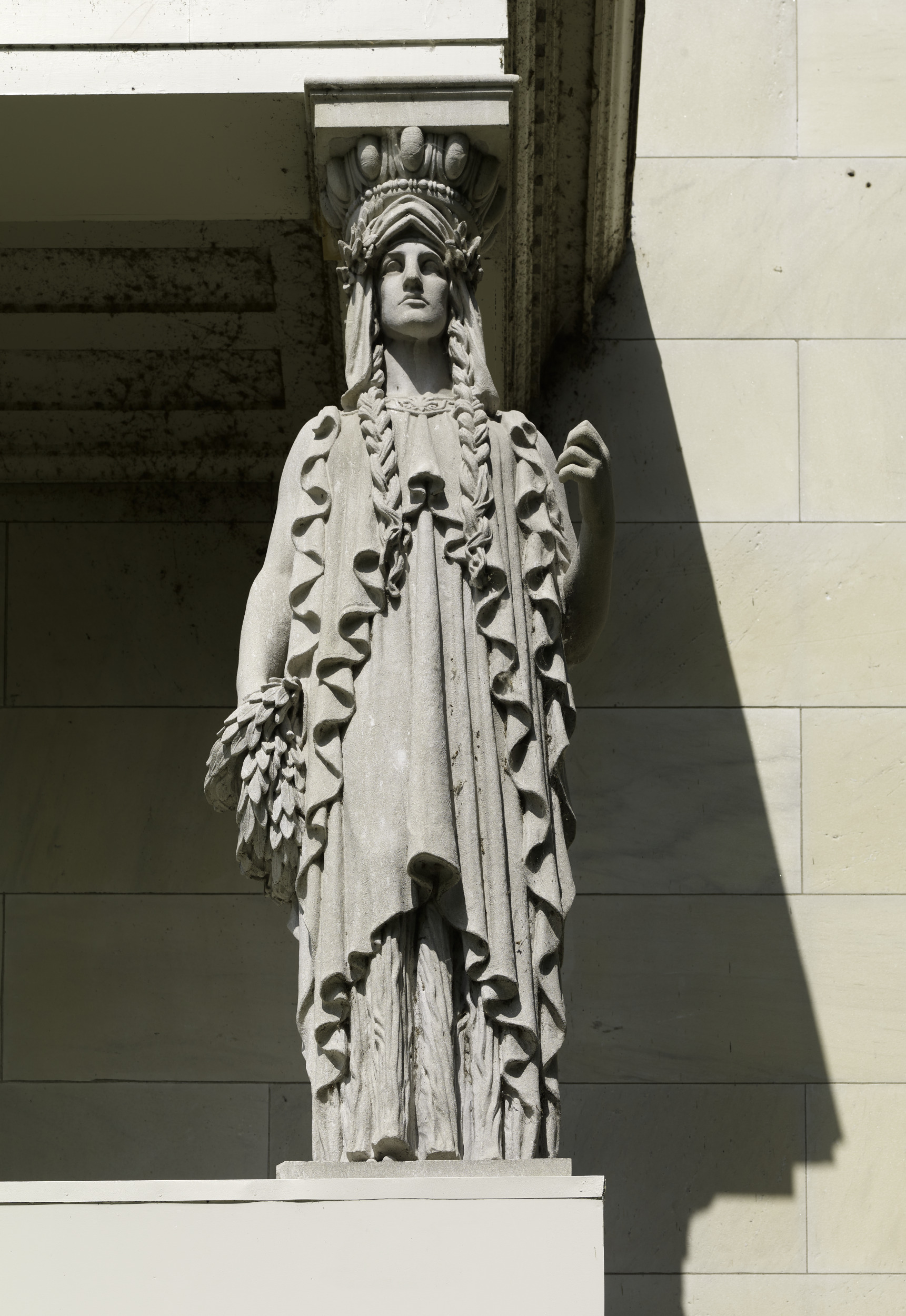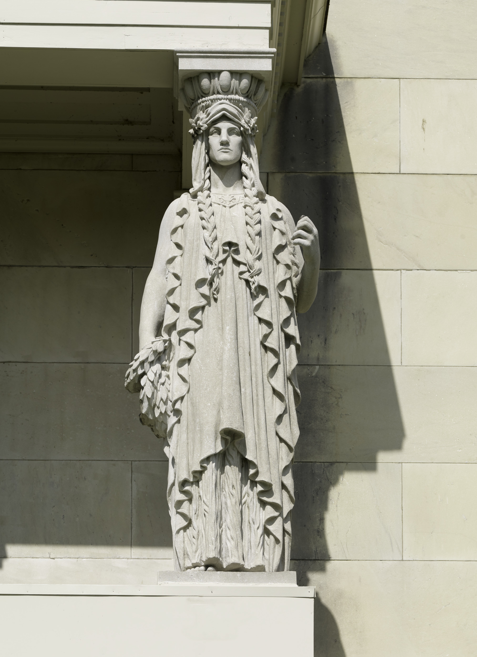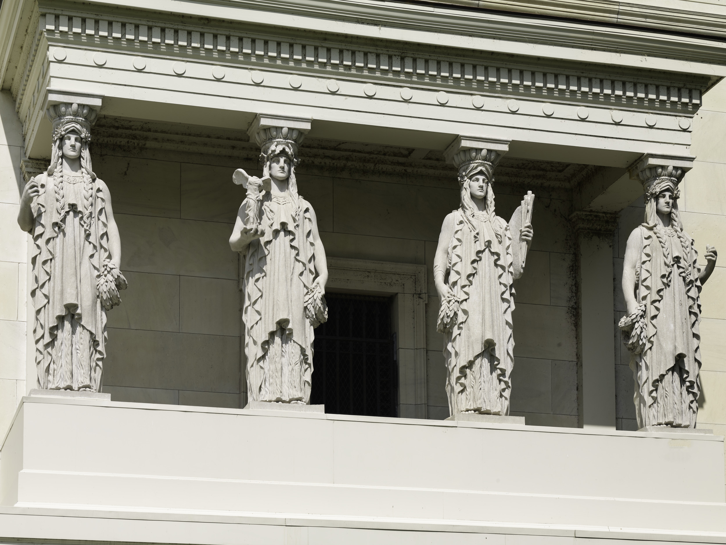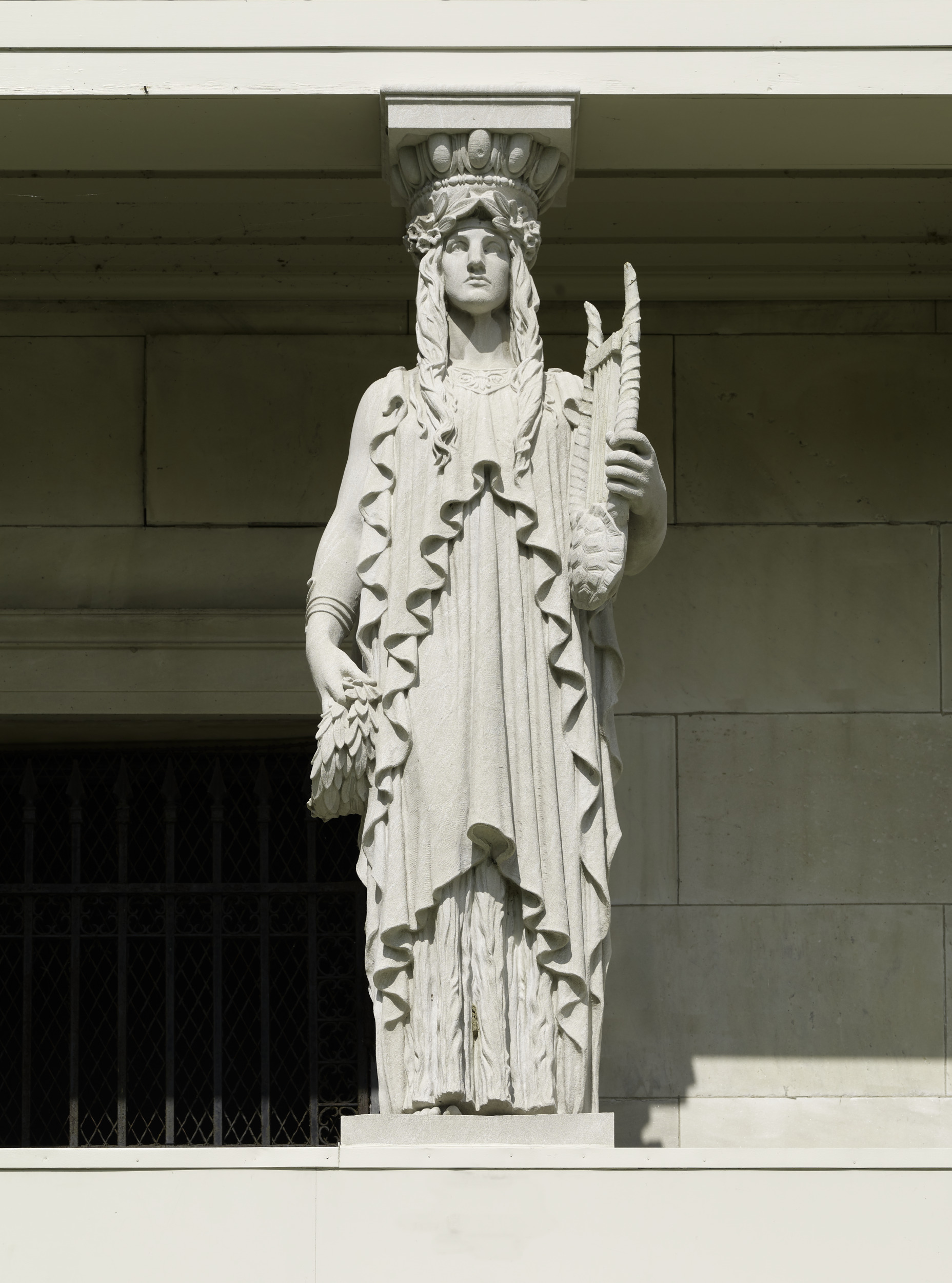 First on view at the museum in 1921 as part of an exhibition of work from the collection of John J. Albright and his wife, Augustus Saint-Gaudens's eight caryatid figures were finally acquisitioned as part of the museum’s collection and installed on the east façade of the 1905 Building in June 1934. Based on similar sculptures supporting porches on the Erechtheum—an ancient Greek temple on the Acropolis at Athens—Saint-Gaudens's versions for the museum represent various branches of the arts, including architecture, music, sculpture, and painting, as well as victory.