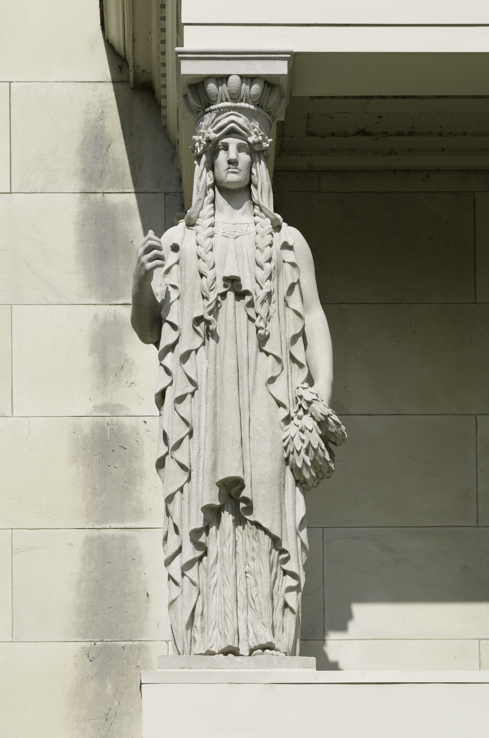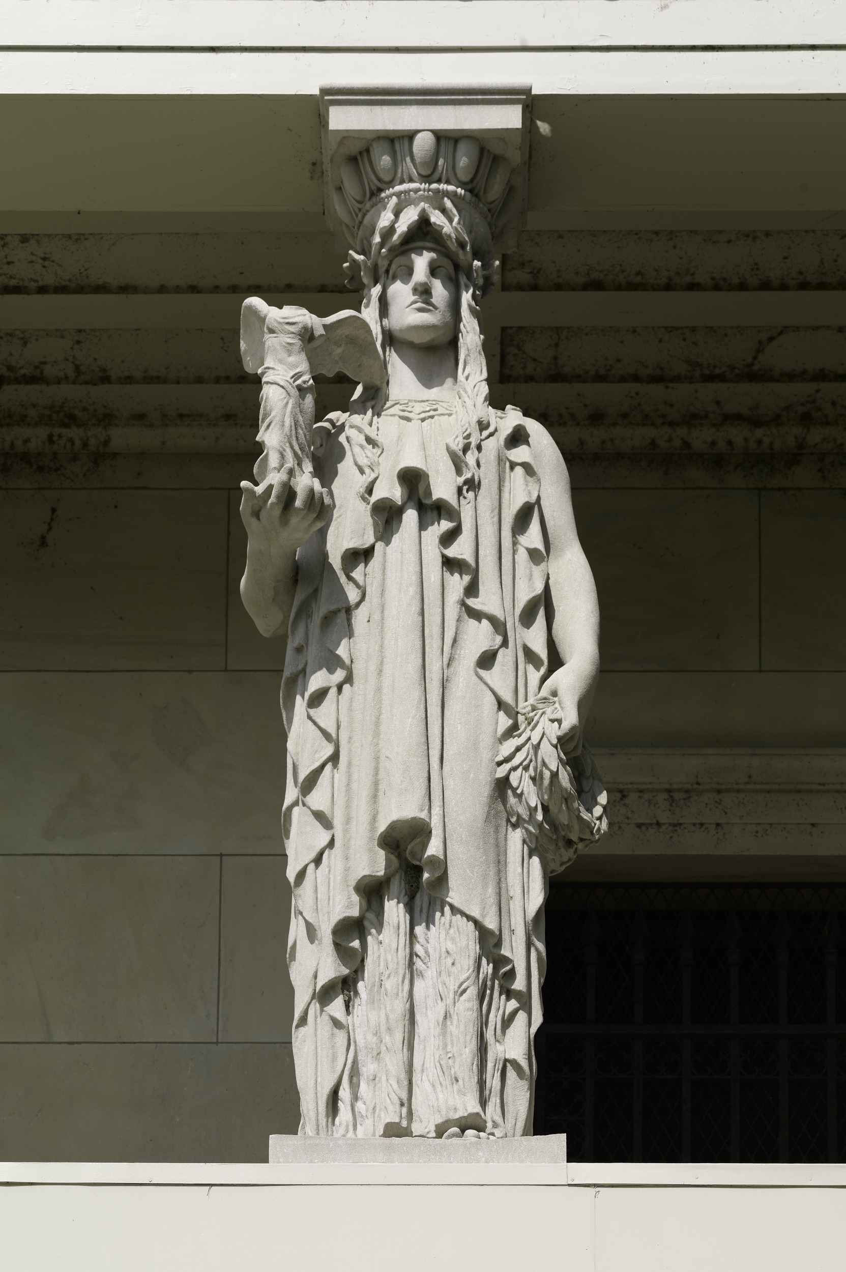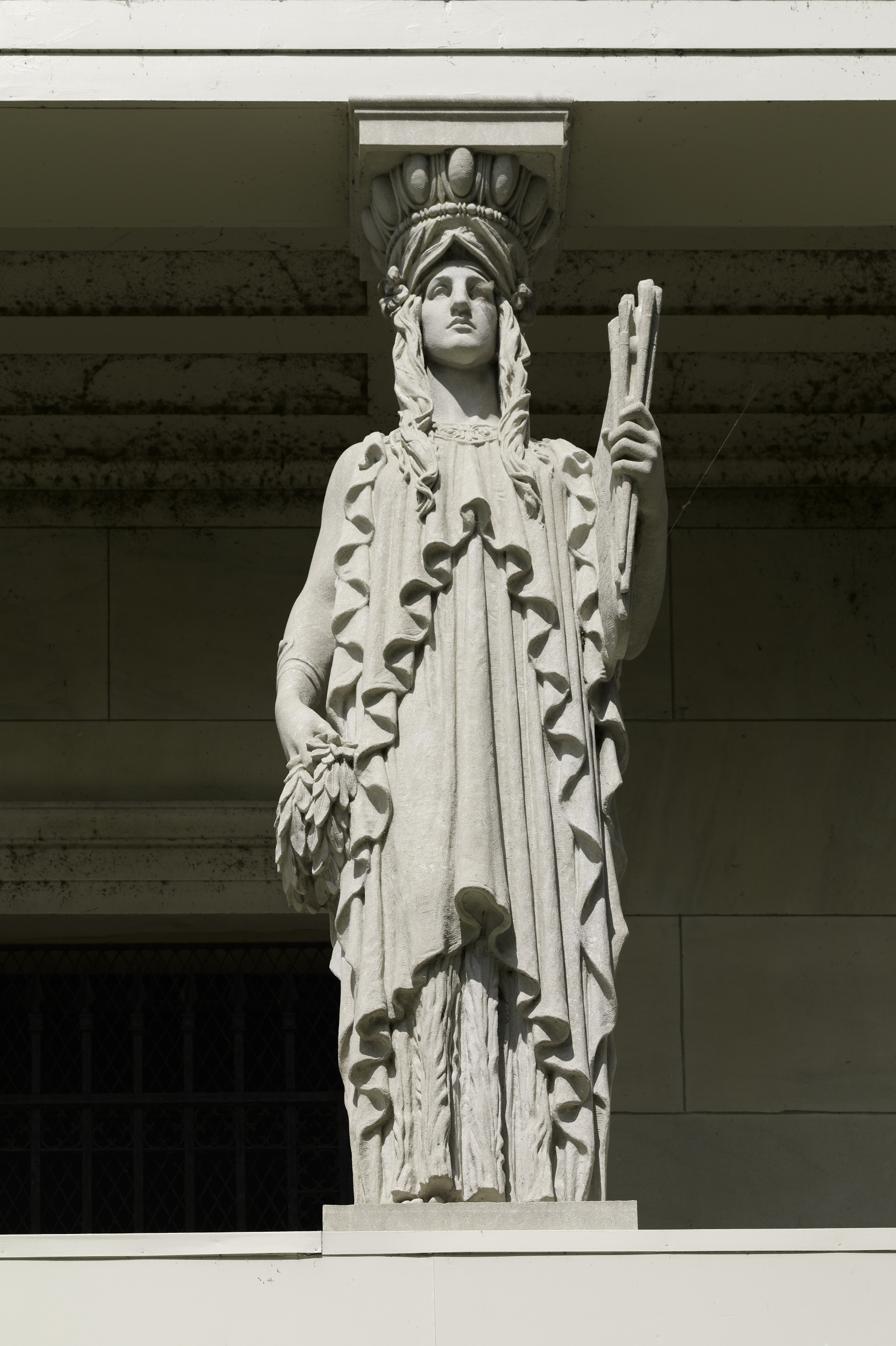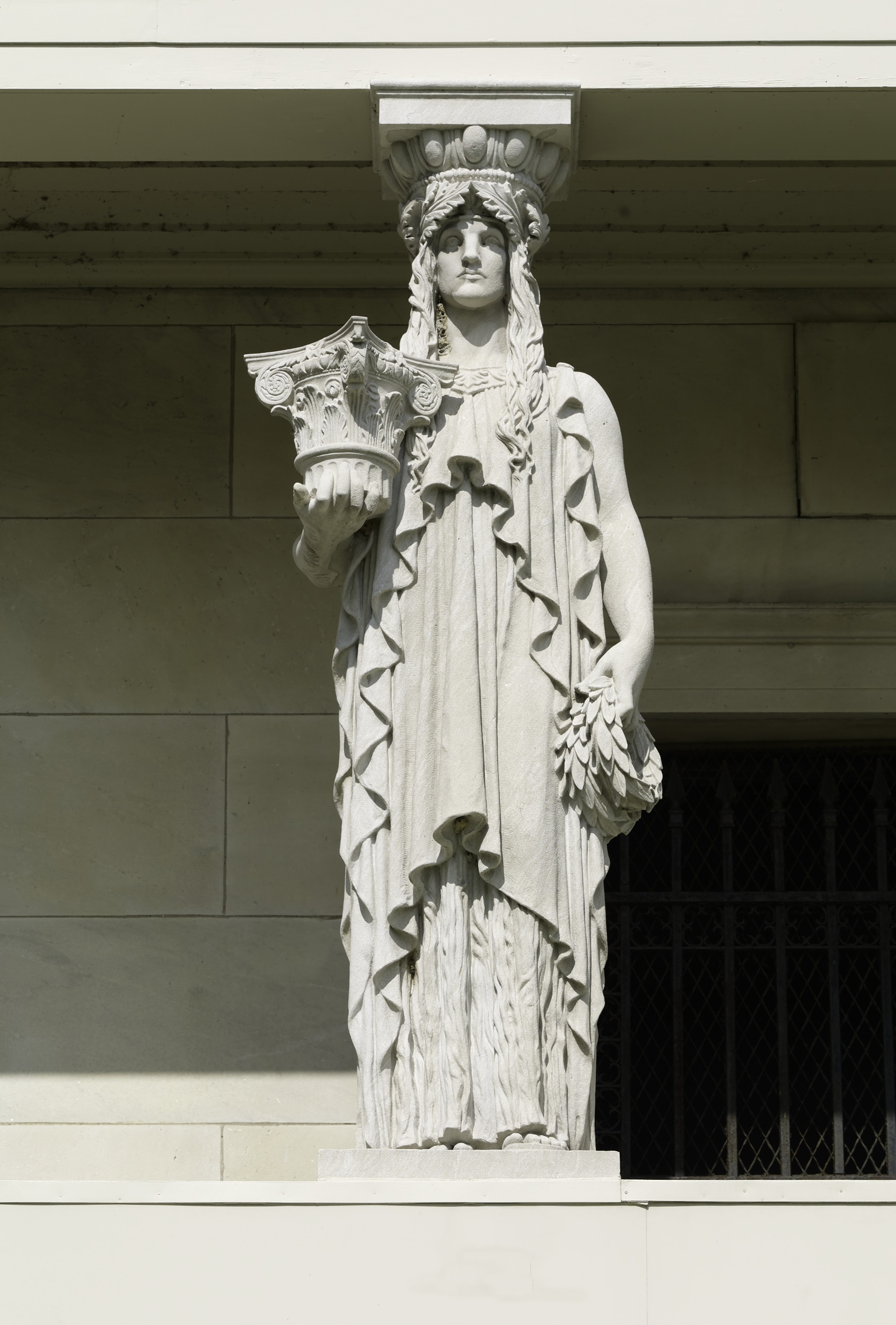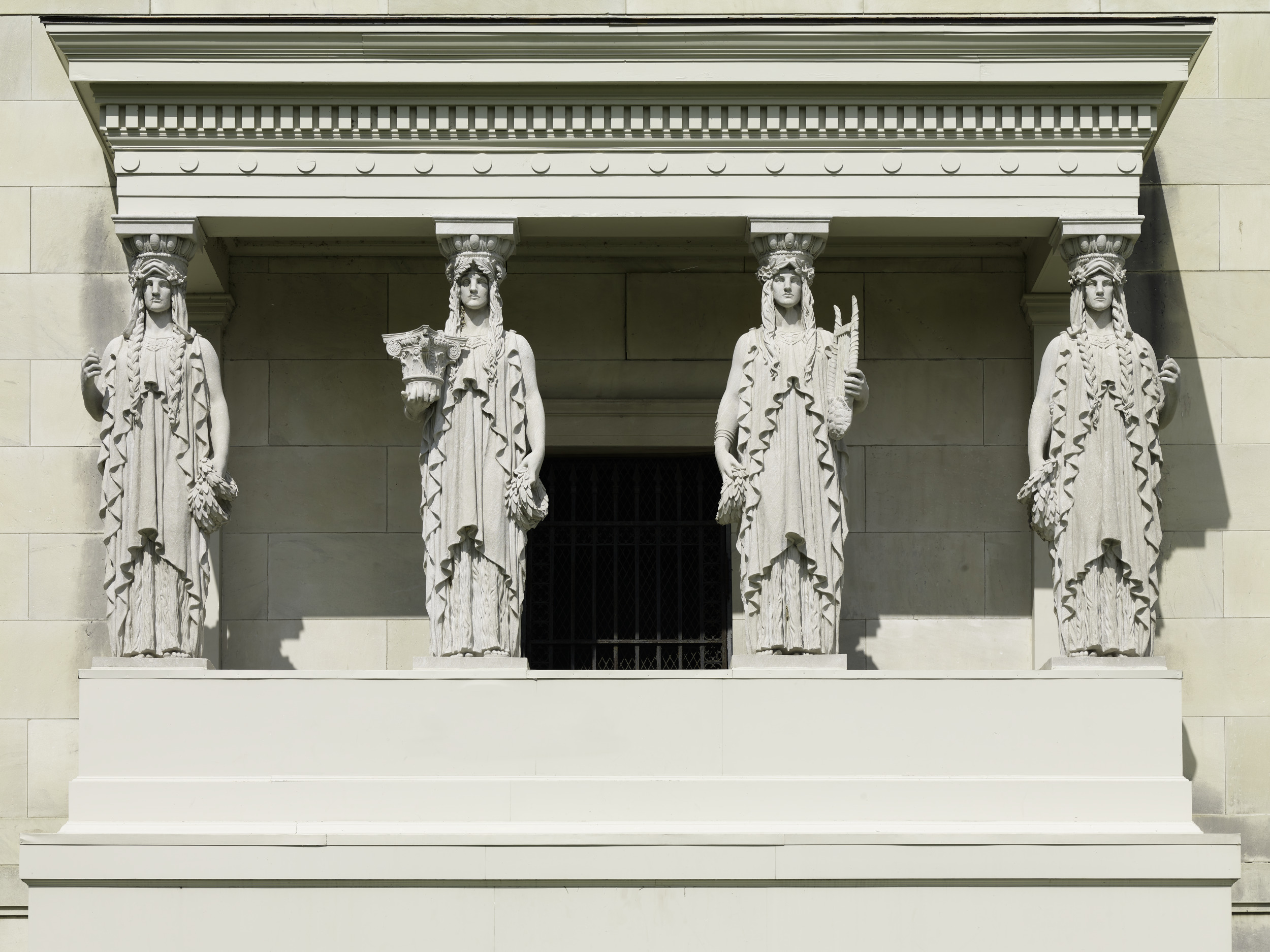 First on view at the museum in 1921 as part of an exhibition of work from the collection of John J. Albright and his wife, Augustus Saint-Gaudens's eight caryatid figures were finally acquisitioned as part of the museum’s collection and installed on the east façade of the 1905 Building in June 1934. Based on similar sculptures supporting porches on the Erechtheum—an ancient Greek temple on the Acropolis at Athens—Saint-Gaudens's versions for the museum represent various branches of the arts, including architecture, music, sculpture, and painting, as well as victory.