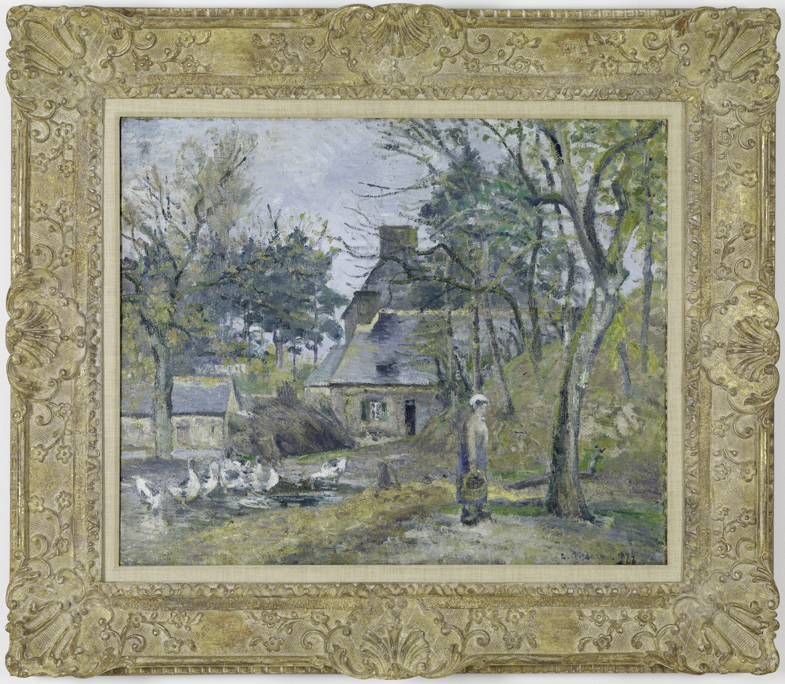 In the 1860s, Camille Pissarro began visiting the farm estate of Ludovic Piette (French, 1826–1877), a close friend and fellow painter, located at Montfoucault on the Mayenne River in eastern Brittany. Pissarro arrived at the farm in the fall of 1874, following the first Impressionist exhibition, hoping to focus on images of “the true countryside.” Along with Farm at Montfoucault, he completed numerous compositions of women engaged in their daily routines there. However, the artist was still struggling to develop his style of Impressionism. In a letter to French writer and critic Théodore Duret (1838–1927), Pissarro wrote, “I haven’t worked badly here. I have been tackling figures and animals. I have several genre pictures. I am rather chary [hesitant] about going in for a branch of art in which first-rate artists have so distinguished themselves. It is a very bold thing to do, and I am afraid of making a complete failure of it.”