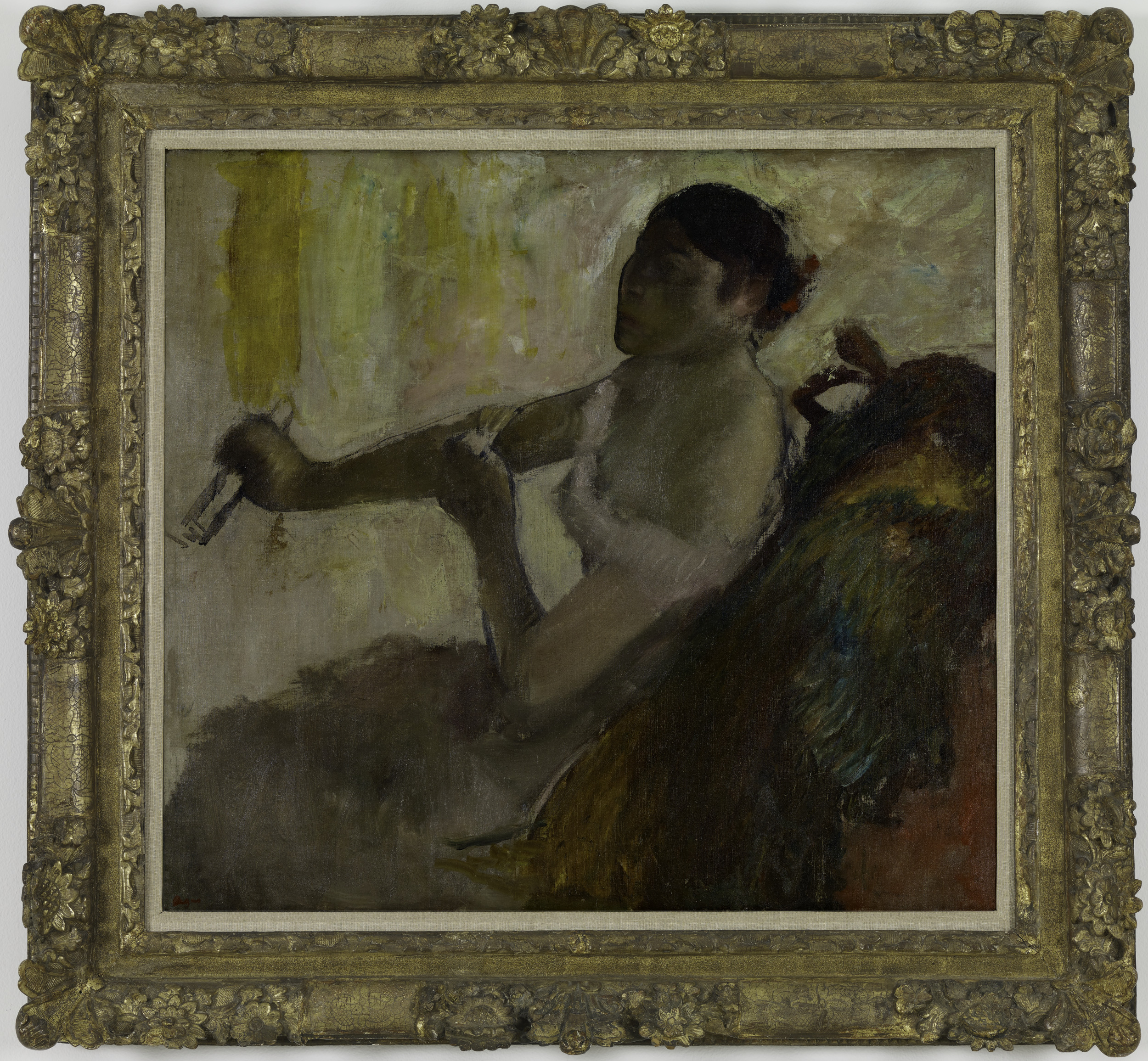 The gesture of a woman pulling on a long glove is the focal point of this portrait by Edgar Degas. Rose Caron (French, 1857–1930) was a famous operatic soprano. Through his extensive social circle and consuming love of the theater, Degas came to know Caron quite well. As evidenced by his abundant depictions of ballet dancers and other stage performers, the movements and physical traits of such individuals fascinated him. This image suggests that Degas was particularly drawn to Caron’s elongated, elegant arms. Here, dark fluid brushstrokes define the contours of her figure, silhouetted against a light background of brilliant reds, blues, yellows, greens, and browns. In this image, the artist positions the viewer as an observer of a typically private scene, possibly backstage.