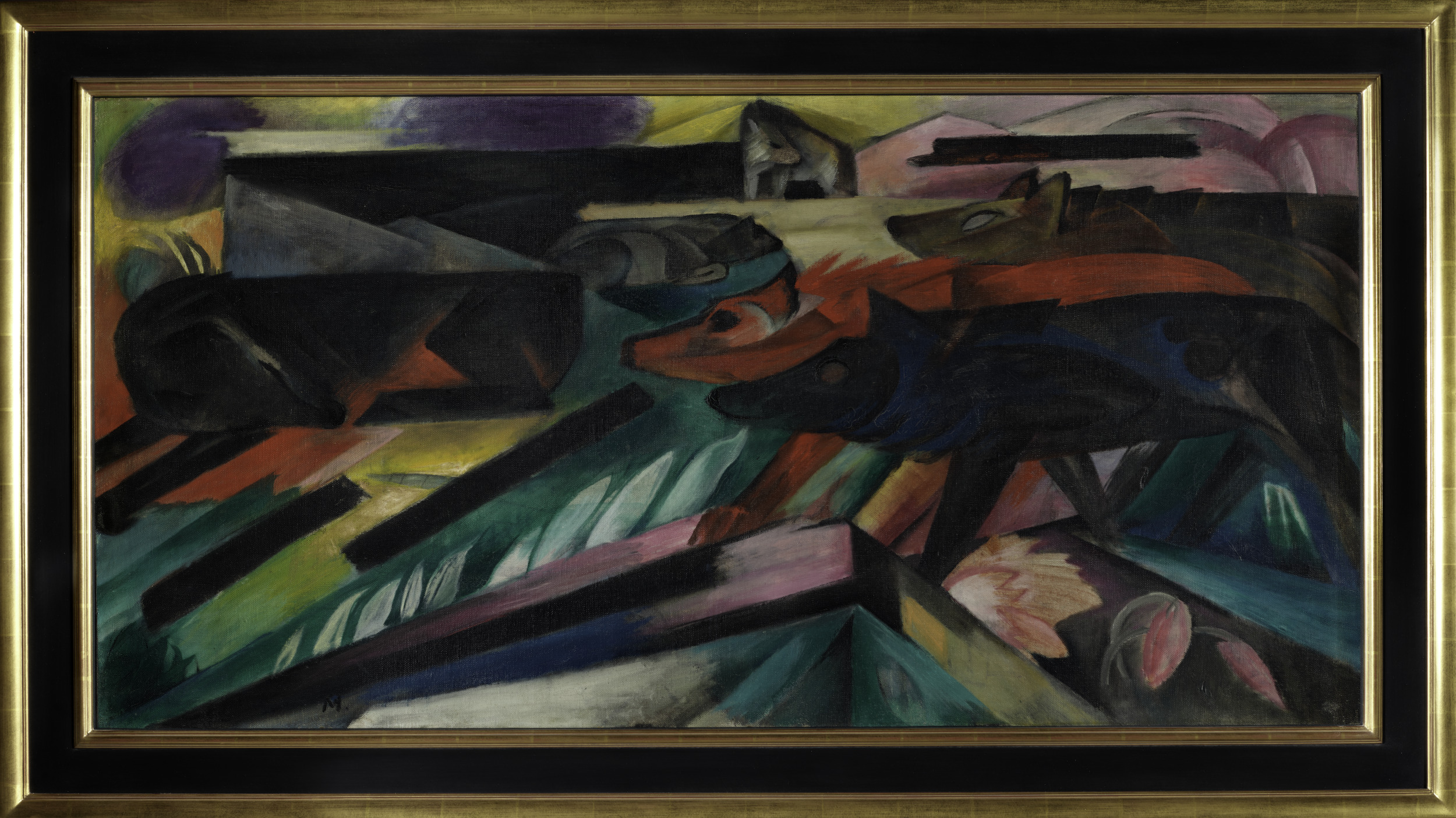 Early in his career, Franz Marc painted lyrical images of graceful horses, cows, and deer living in harmony amid beautiful landscapes. Marc wrote about such works, “I am trying to enhance my sensitiveness for the organic rhythm I feel is in all things . . . the rapture of the flow of Blood in Nature, in the trees, in the animals, in the air.” By 1913, however, Marc’s imagery changed dramatically in response to shifts in world events. The Wolves (Balkan War) is a visual allegory of the 1912 conflict between the Balkan League and Ottoman Empire, which greatly contributed to the start of World War I. Here, Marc depicts the animal kingdom in a moment of violent chaos. Three antagonistic wolves approach from the right, while a fourth, who appears to be lying down, turns to face them. Another in the middle ground appears lifeless, while one in the distance looks menacingly beyond the edge of the painting to something we cannot see. The mountain range, which is made up of diagonal lines and harsh angles in a dark, dramatic color scheme, is also in turmoil. Green flames burn in the foreground, and purple clouds of smoke can be seen in the distance. The only symbol of beauty and peace—the pink flowers in the lower right-hand corner—seem to be wilting and are on the brink of collapse.