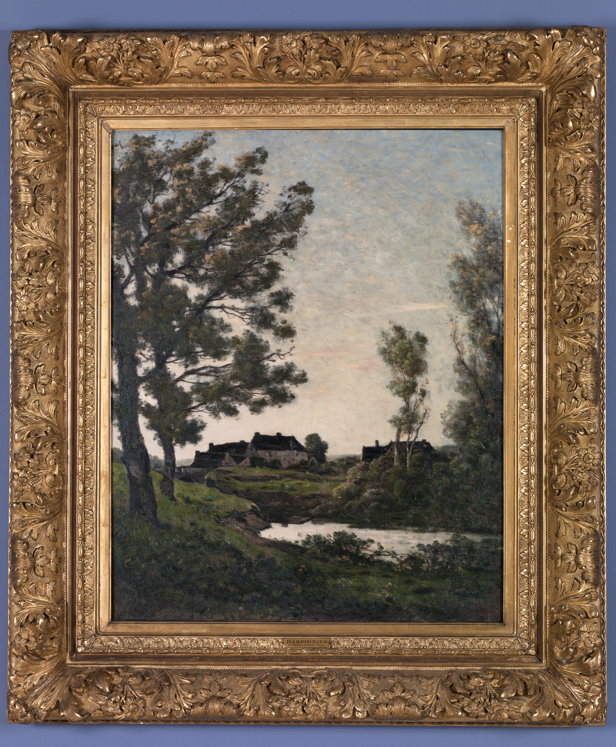 Rivulet at St. Privé (Yonne) depicts a farmstead, most likely near the artist’s home and studio in the Loire Valley. Reminiscent of Corot’s broad, rapid brushwork and monochromatic undertones, it exemplifies the later style of Harpignies’s body of work. This shift in technique, which occurred around the turn of the twentieth century, was prompted, at least in part, by his failing eyesight. Harpignies was forced to focus less on details and more on simply bringing larger shapes into effect. In a work like this one, the luminous colors of his earlier canvases were replaced with an overall silver tonality.