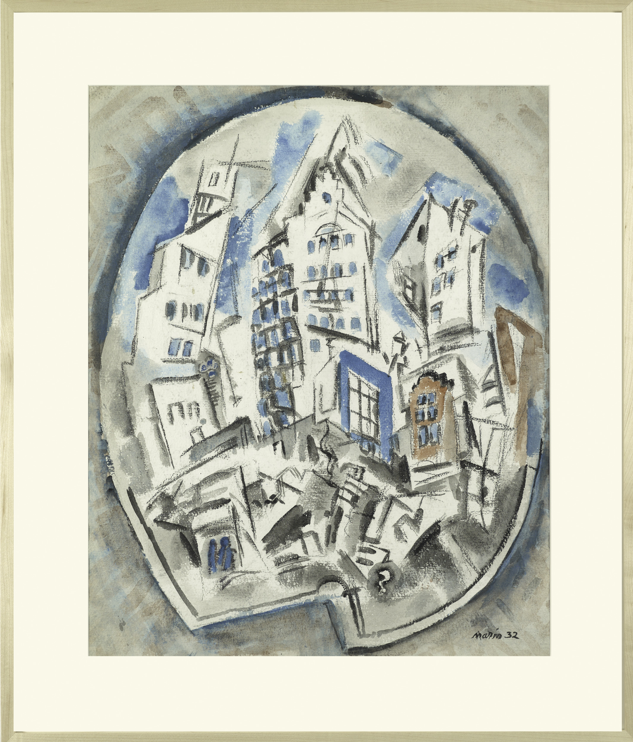 In 1948, a Look magazine poll of art critics and museum directors voted John Marin “America’s Greatest Artist.” Known for his images of land and sea, Marin also turned his attention to the urban landscape, including the new skyscrapers of Lower Manhattan depicted here, framed by an oval shape as if seen through a window. With their vertiginous heights and boxy shapes, skyscrapers were ideal subjects for the dynamic, geometric styles of early twentieth-century art, which influenced Marin early in his career. By rendering the skyscrapers with energetic diagonals and rapidly applied paint, Marin connected them to the excitement of city life. Commenting on these new structures in a 1913 issue of Camera Work, Marin argued that “the whole city is alive; buildings, people, all are alive.” If you look closely, you may notice that the window through which we view these “living” buildings is shaped like an artist’s palette, creating an analogy between the “construction” of cities and of paintings—both of which are part of modern life.