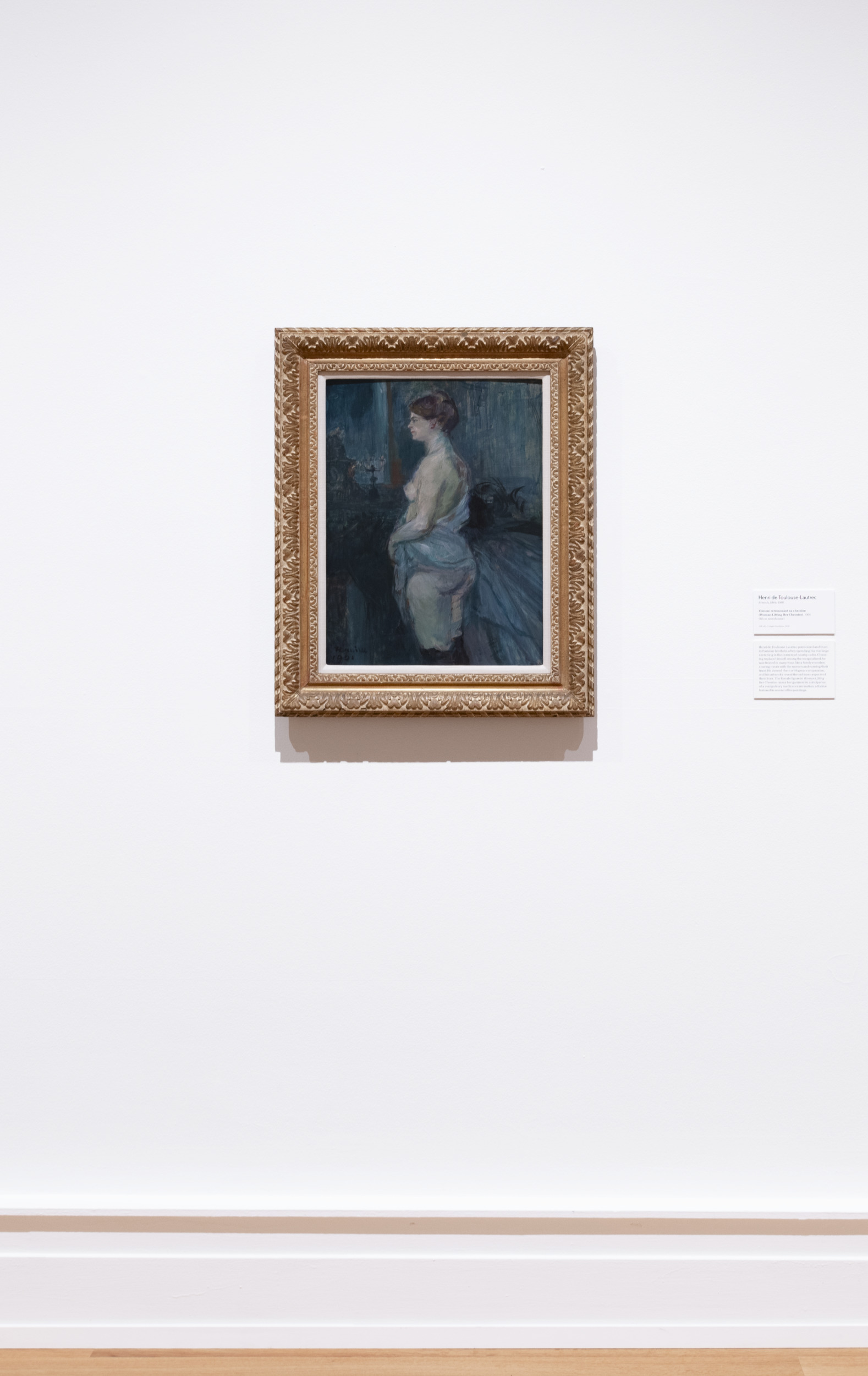 Despite his noble birth, Henri de Toulouse-Lautrec chose to live his life outside polite society. As both a patron and lodger, he moved in and out of brothels, and he often spent his evenings sketching in the corners of Parisian cafés. He found comfort within these walls of wantonness. Choosing to place himself among the marginalized, he was treated in many ways like a family member—sharing meals with the women and earning their trust. Toulouse-Lautrec viewed prostitutes with great compassion, and his artworks reveal the ordinary aspects of their lives. The female figure in Woman Lifting Her Chemise raises her garment in anticipation of a compulsory medical examination, a theme featured in several of his paintings. This work was created when, at the age of 37, Toulouse-Lautrec’s own health had already deteriorated as a result of long-term alcoholism, which prompted, in part, a darkening of his palette and a focus on interior scenes.