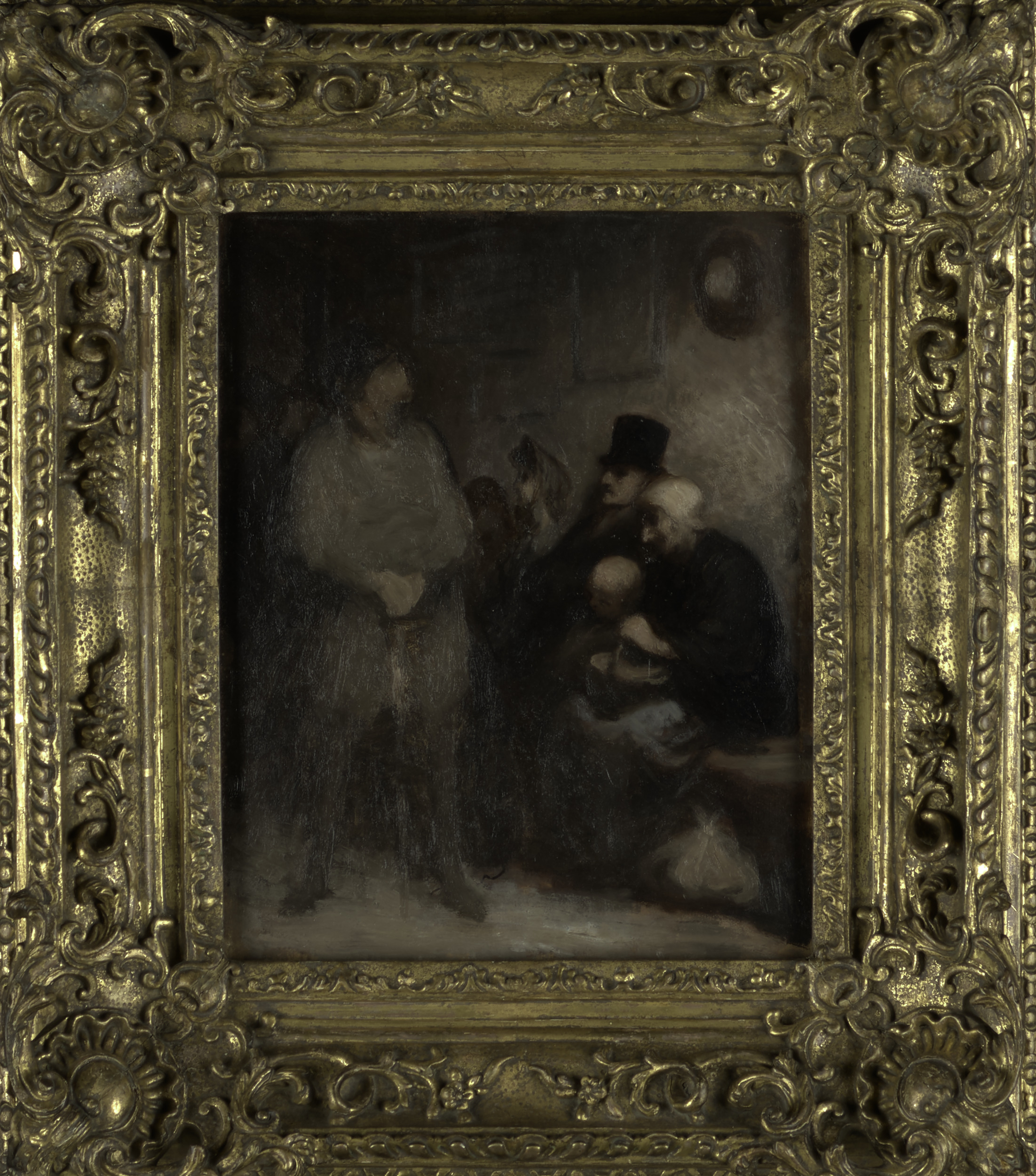 Honoré Daumier was a prolific artist and devout humanist. At a time when France was enmeshed in civic turmoil, Daumier thrived in an underground society of artists who questioned contemporary political and social mores. His strong social conscience led him to create caricatures of corrupt politicians, swindlers, and dubious rascals. However, censorship laws passed in September 1835 forced him to move away from making overtly satirical works. Instead, Daumier began to focus on less controversial subjects. The expansion of the railroads throughout France provided him with numerous opportunities to examine diverse groups of travelers thrown together by chance, especially during his frequent trips to join Jean-Baptiste-Camille Corot and other artists in northern France. Despite its sketch-like appearance, The Waiting Room is actually quite carefully structured. One large, seemingly anxious figure at the left foreground balances the receding row of seated dark figures who wait patiently. Daumier’s meticulous technique of slowly layering pigment and glaze gives his figures a tactile, sculptural quality.