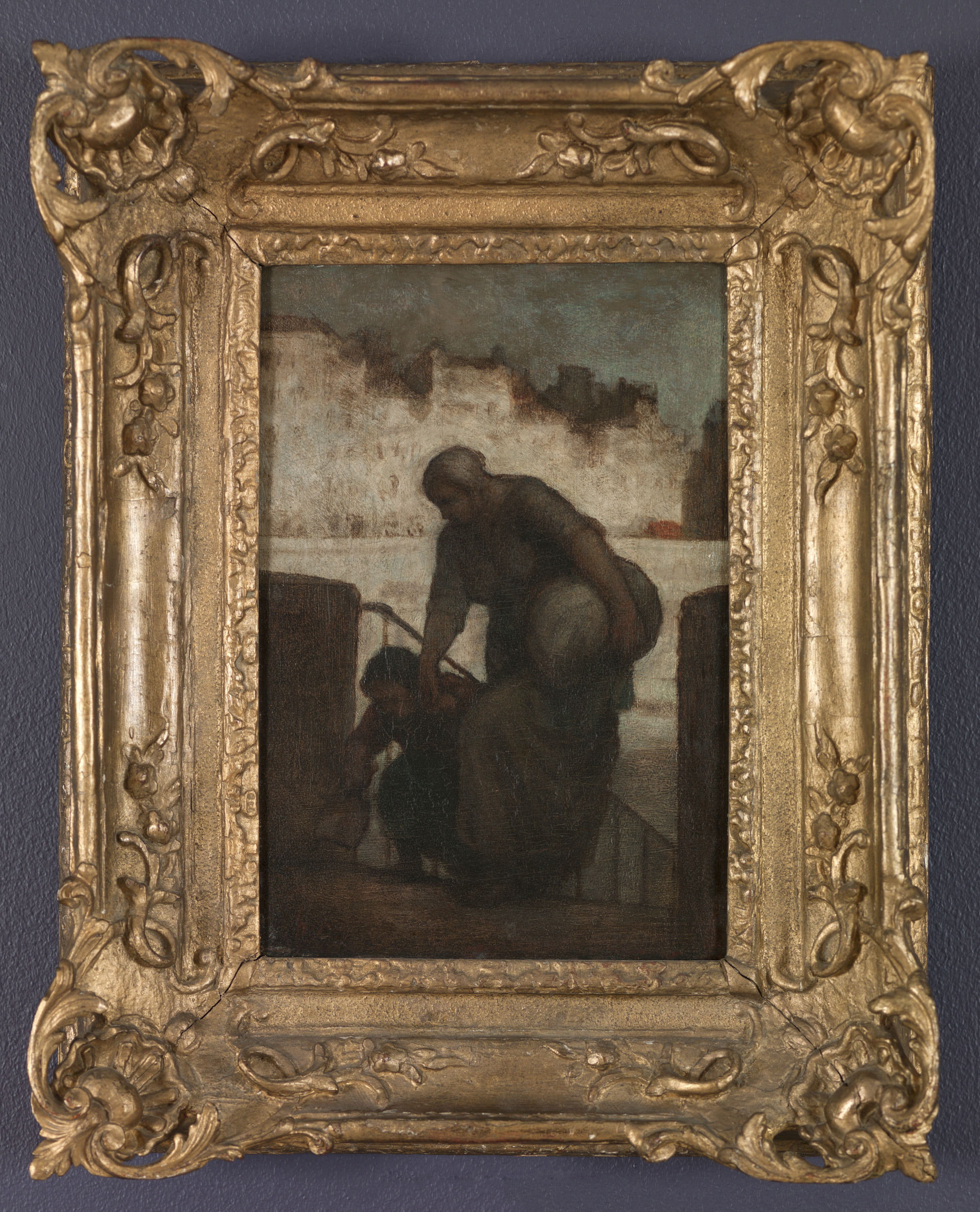 Through light and shadow, Honoré Daumier empathetically responded to the effects of increasing industrialization in the mid-19th century on Parisian daily life. This intimate portrait depicts a scene Daumier would have observed daily from his apartment on the Quai d’Anjou overlooking the Seine river. It is one of three closely related compositions by the artist in which washerwomen, walking up bundles from the laundry boats along the docks, are seen at the top of the stairs from varying vantage points. The act of washing, however, is never depicted. Instead, Daumier focuses on the weight of their heavy burdens. Laundress on the Quai d’Anjou is a sympathetic portrayal of a dreary and difficult existence, which the artist symbolically contrasted with the more privileged life of the people living in the bright, large houses along the opposite side of the river. The child who accompanies the laundress holds a wooden laundry spoon, implying that the mother’s tasks will likely be continued by the next generation.