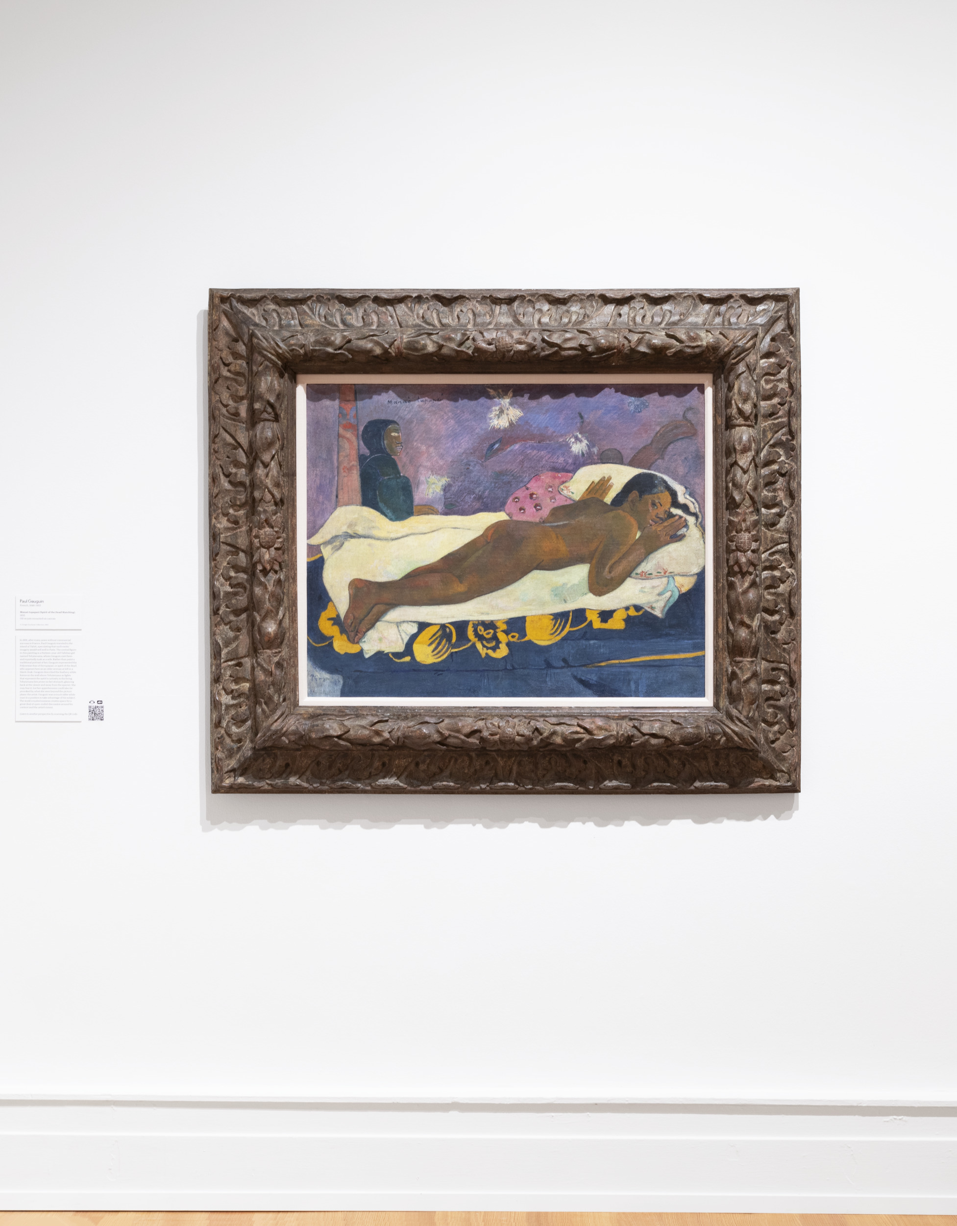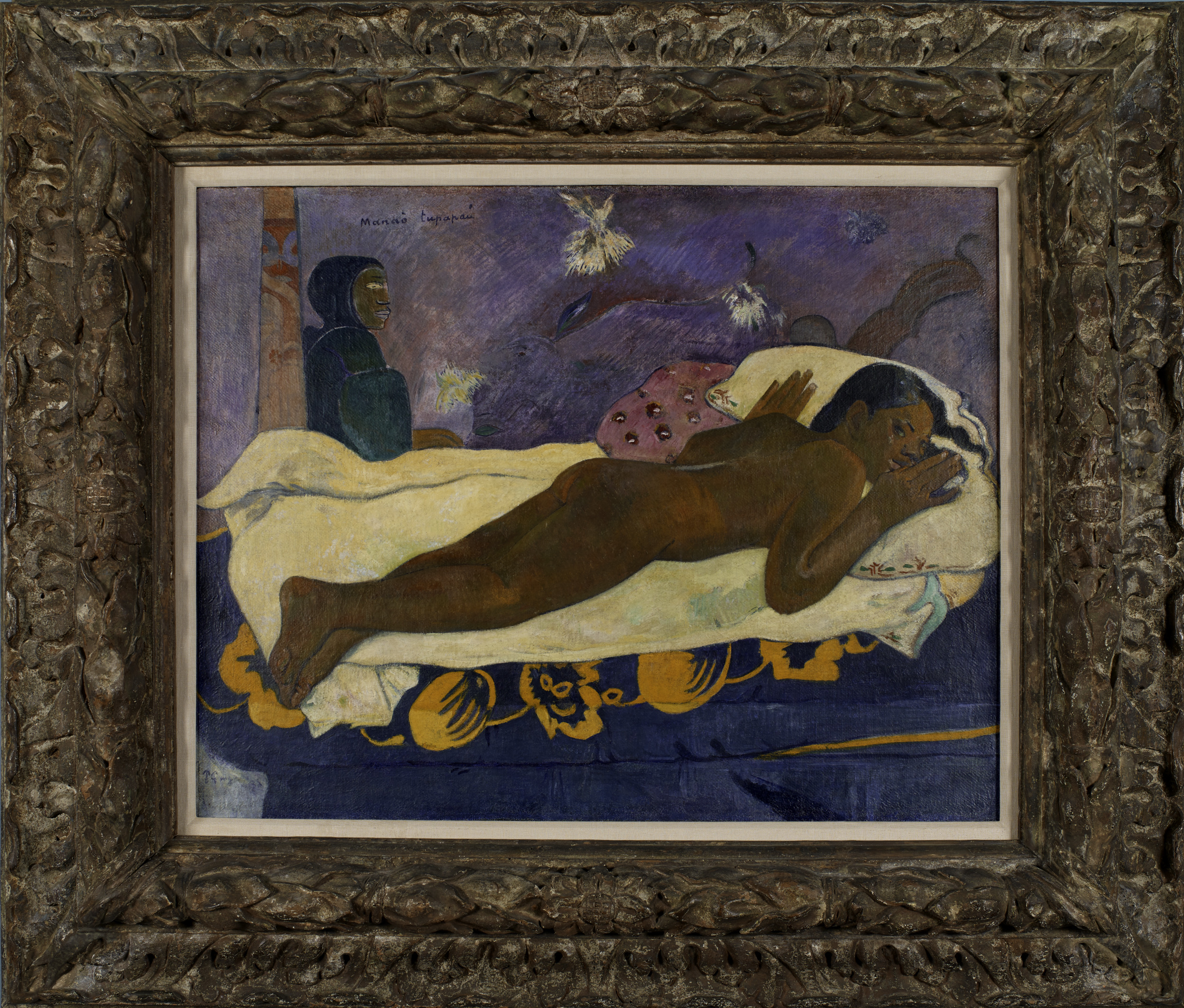 From this description, one might ascertain that the girl, who, according to Gauguin, was just thirteen years old at the time, is afraid of the specter. The artist later described their relationship as representing a series of dualities, including “youth and old age, light and darkness, and life and death.” Alternatively, could her apprehension be provoked by what she sees beyond the picture plane? During his time in Tahiti, Gauguin assumed the role not only of an artist framing and executing compositions, often projecting his own primitivist preconceptions in doing so, but also of a much older man who was in a position to take advantage of his subject. The work’s mysteriousness creates space for a great deal of open-ended discussion around its content as well as the artist’s intent.