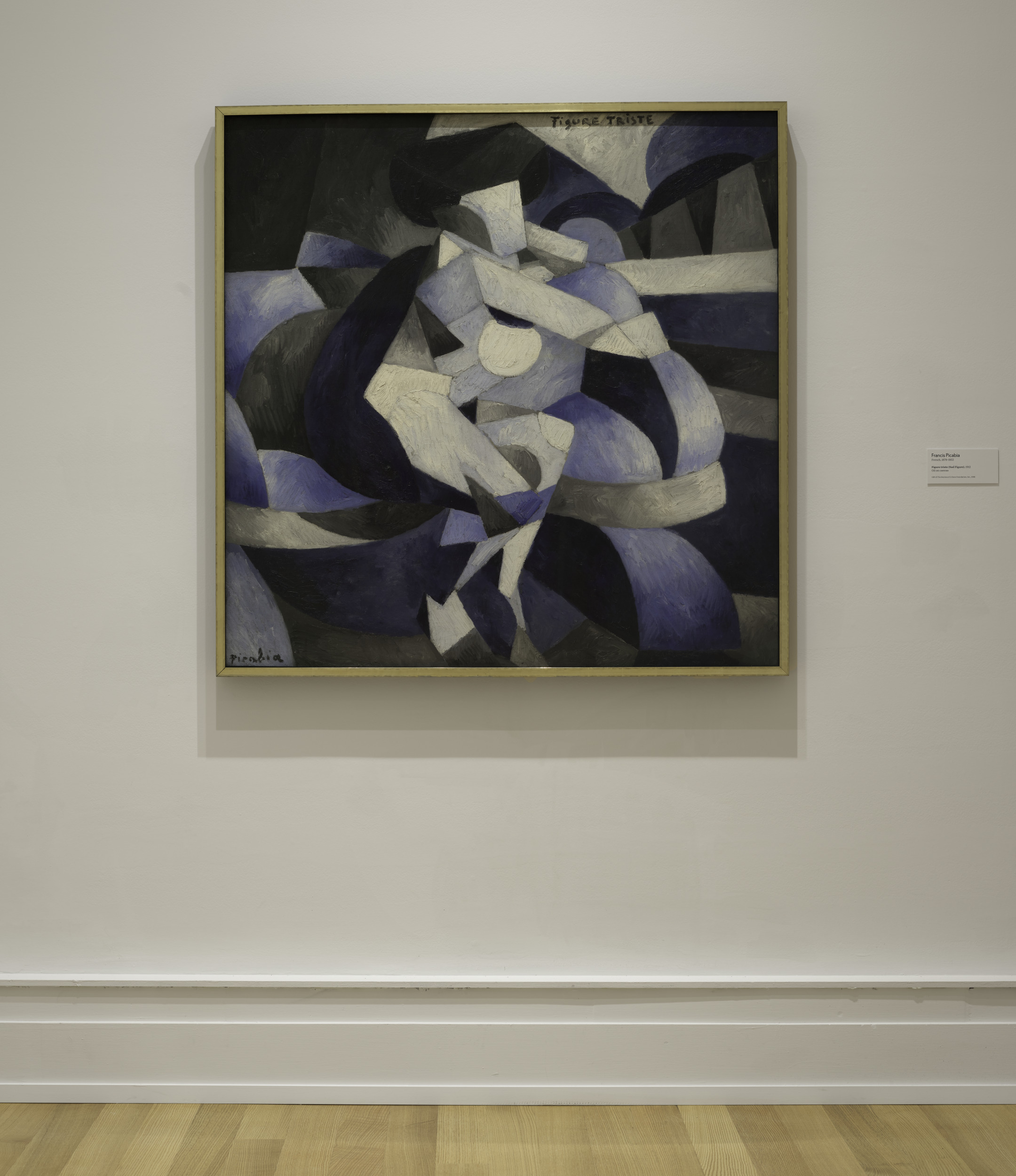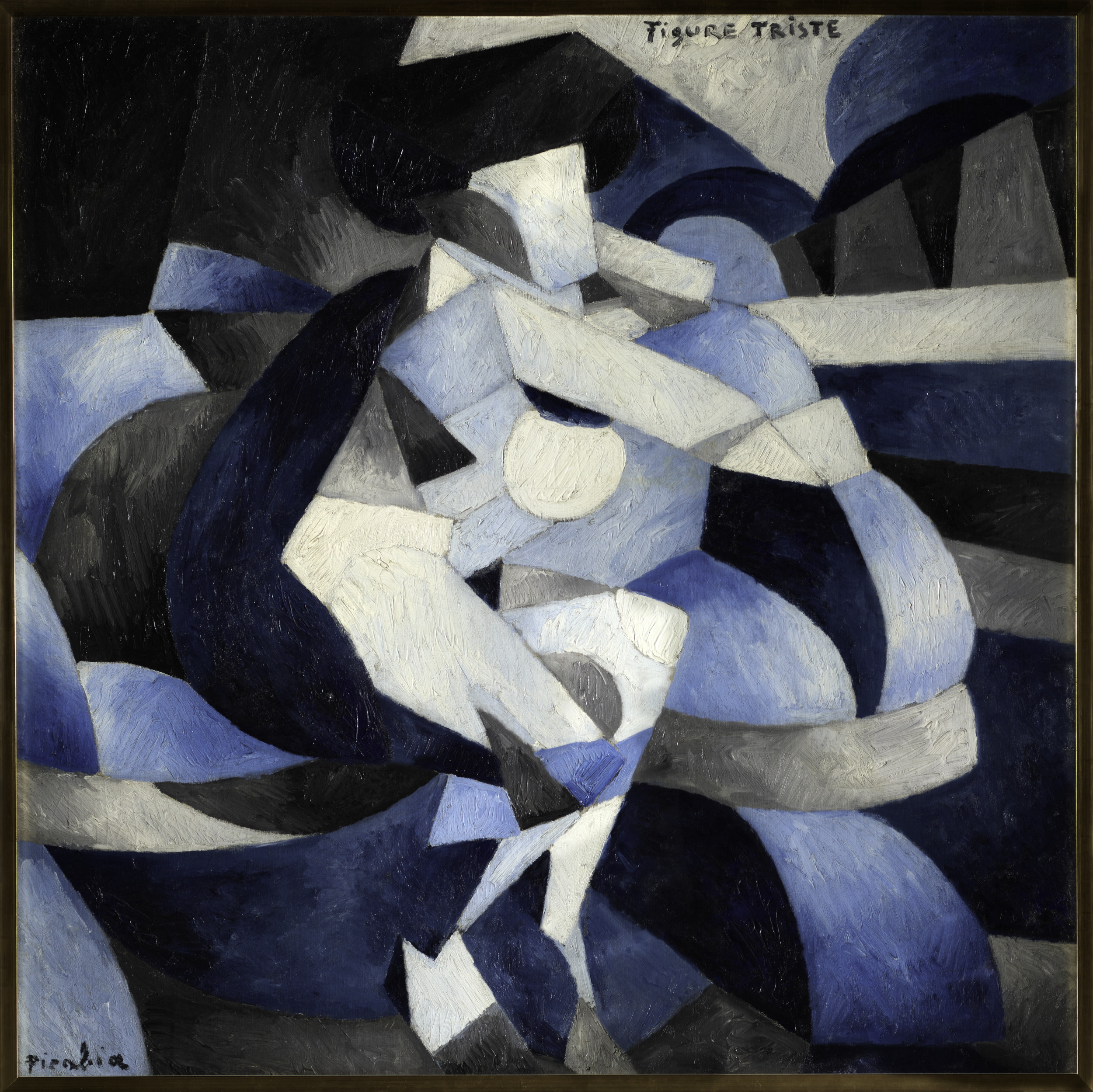 In early 1911, Francis Picabia was creating colorful and expressive paintings in a Fauvist manner, but by the end of the year, he had developed a fragmented, planar approach in response to Cubism. Here, Picabia chose a somber palette: black, grey, and white paired with a cold blue, a hue that is traditionally associated with feelings of unhappiness. Within the abstracted composition, we can perceive a small seated figure in profile with its knees slightly drawn up, right arm extended, and its head leaning to the side supported by a bent left arm. Such body language conveys despondency and is reminiscent of earlier representations of Melancholy in art. This small figure appears, in turn, to be surrounded by the embrace of another, larger figure. Picabia, whose own mother died when he was just seven years old, may be depicting a scene of maternal comfort or grief.