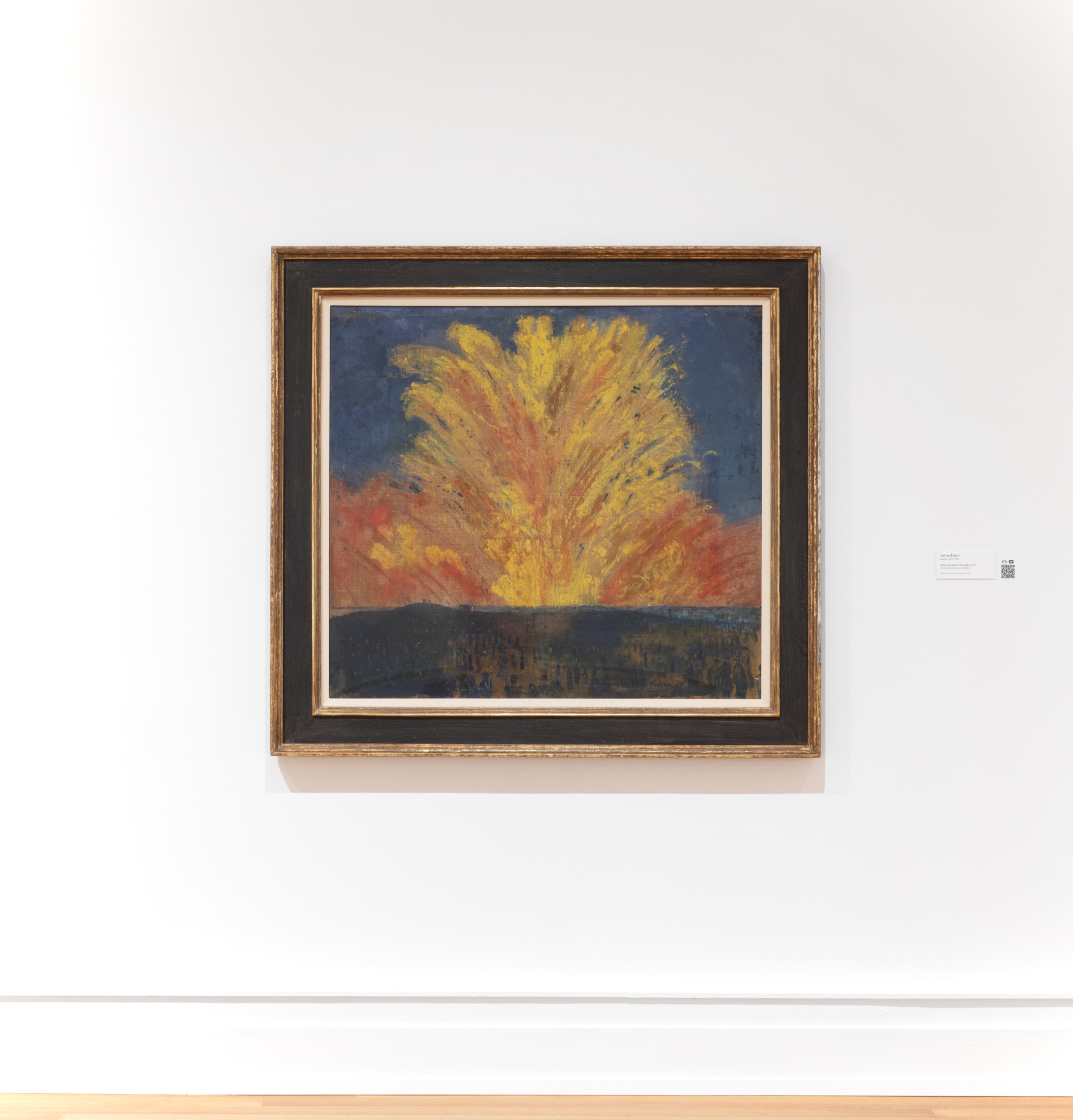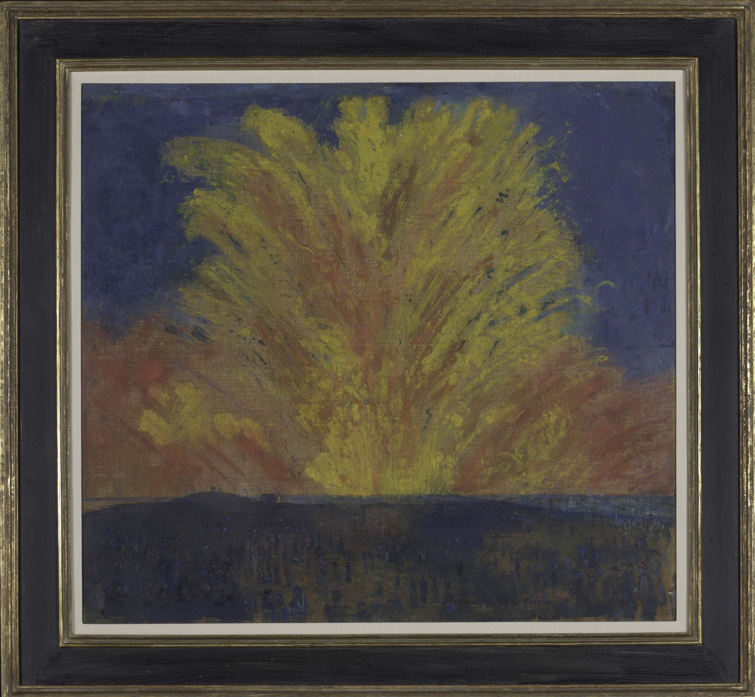 In 1884, James Ensor began creating highly personal works centered on satirical themes that were often rejected from inclusion in exhibitions. In this work, he depicts a wide, slightly rolling landscape in which many vaguely defined small figures stroll about as if enjoying a leisurely outing. In the distance, an enormous explosion of fireworks bursts against a sky of intense blue. Fireworks is representative of Ensor’s middle period, during which he developed menacing themes in seemingly simple compositions. Here, the intensity and scale of the explosion on the horizon—rendered in bright hues of orange, red, and yellow—create a sense of both calm and catastrophe. This visual ambiguity is commonly found throughout Ensor’s body of work, reflecting his ongoing desire to merge the fantastic and the real. Such scenes also reference the apocalyptic landscapes of early 19th–century British Romantic painters J. M. W. Turner and John Martin (1789–1854). Ensor’s slow building of pigment and encaustic, a thick wax medium, resulted in a surface laden with heavy impasto, yet also a high degree of gritty translucency.
