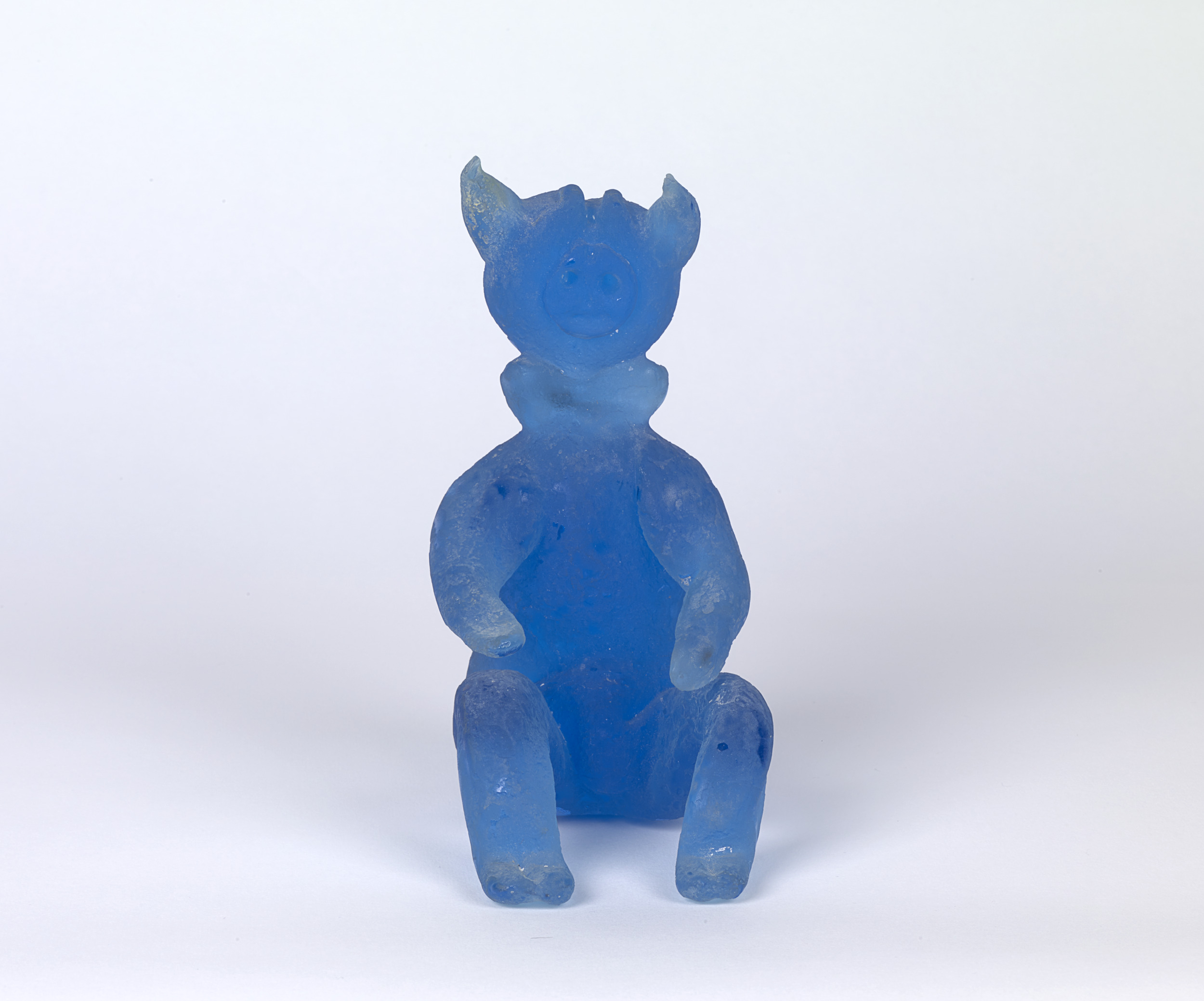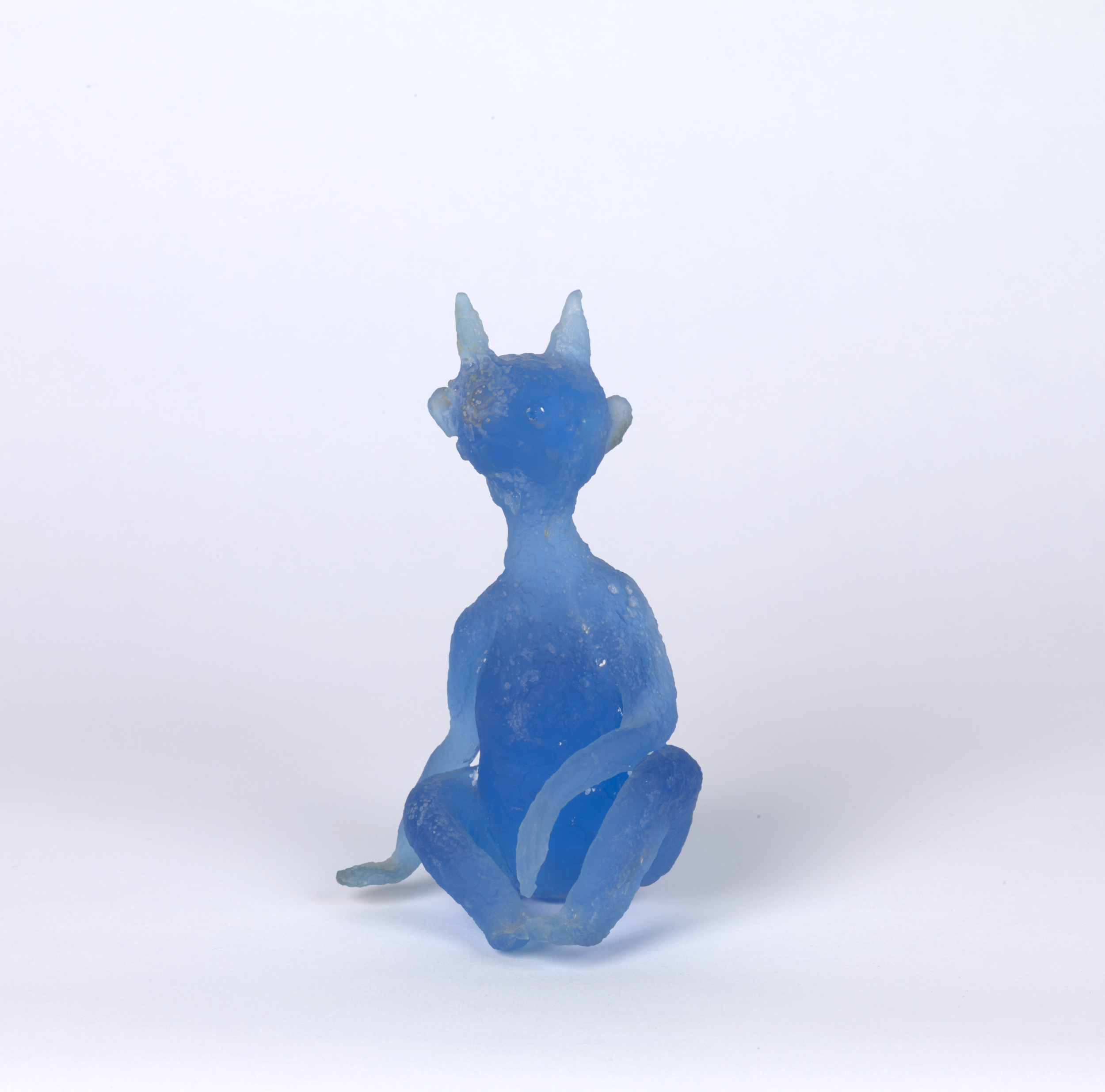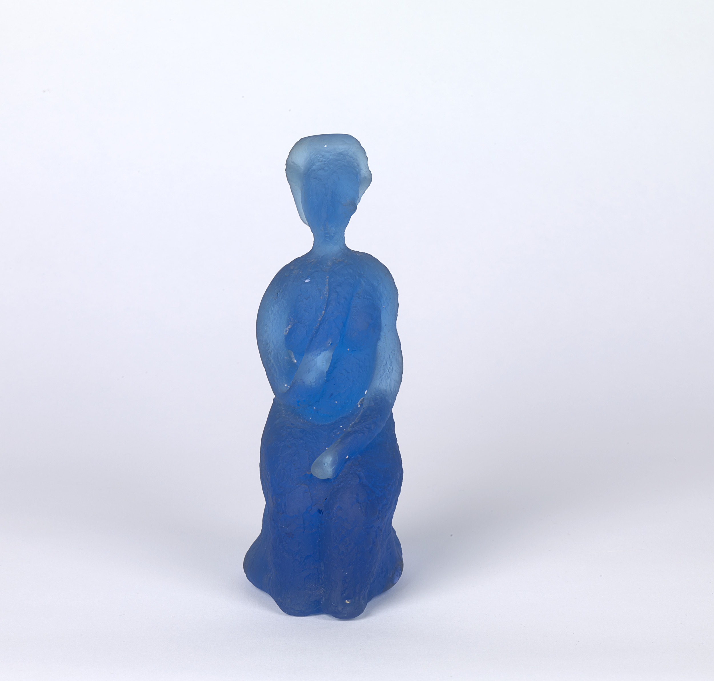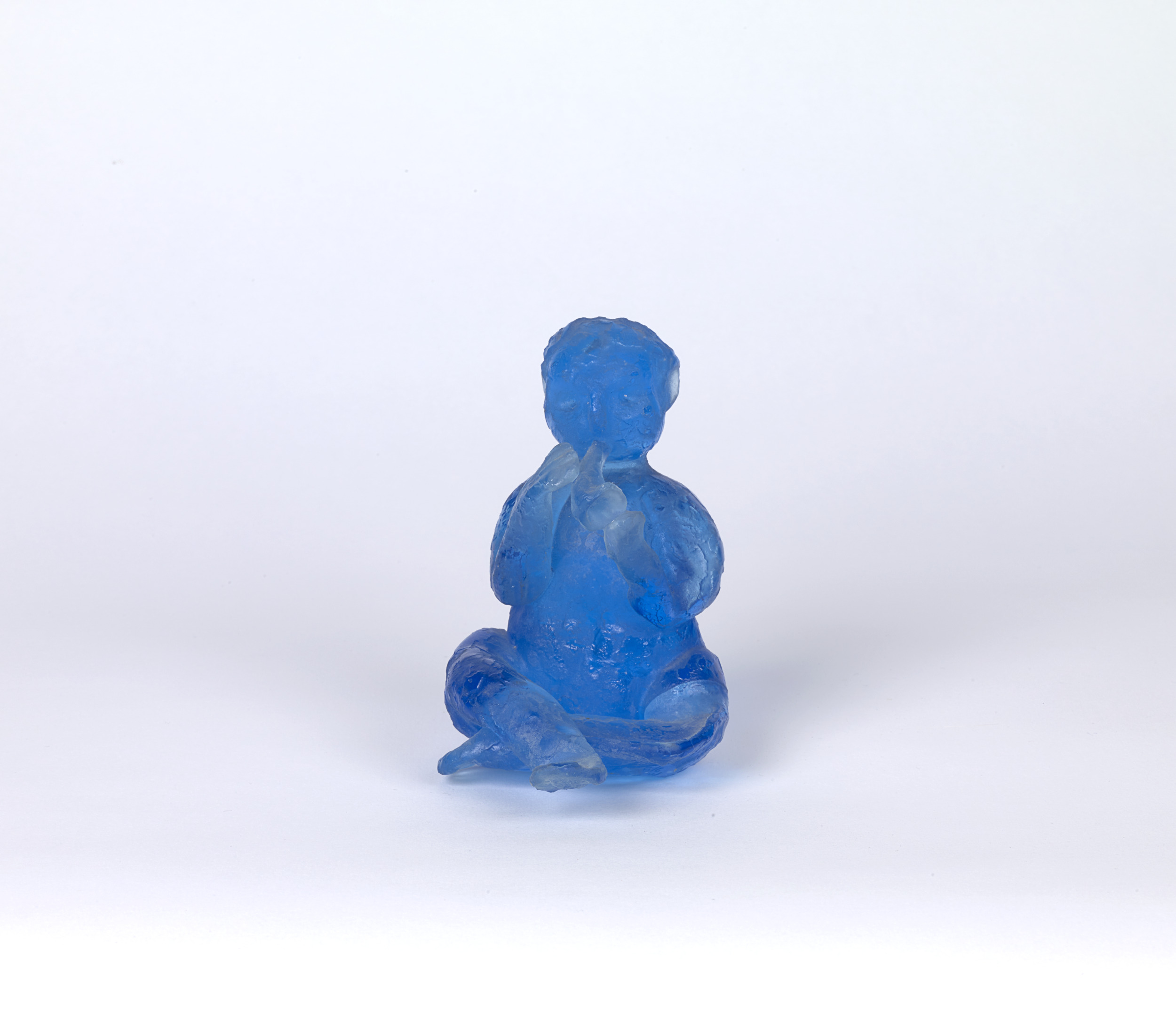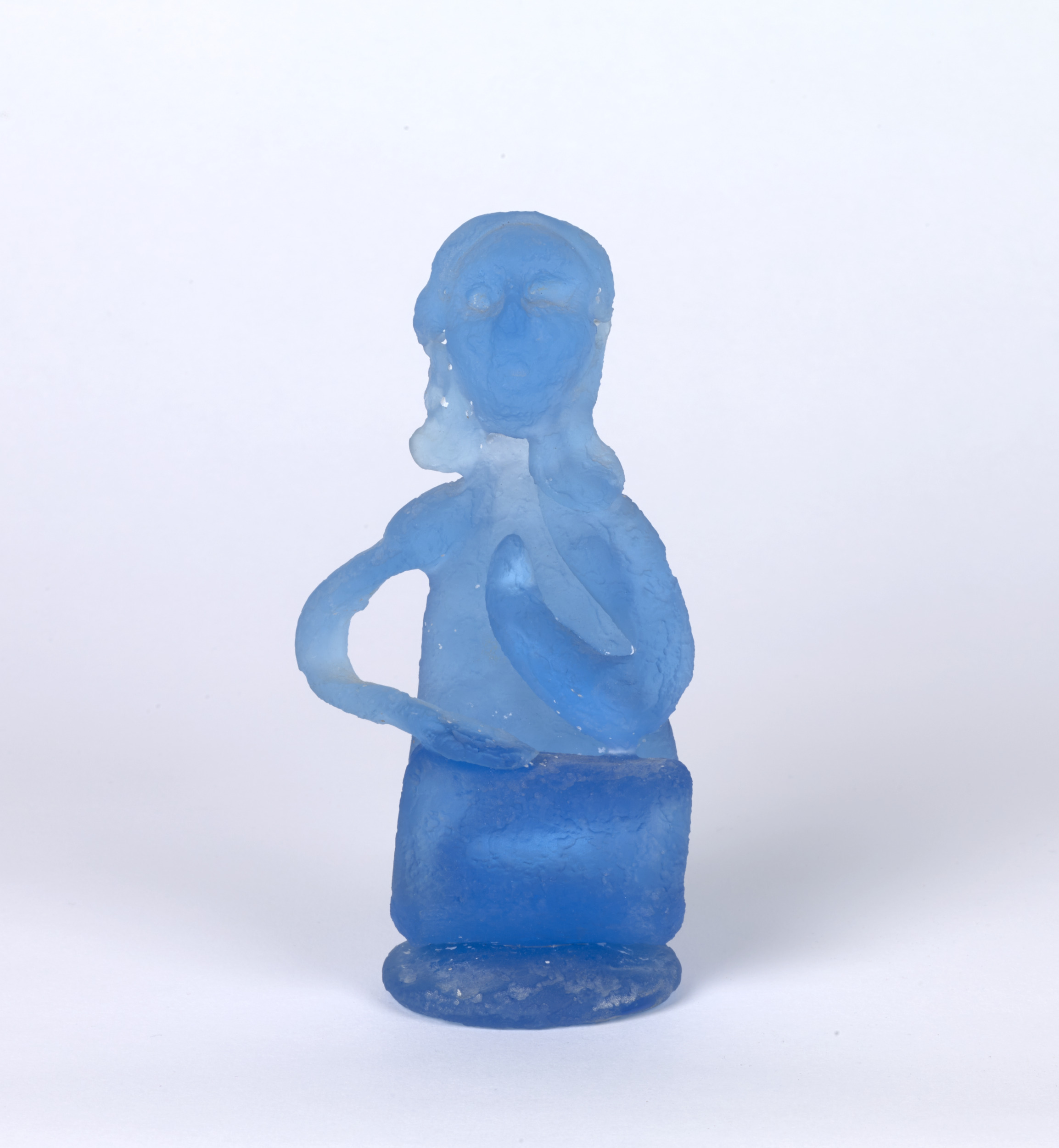 Mythological creatures appear throughout Pablo Picasso’s body of work, and in the mid-1940s he created a series of fourteen small clay sculptures depicting nymphs and satyrs sitting, standing, and playing instruments. The works were then cast in bronze and, later, made in ceramic. In the mid-1960s, he revisited the motif and transposed the playful figures into cast blue glass in collaboration with master glassmaker Egidio Costantini (Italian, 1912–2007). Picasso was attracted to these characters’ playfulness, and they served as poignant symbols within his personal iconography. One of the satyr figures here is said to be a self-portrait of the artist.