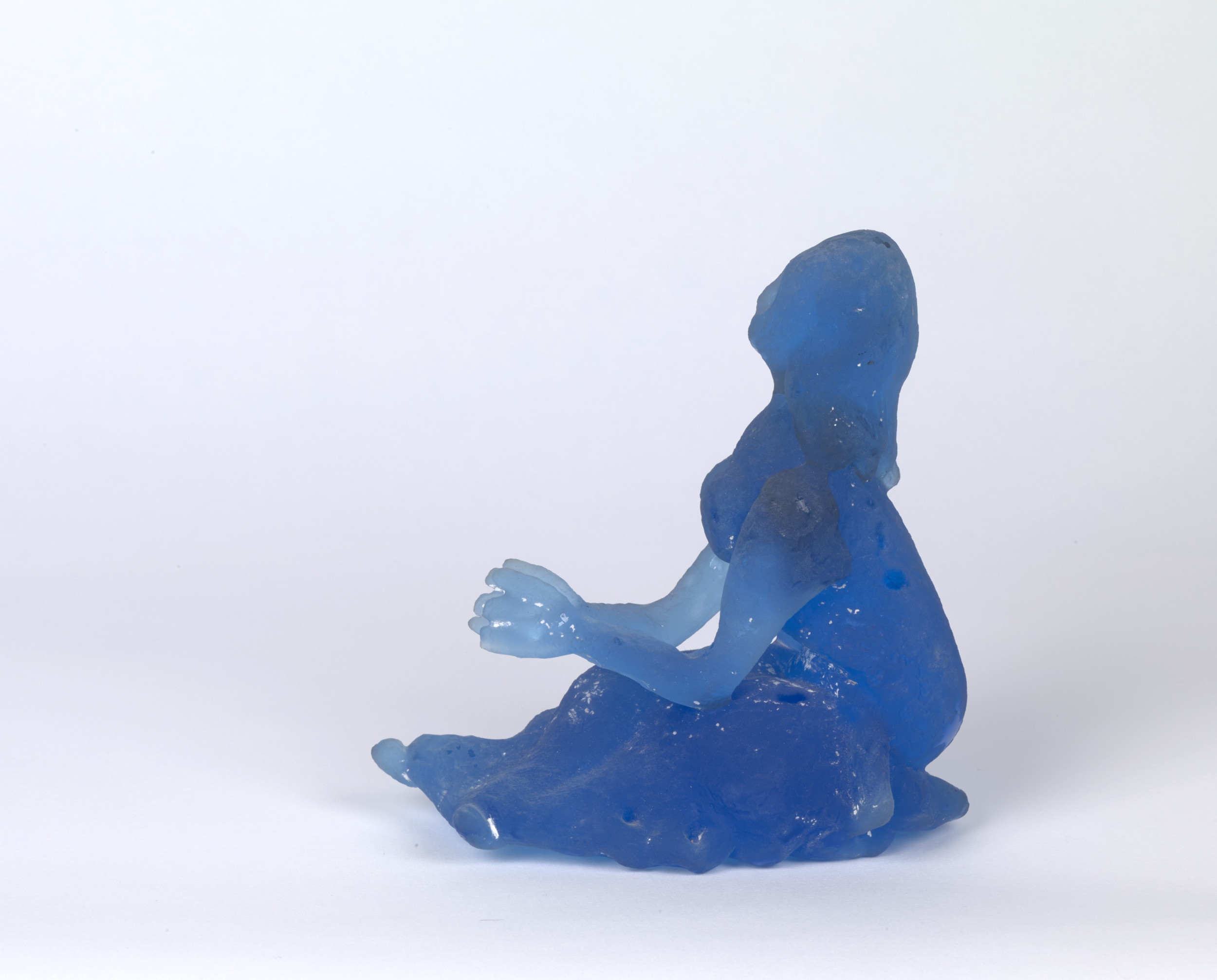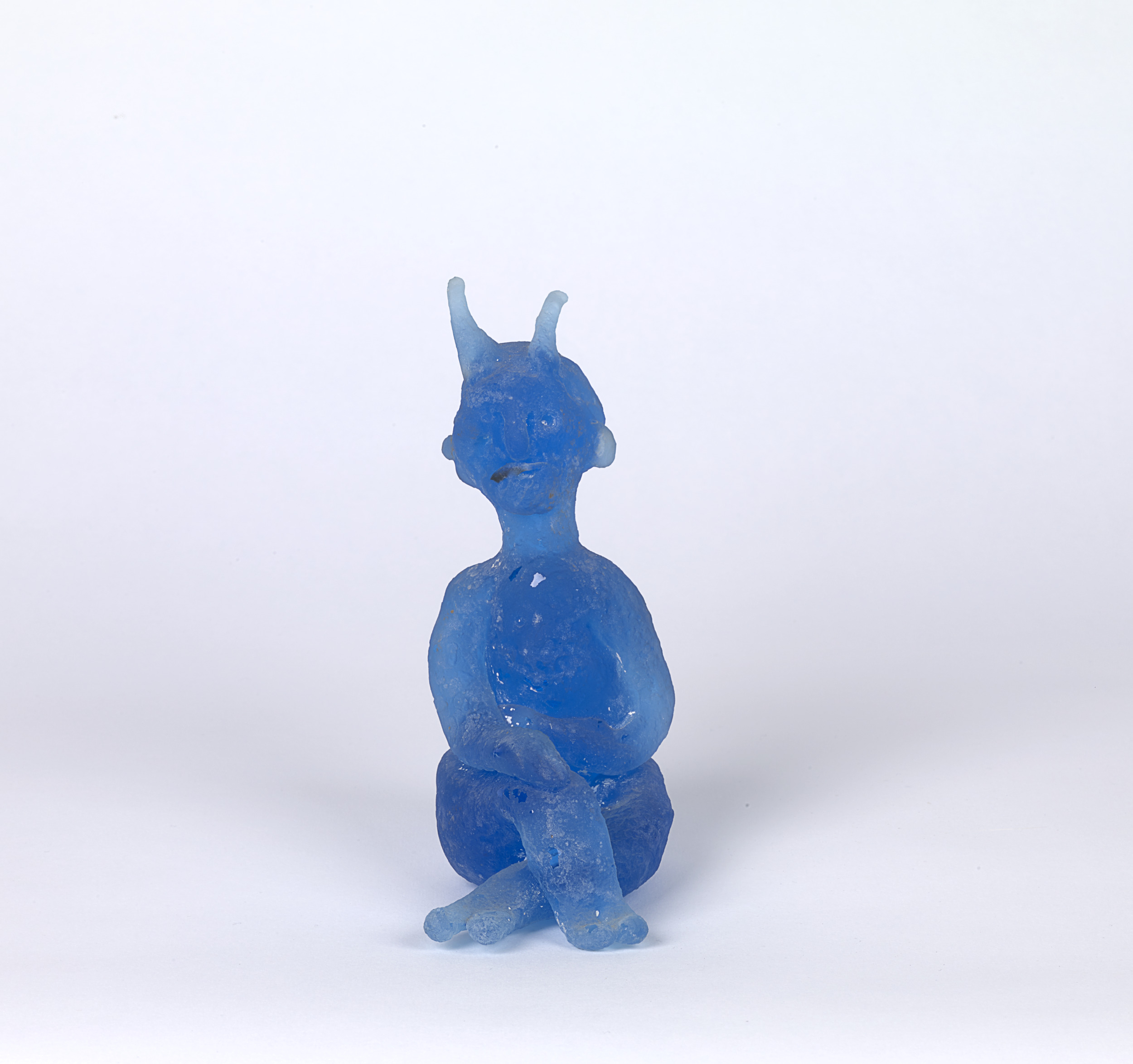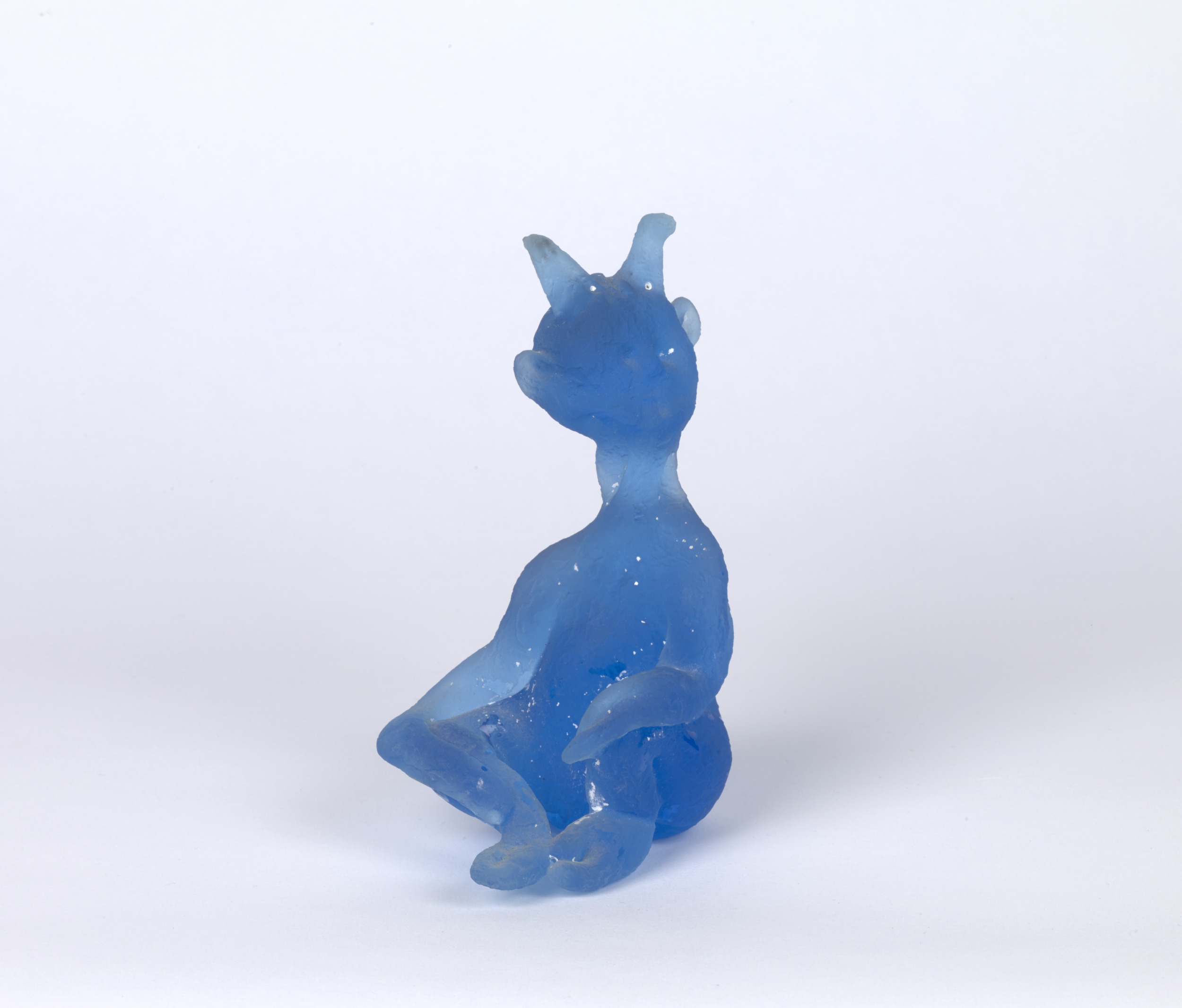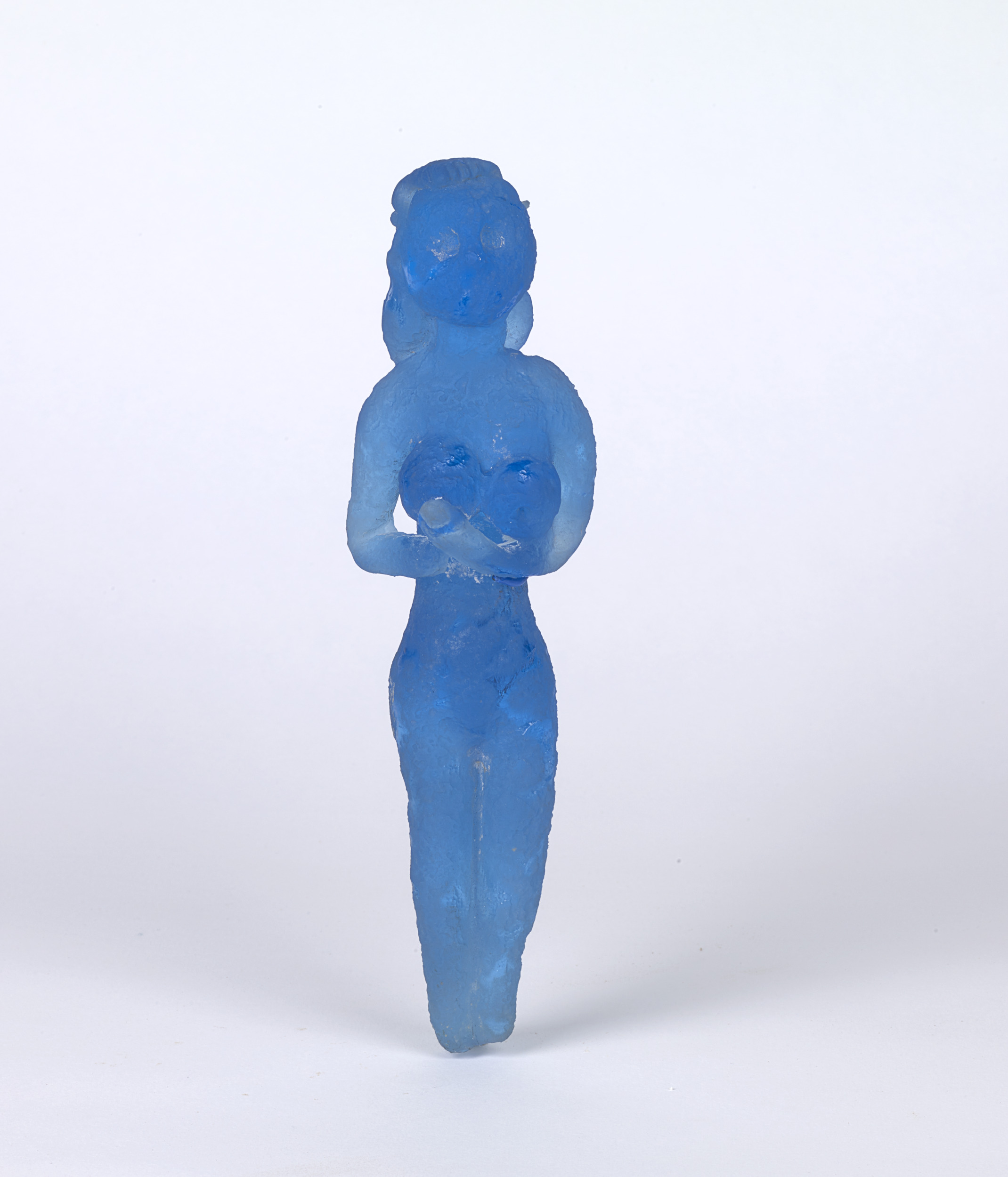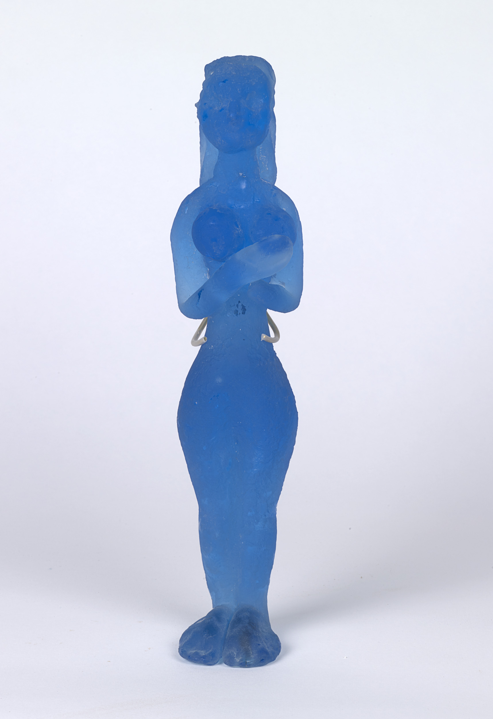 Mythological creatures appear throughout Pablo Picasso’s body of work, and in the mid-1940s he created a series of fourteen small clay sculptures depicting nymphs and satyrs sitting, standing, and playing instruments. The works were then cast in bronze and, later, made in ceramic. In the mid-1960s, he revisited the motif and transposed the playful figures into cast blue glass in collaboration with master glassmaker Egidio Costantini (Italian, 1912–2007). Picasso was attracted to these characters’ playfulness, and they served as poignant symbols within his personal iconography. One of the satyr figures here is said to be a self-portrait of the artist.