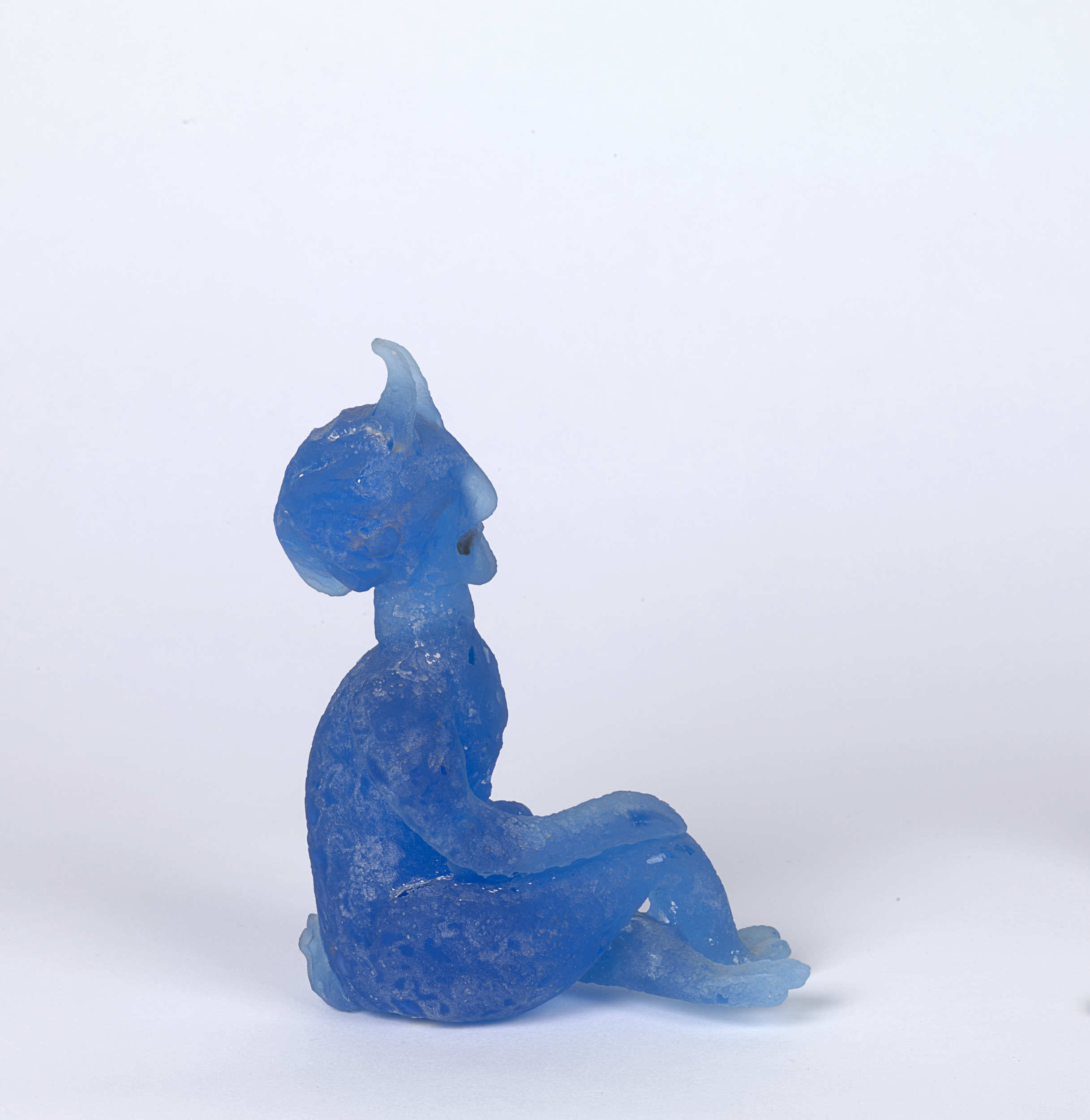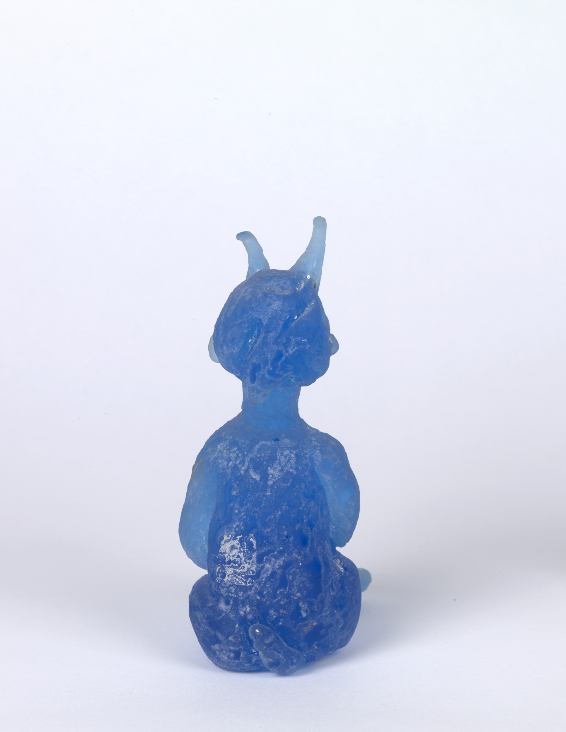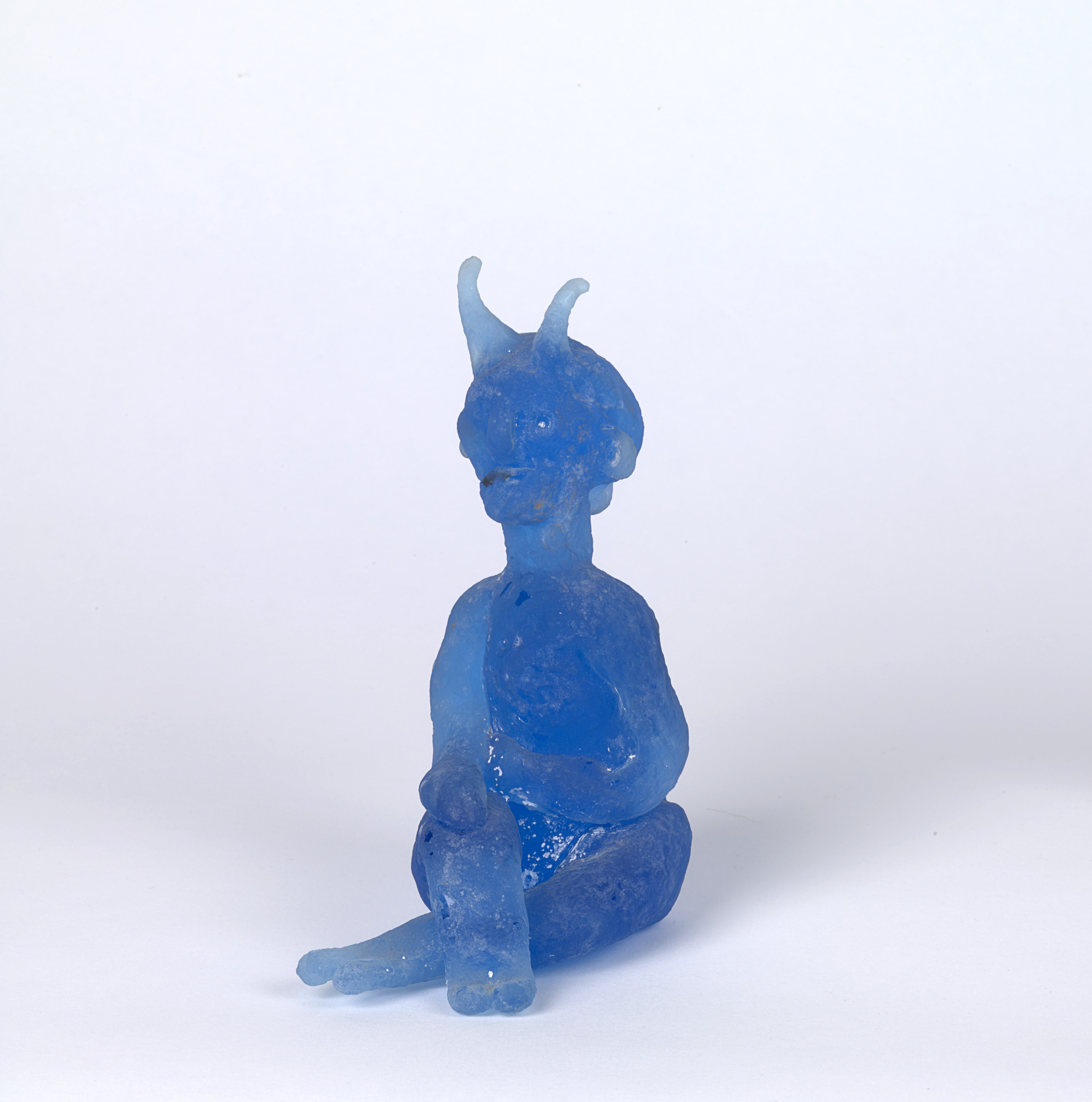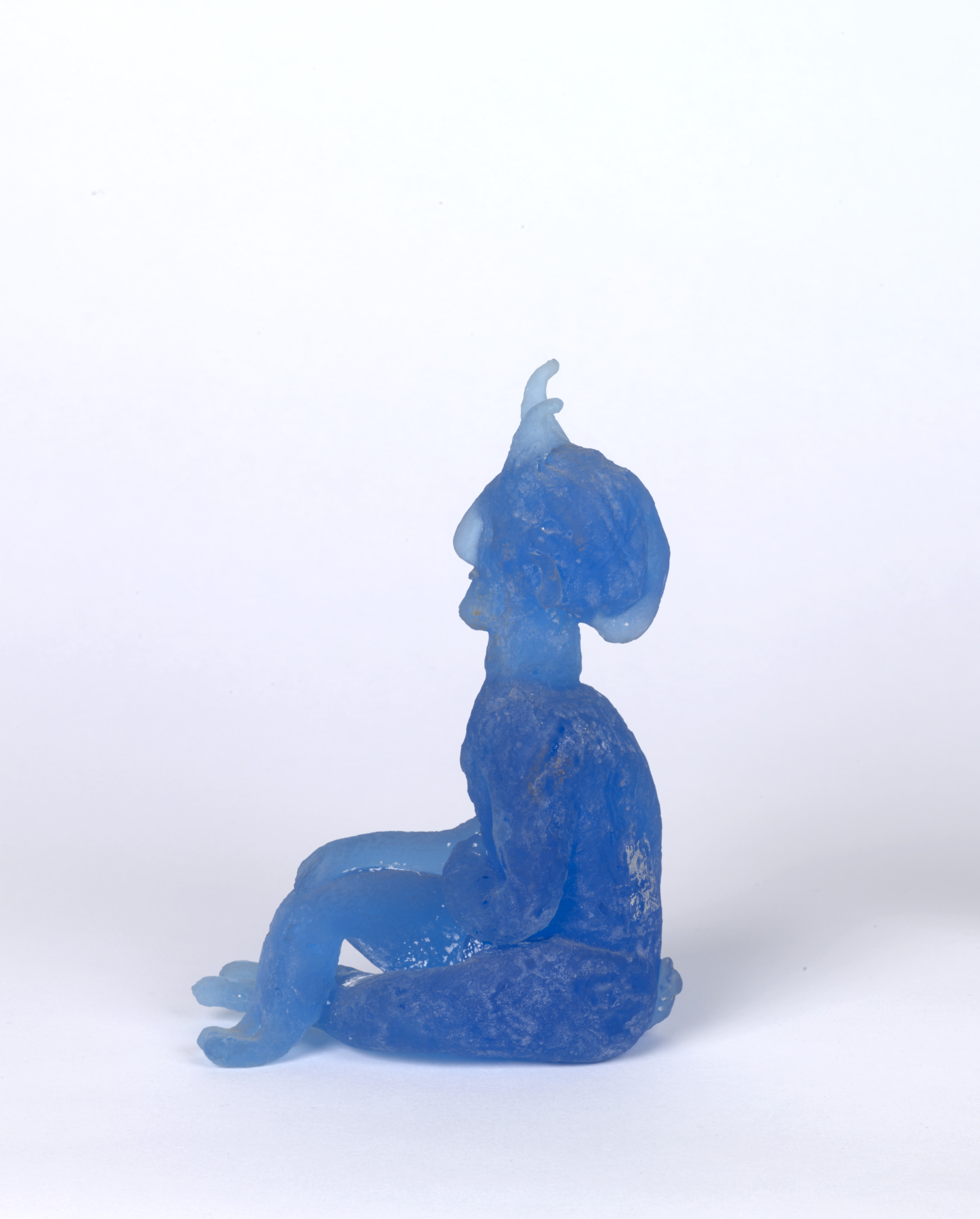 Mythological creatures appear throughout Pablo Picasso’s body of work, and in the mid-1940s he created a series of fourteen small clay sculptures depicting nymphs and satyrs sitting, standing, and playing instruments. The works were then cast in bronze and, later, made in ceramic. In the mid-1960s, he revisited the motif and transposed the playful figures into cast blue glass in collaboration with master glassmaker Egidio Costantini (Italian, 1912–2007). Picasso was attracted to these characters’ playfulness, and they served as poignant symbols within his personal iconography. One of the satyr figures here is said to be a self-portrait of the artist.