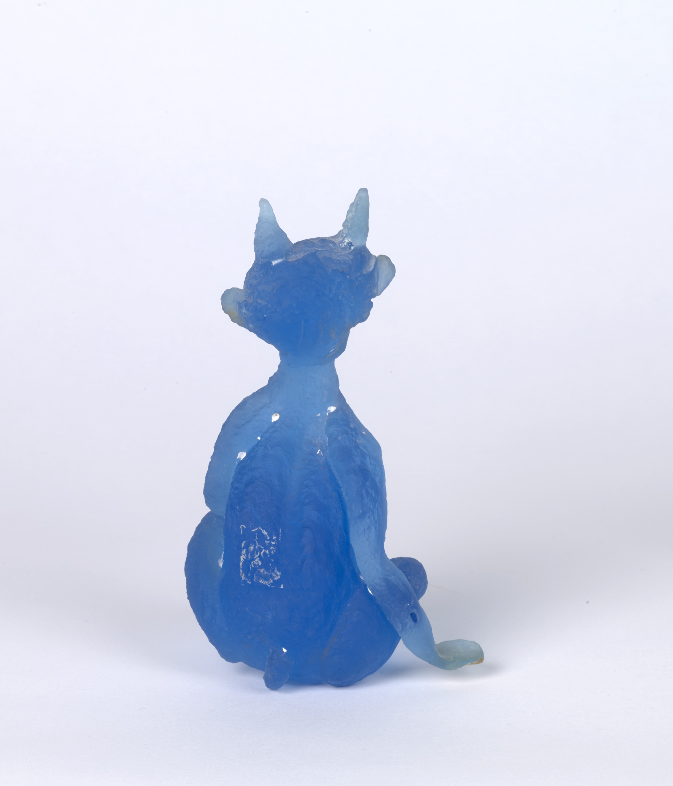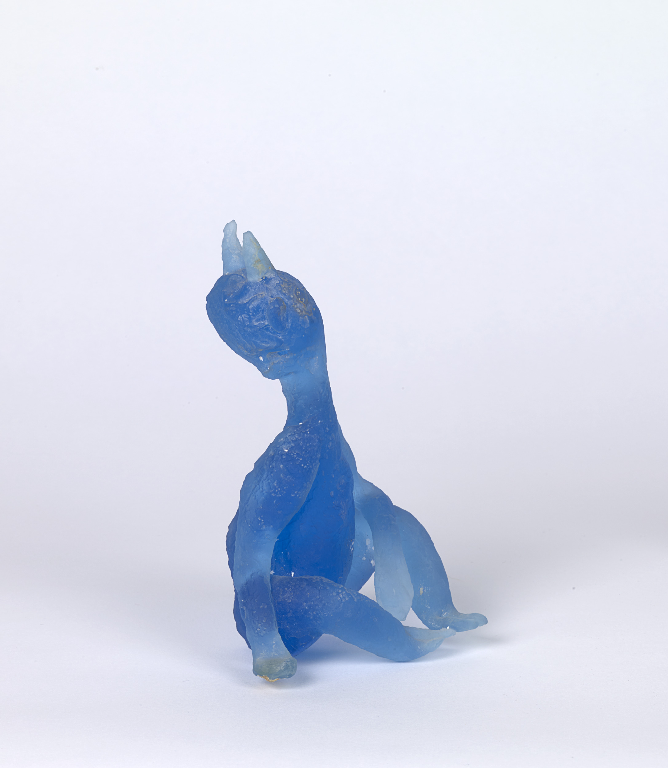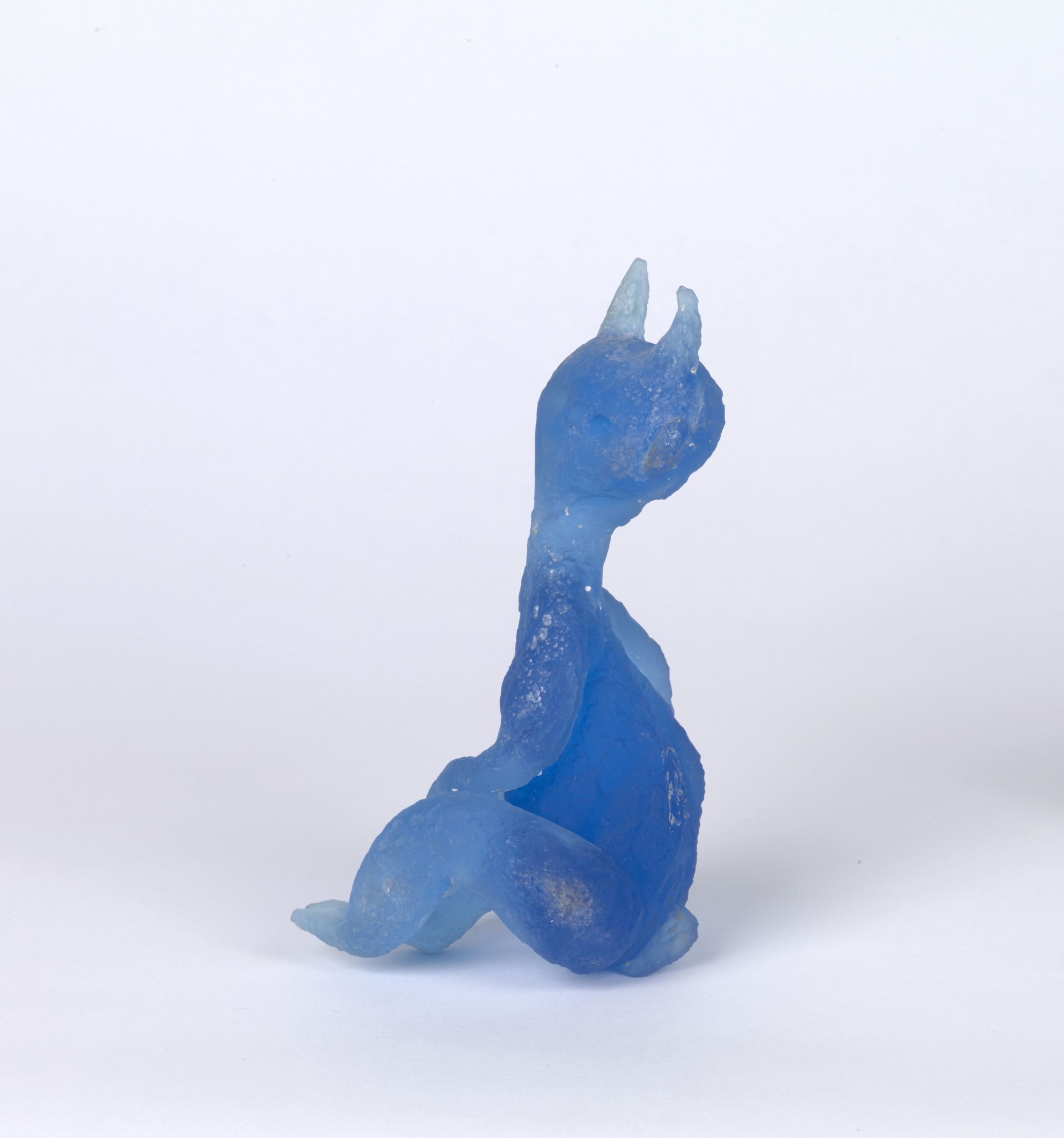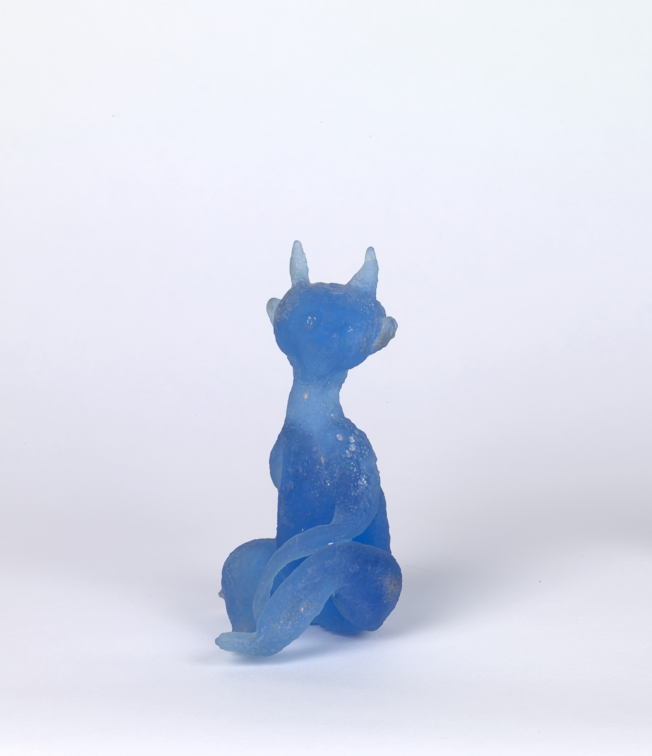 Mythological creatures appear throughout Pablo Picasso’s body of work, and in the mid-1940s he created a series of fourteen small clay sculptures depicting nymphs and satyrs sitting, standing, and playing instruments. The works were then cast in bronze and, later, made in ceramic. In the mid-1960s, he revisited the motif and transposed the playful figures into cast blue glass in collaboration with master glassmaker Egidio Costantini (Italian, 1912–2007). Picasso was attracted to these characters’ playfulness, and they served as poignant symbols within his personal iconography. One of the satyr figures here is said to be a self-portrait of the artist.