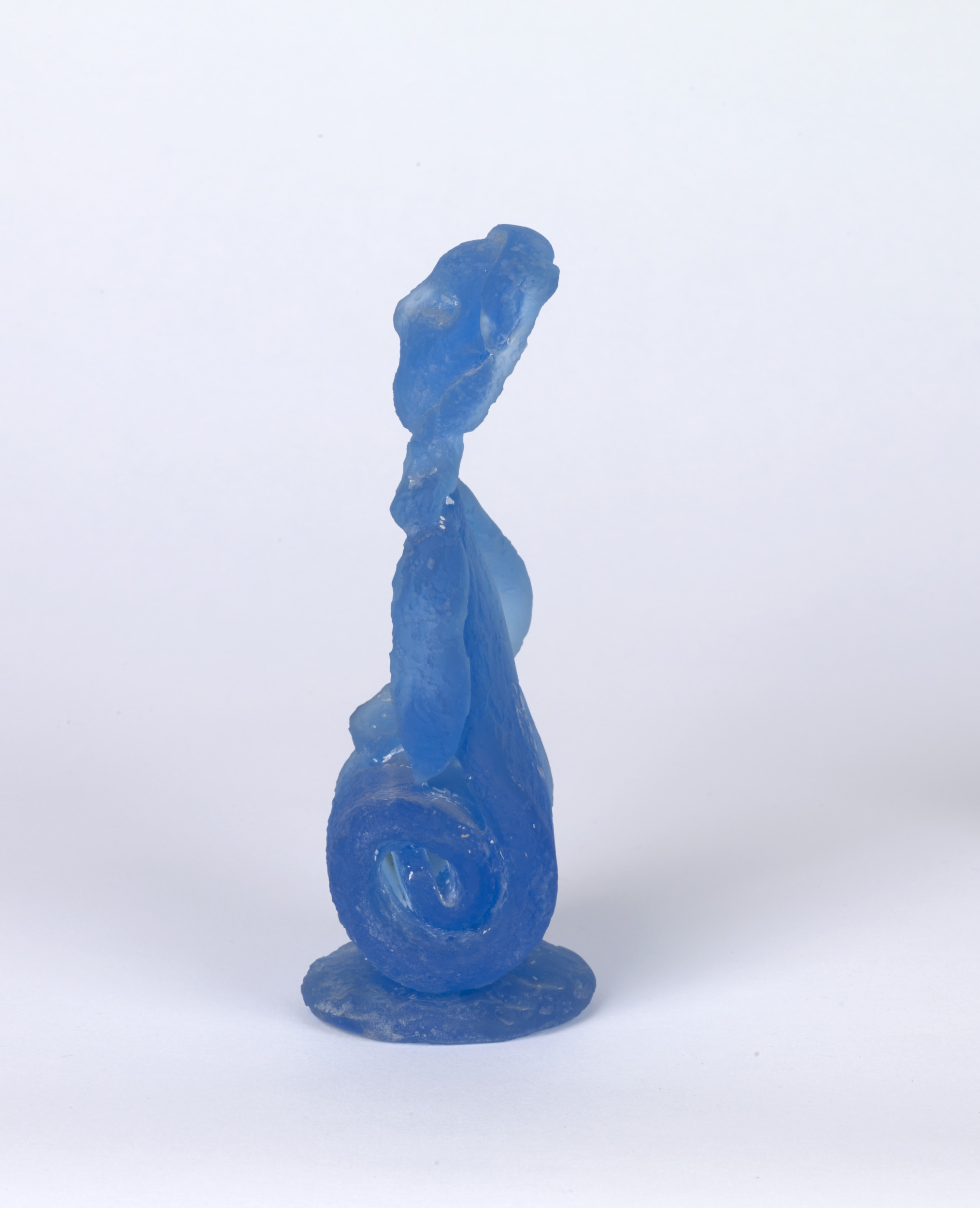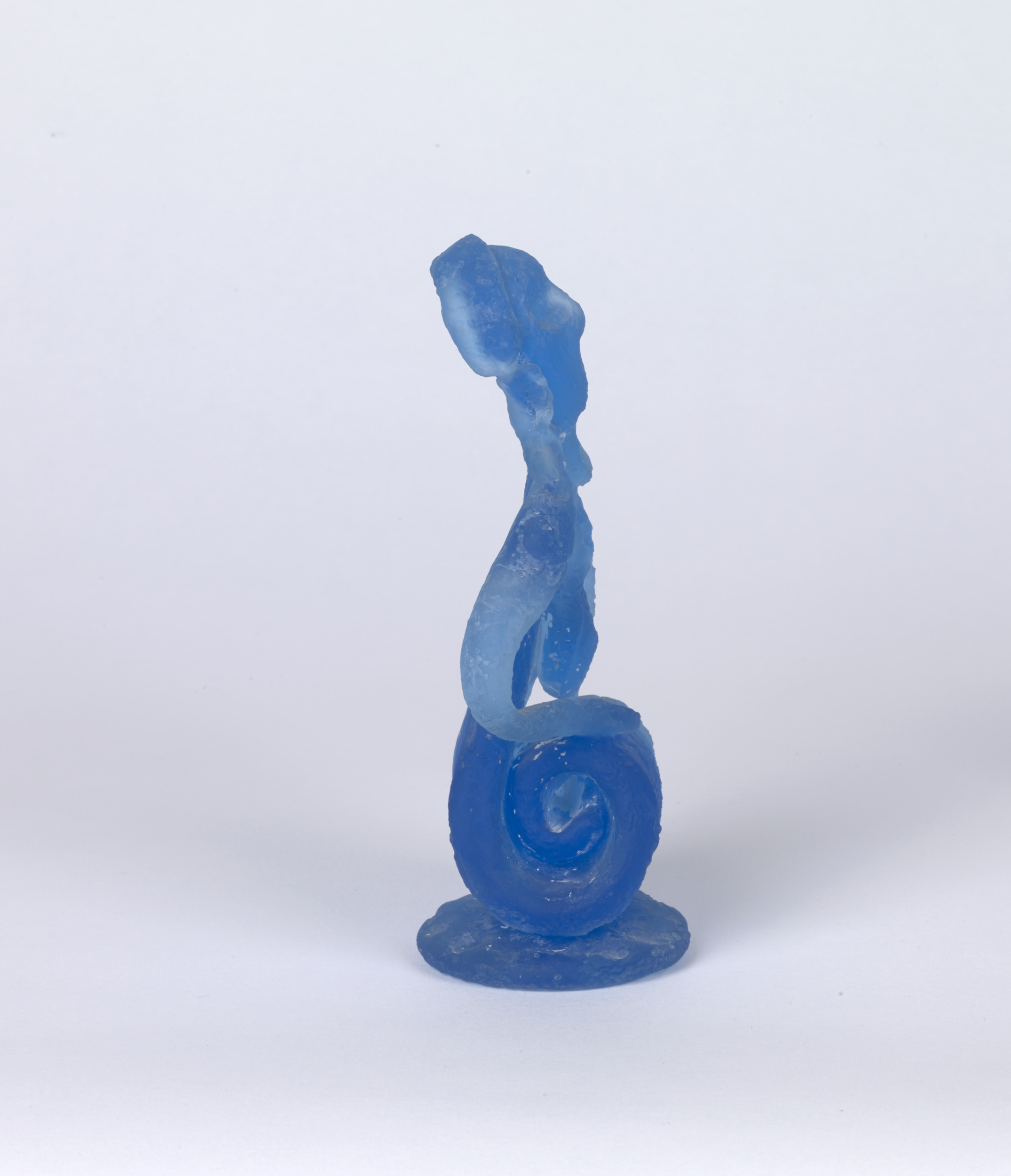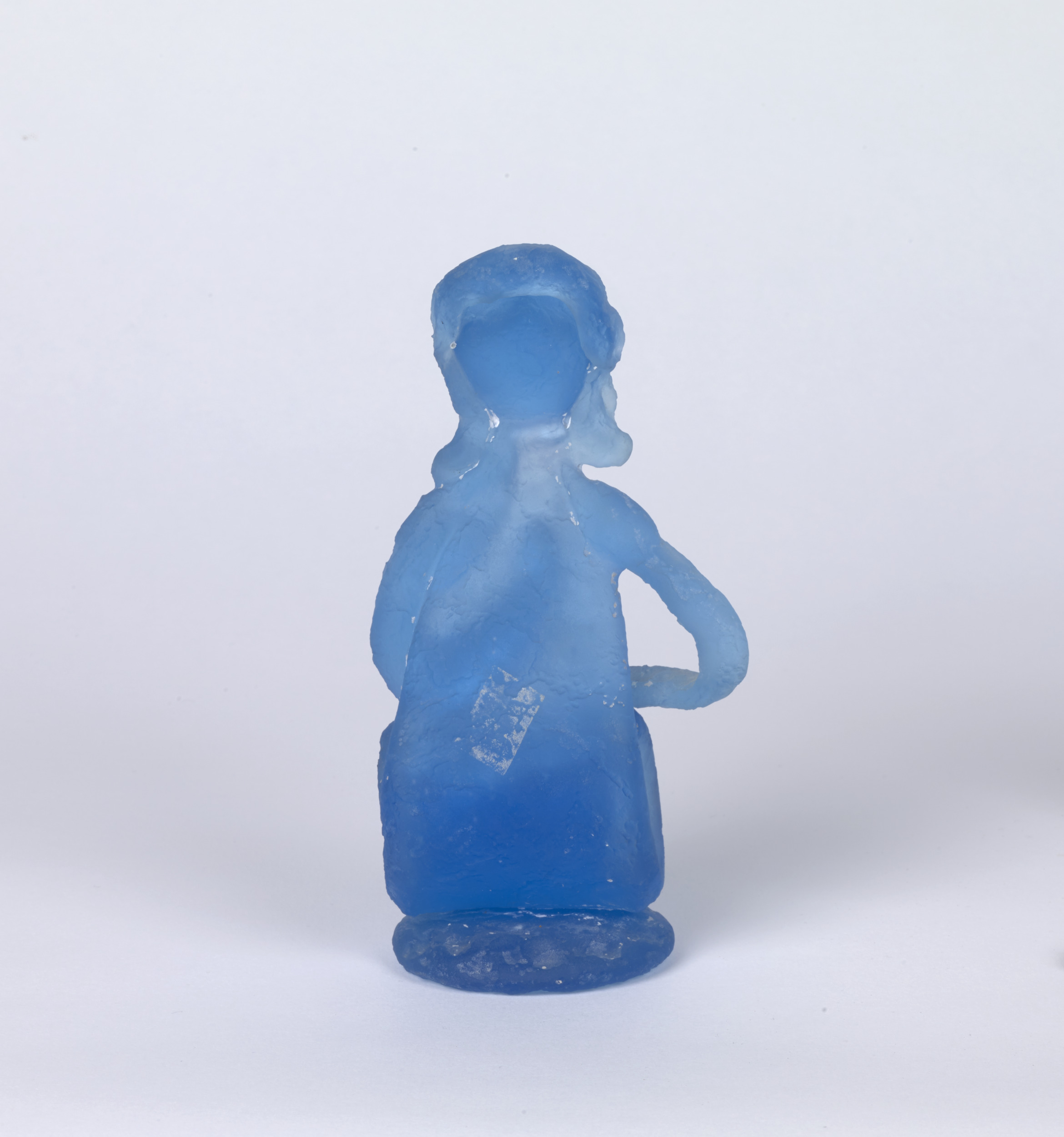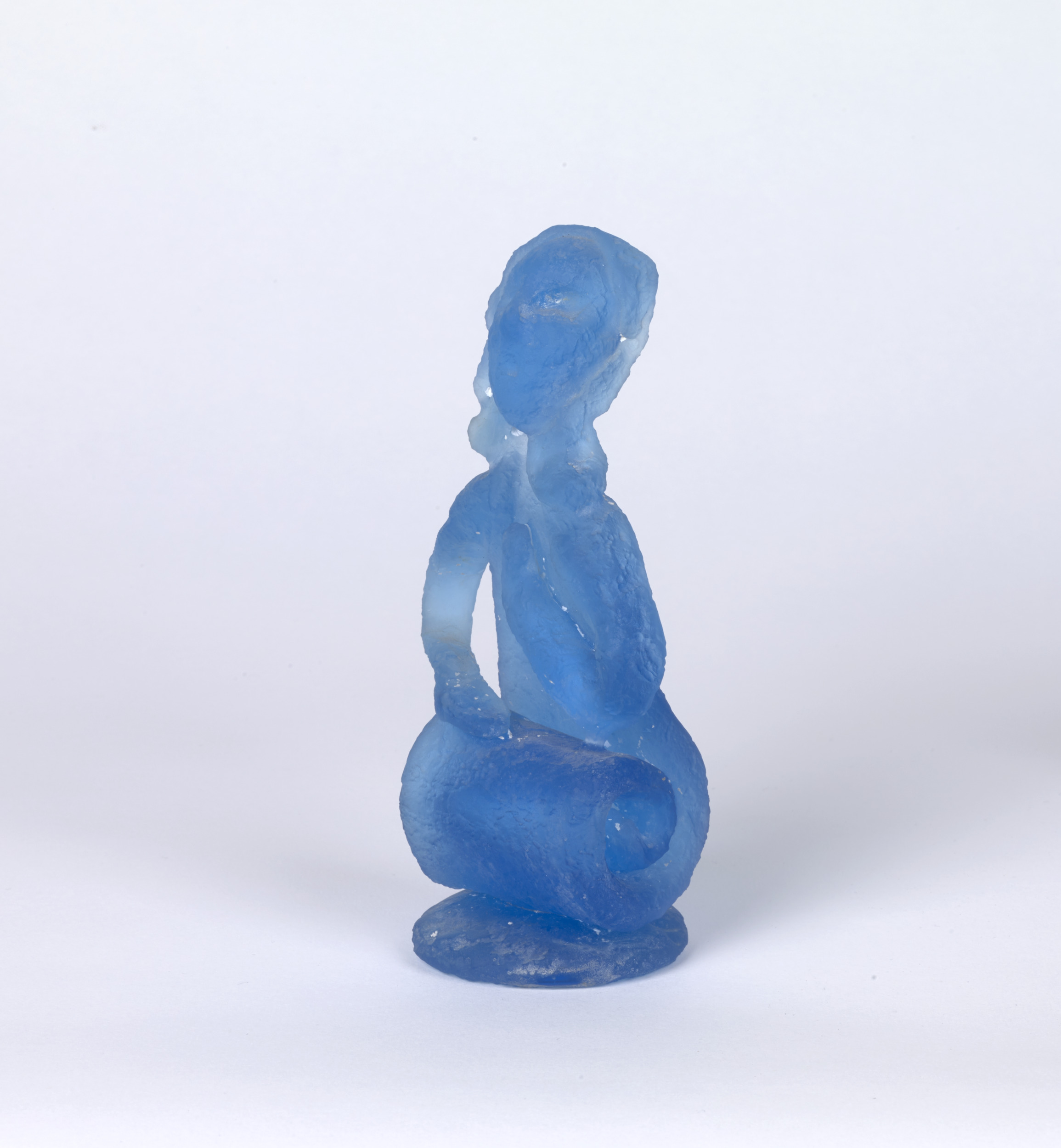 Mythological creatures appear throughout Pablo Picasso’s body of work, and in the mid-1940s he created a series of fourteen small clay sculptures depicting nymphs and satyrs sitting, standing, and playing instruments. The works were then cast in bronze and, later, made in ceramic. In the mid-1960s, he revisited the motif and transposed the playful figures into cast blue glass in collaboration with master glassmaker Egidio Costantini (Italian, 1912–2007). Picasso was attracted to these characters’ playfulness, and they served as poignant symbols within his personal iconography. One of the satyr figures here is said to be a self-portrait of the artist.