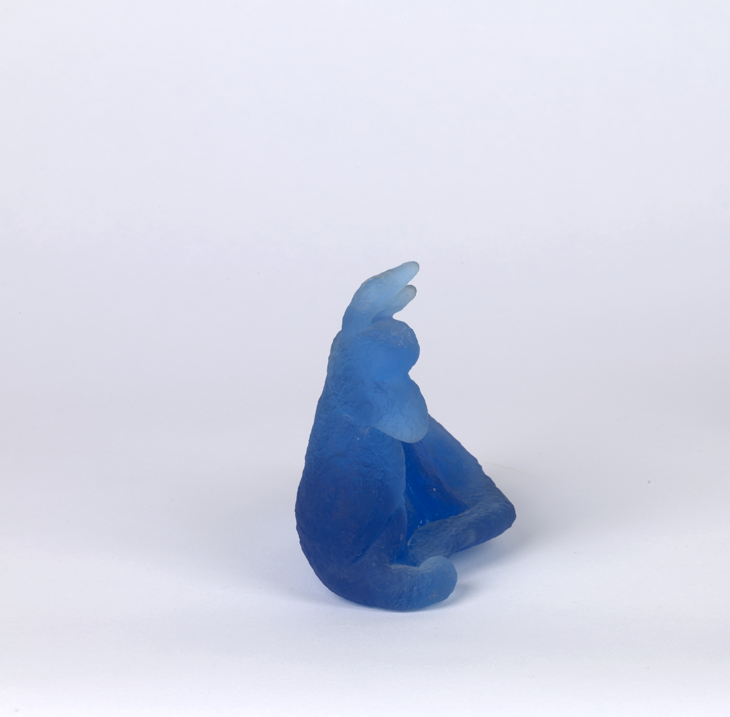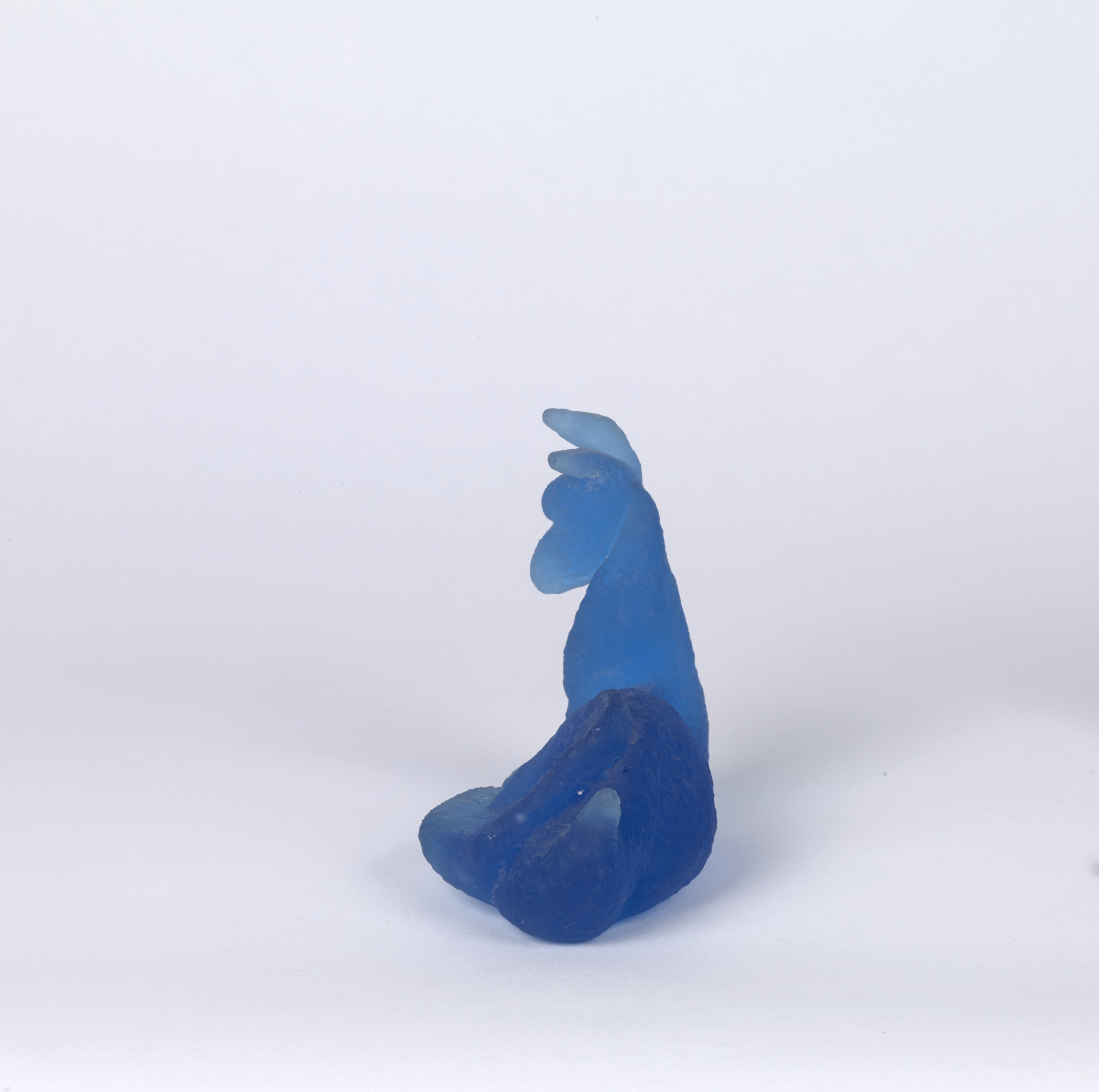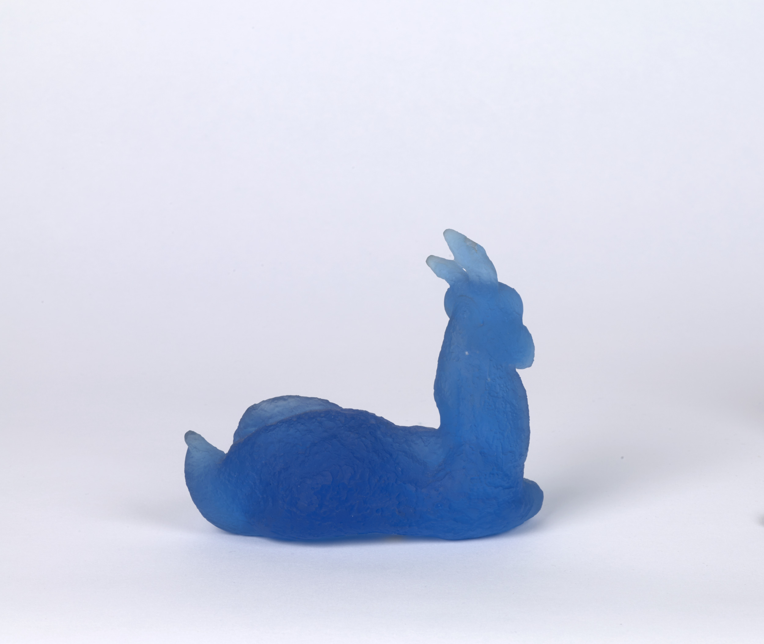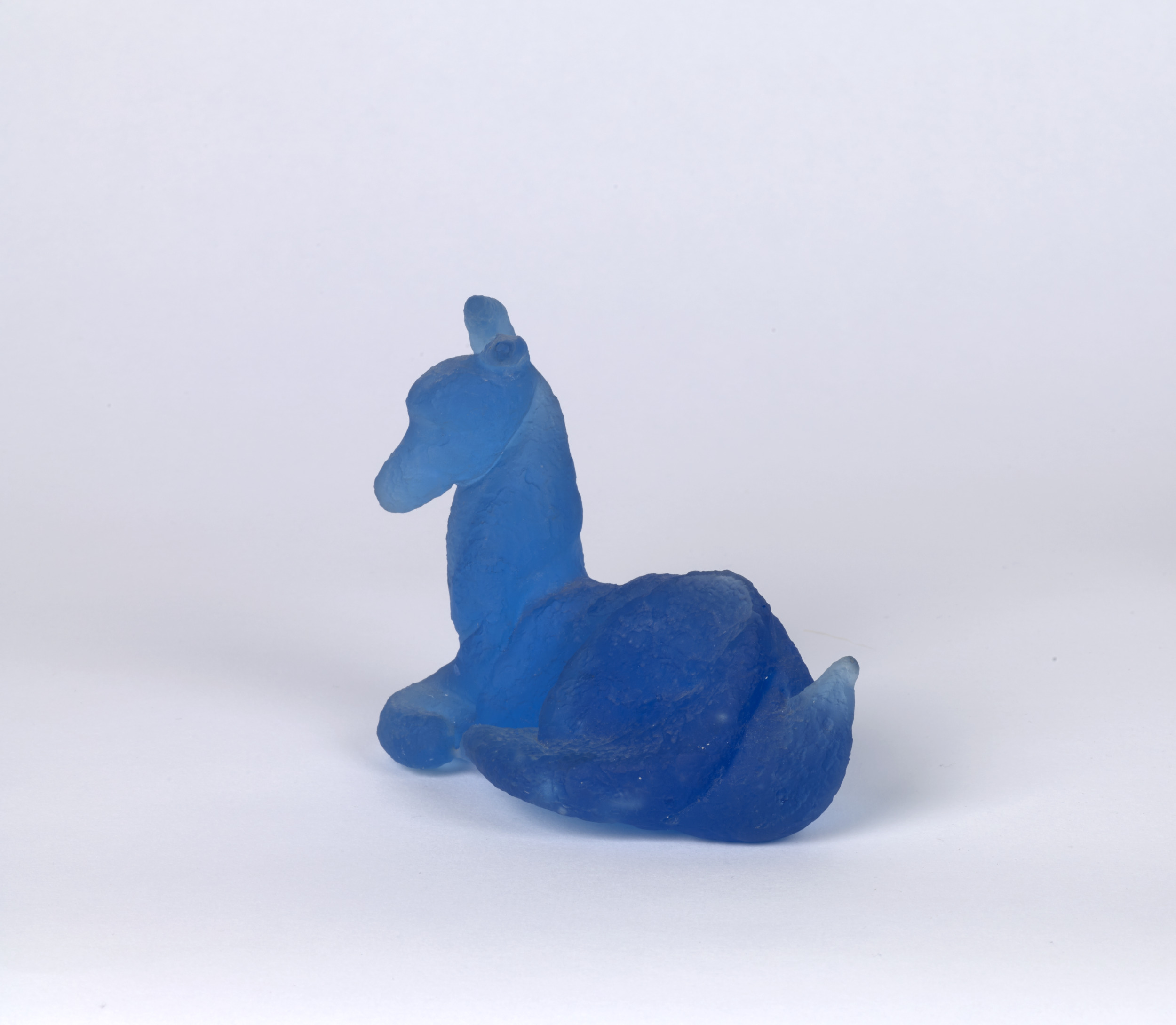 Mythological creatures appear throughout Pablo Picasso’s body of work, and in the mid-1940s he created a series of fourteen small clay sculptures depicting nymphs and satyrs sitting, standing, and playing instruments. The works were then cast in bronze and, later, made in ceramic. In the mid-1960s, he revisited the motif and transposed the playful figures into cast blue glass in collaboration with master glassmaker Egidio Costantini (Italian, 1912–2007). Picasso was attracted to these characters’ playfulness, and they served as poignant symbols within his personal iconography. One of the satyr figures here is said to be a self-portrait of the artist.