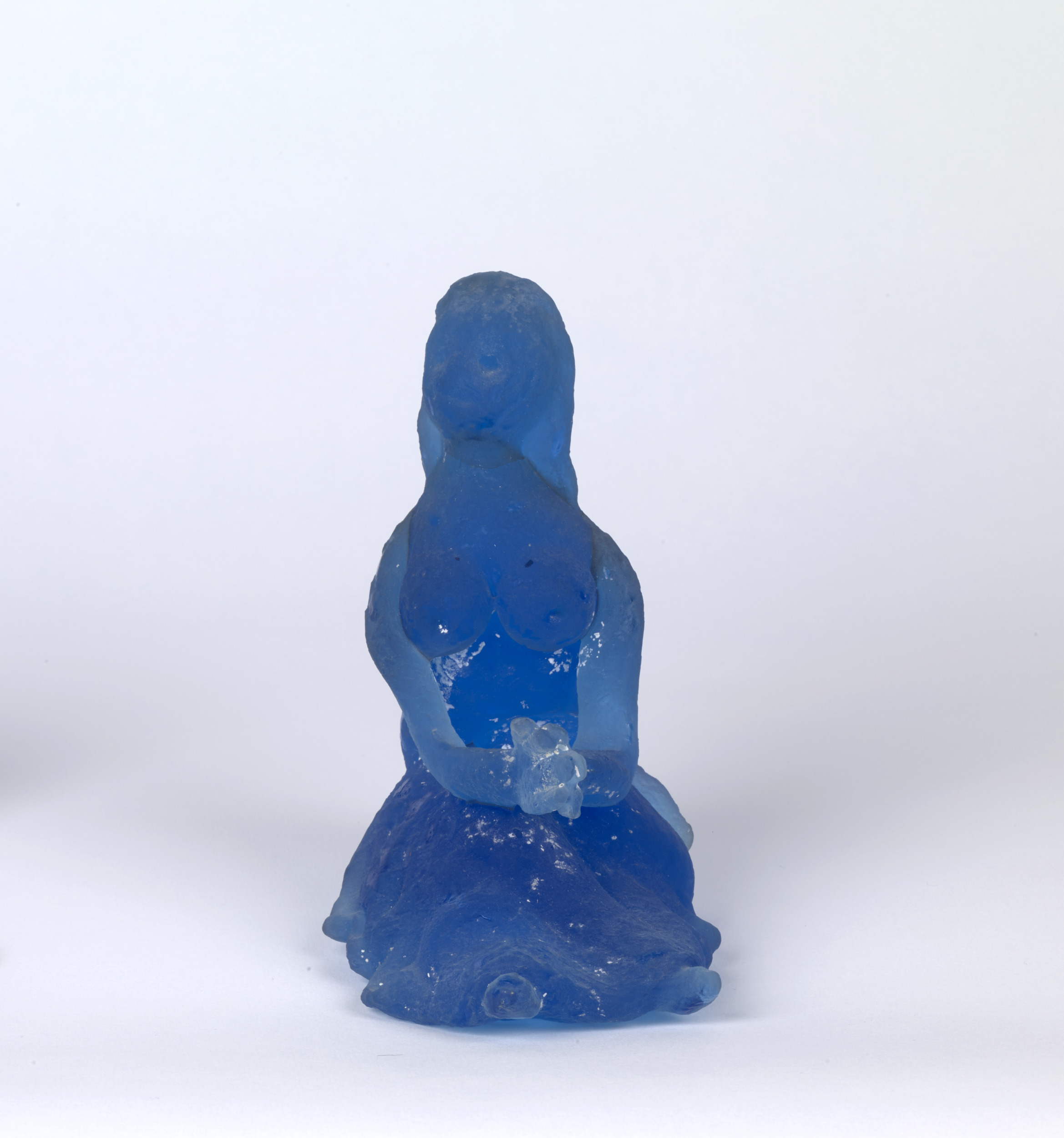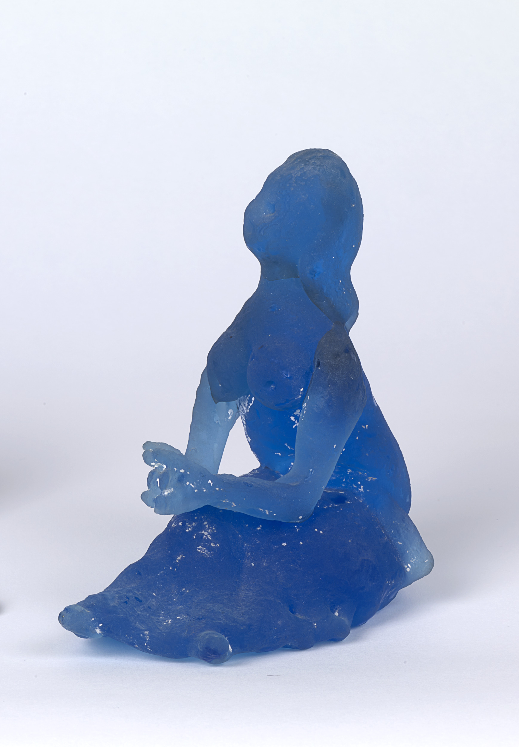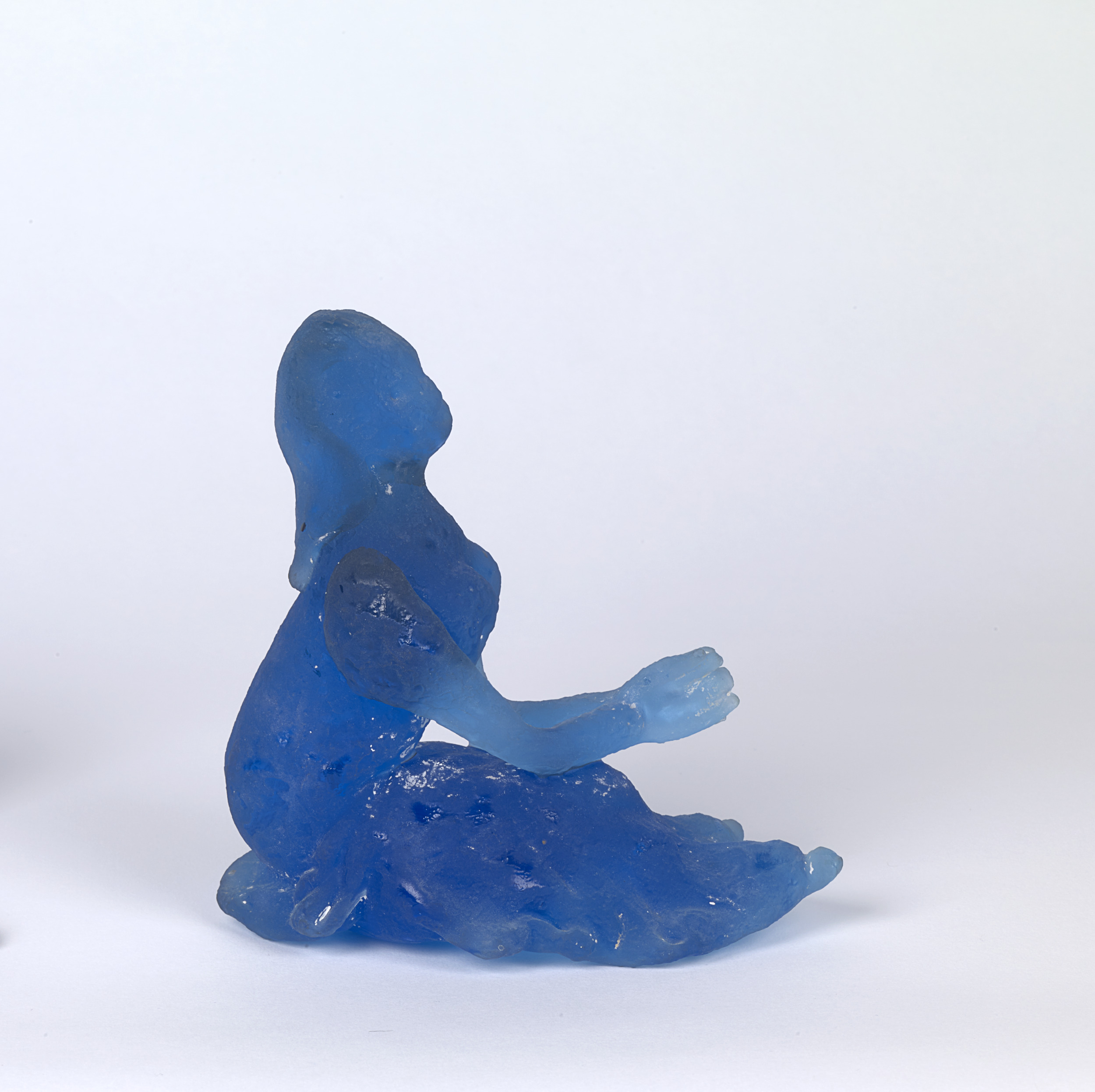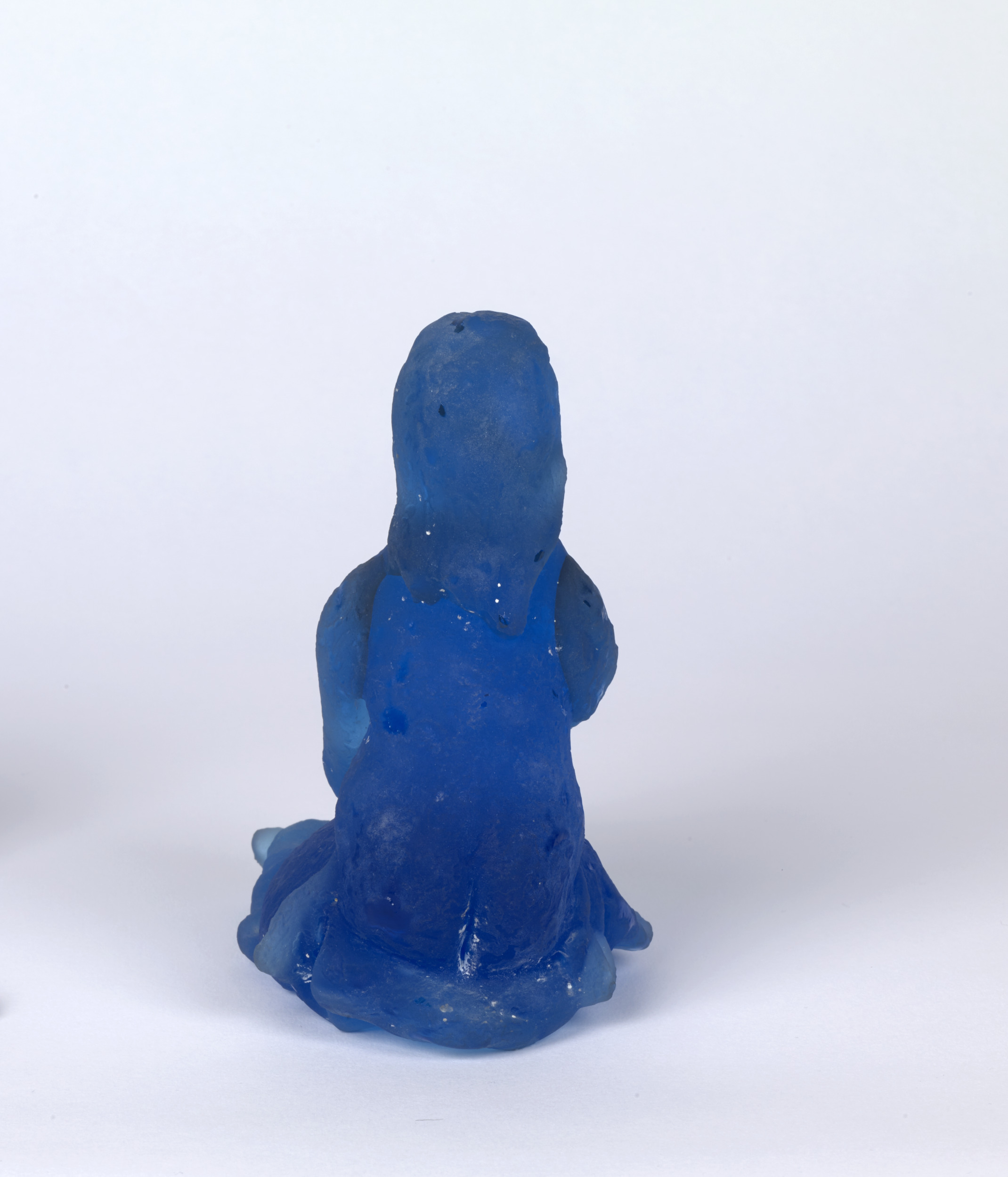 Mythological creatures appear throughout Pablo Picasso’s body of work, and in the mid-1940s he created a series of fourteen small clay sculptures depicting nymphs and satyrs sitting, standing, and playing instruments. The works were then cast in bronze and, later, made in ceramic. In the mid-1960s, he revisited the motif and transposed the playful figures into cast blue glass in collaboration with master glassmaker Egidio Costantini (Italian, 1912–2007). Picasso was attracted to these characters’ playfulness, and they served as poignant symbols within his personal iconography. One of the satyr figures here is said to be a self-portrait of the artist.