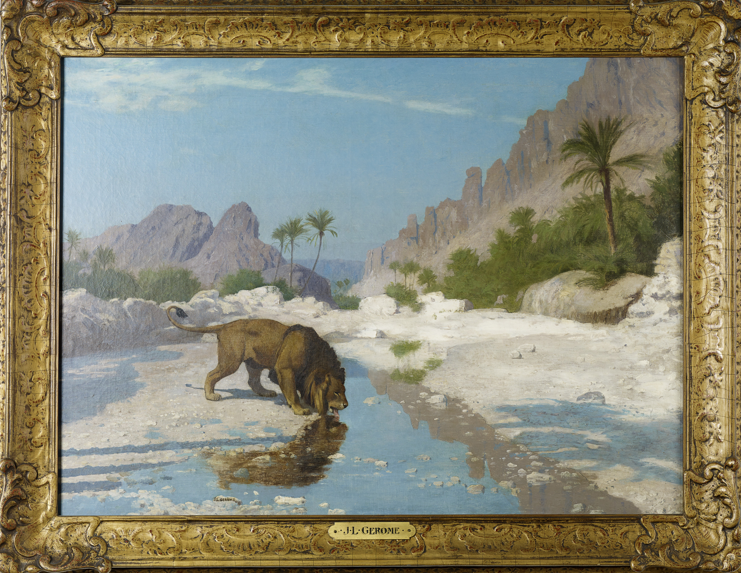 Lions take center stage in a number of compositions Jean-Léon Gérôme painted throughout the 1880s. At the time, paintings and sculptures by French animalier artists were increasing in popularity among the general public. However, Gérôme’s interest in the subject dated to his student years, when he regularly went to the zoo in Paris to sketch lions. A safari in North Africa in 1885 further fueled his fascination with the animal. It was there that his zeal for exotic subjects and the desert terrain took root. This sketchy and sun-filled landscape of a drinking lion is actually an unfinished composition—the artist’s underdrawing in black ink is still visible.