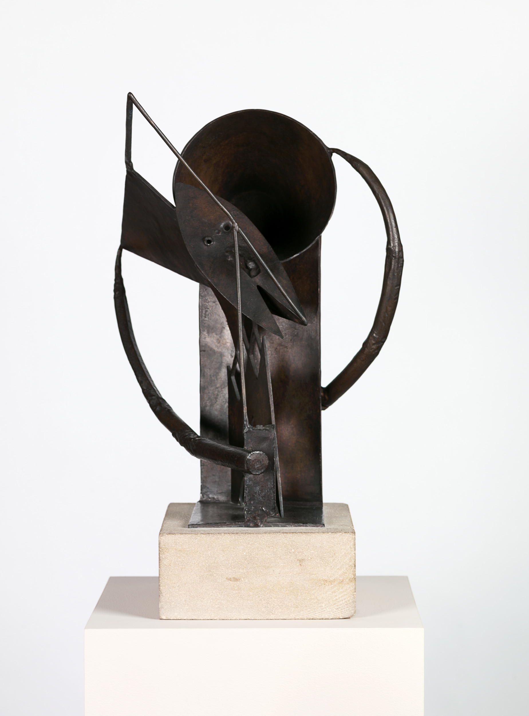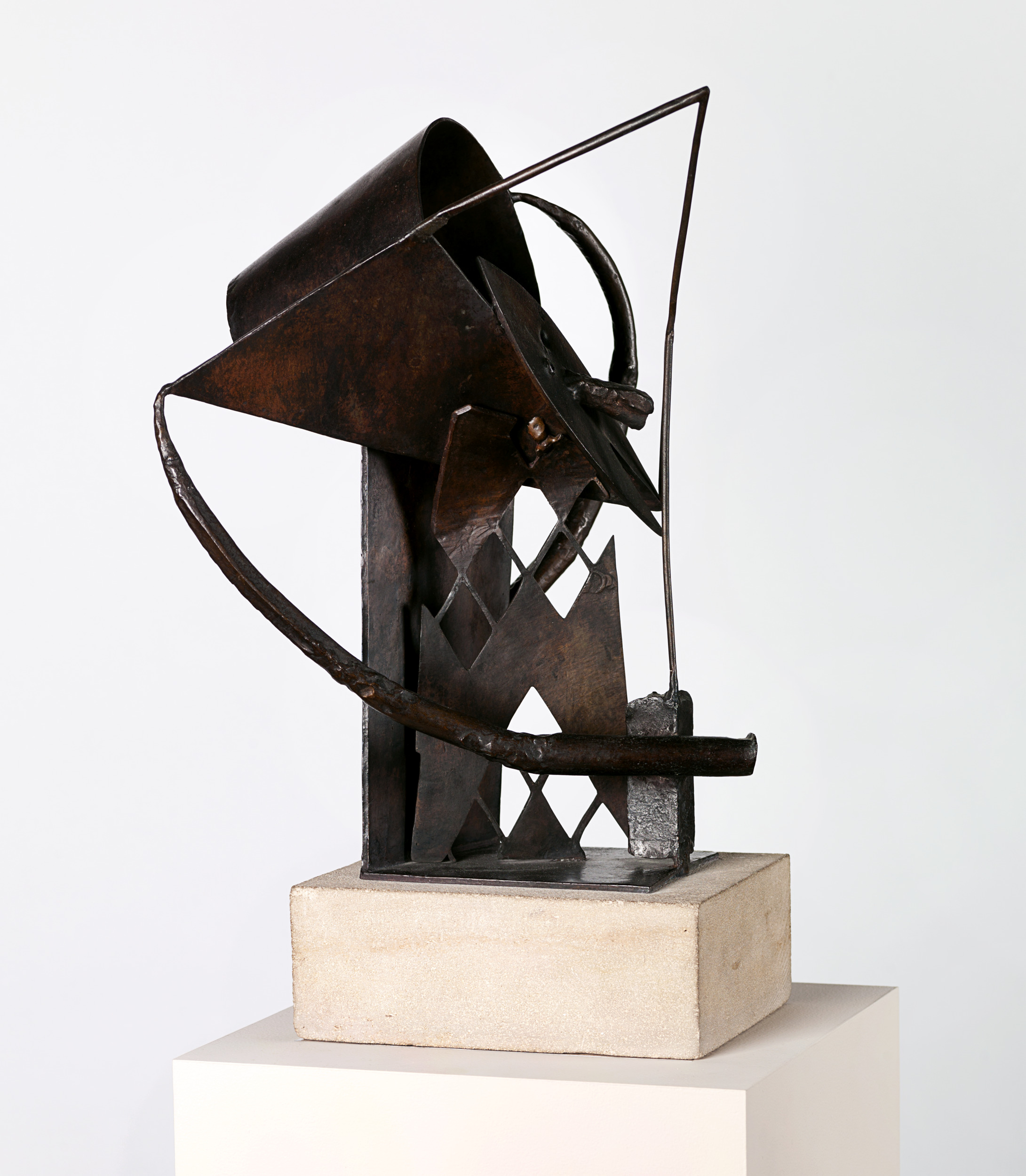 When Julio González moved from Barcelona to Paris in 1900, he developed a close friendship with Pablo Picasso. However, after his brother passed away in 1908, González withdrew from the social circle and abandoned art-making altogether. Around 1926 the artist began creating again, and from 1928 to 1931 he helped Picasso execute a series of welded iron sculptures. All the while, his own work was becoming increasingly abstract. Harlequin is González’s interpretation of drawing in space. Given his close working relationship with Picasso, he was no doubt influenced by the artist’s late Cubist style.