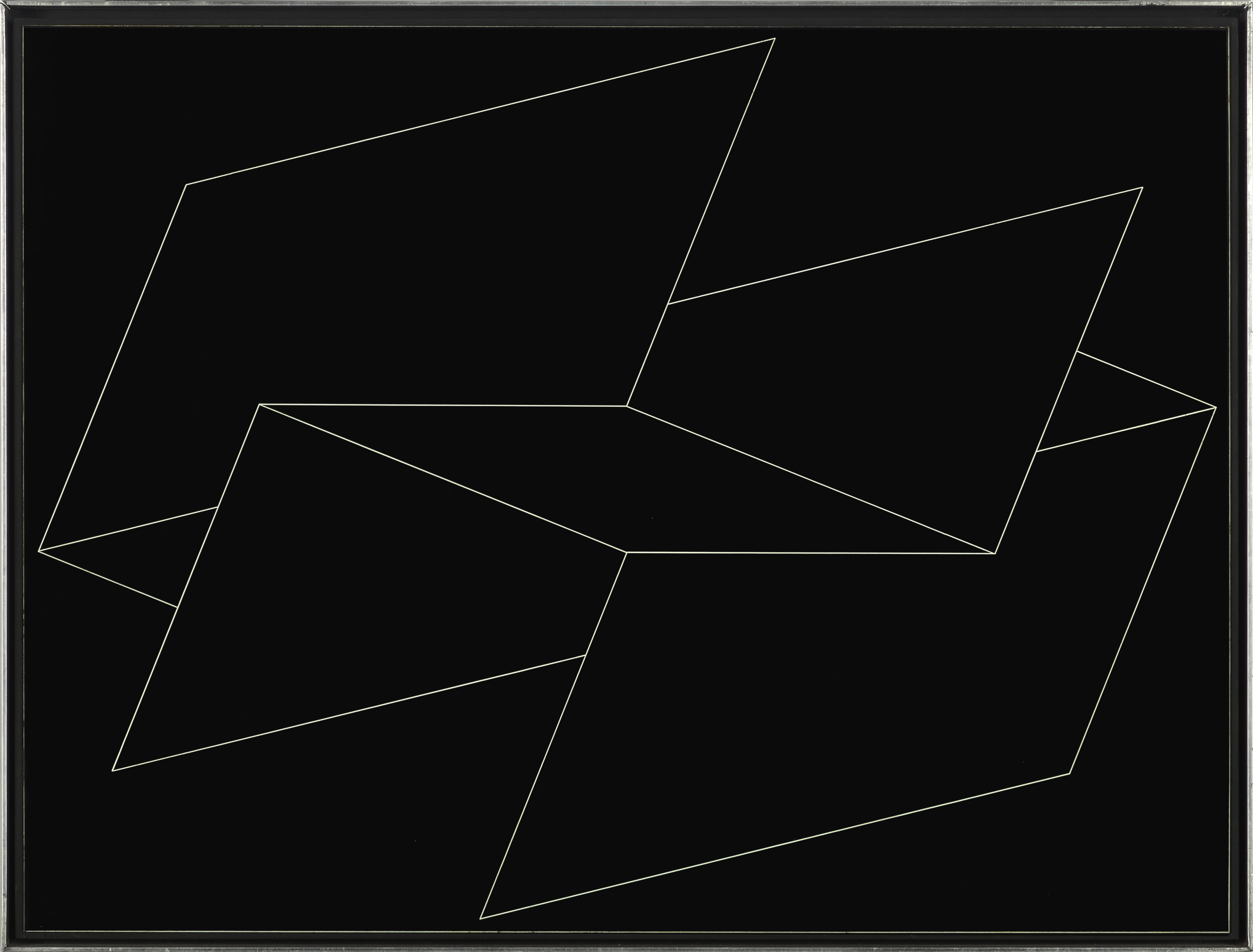 Beginning in the 1930s, Josef Albers became one of the first artists to explore the psychological effects of color and space, a pursuit later adopted by Op art. He was especially interested in the ways in which the human eye processes the interaction among these compositional elements. Elegant geometric and spatial manipulations like Structural Constellation F. M. E. 3 toy with the viewer’s sense of space. Here, planes and angles appear to advance and recede into space simultaneously. Lines seem to cantilever outside of the picture plane or bend where they intersect. Throughout his lifetime, Albers created hundreds of works exploring variations of this motif, including drawings and embossed prints.