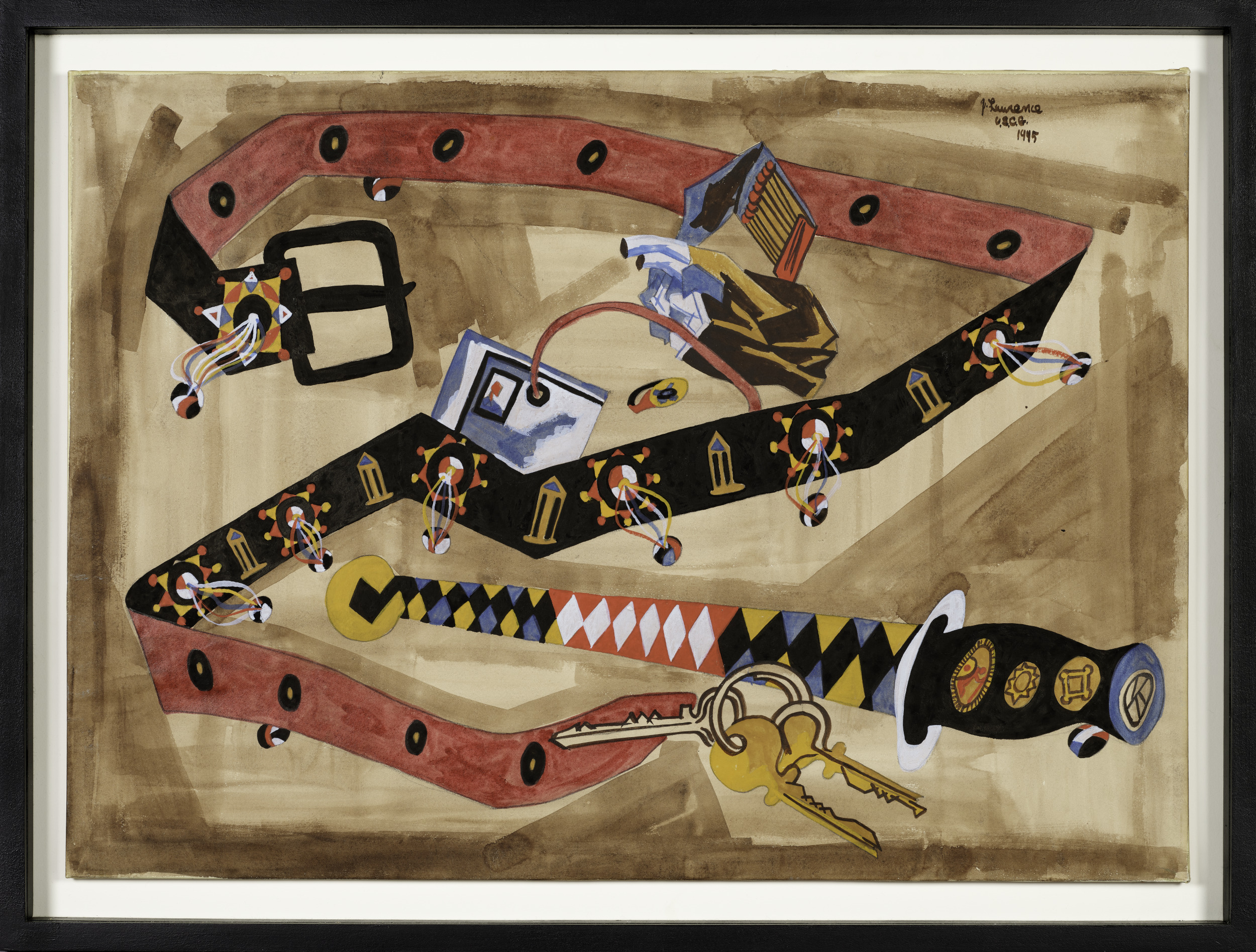 In a style characterized by basic forms and expressive color, Jacob Lawrence highlighted momentous events and people in African American history, such as Haiti’s emancipation from European rule in 1804 and the life of American abolitionist Harriet Tubman. Lawrence also documented aspects of his own life, particularly his military service. After being drafted into the Coast Guard in 1943, he served as combat artist on the USS General W. P. Richardson. Seaman’s Belt is not typical of the artist’s work; it provides neither a specific narrative nor does it contain any figures. However, these elements have a strong presence. It appears as if the sailor has just removed his belt and emptied his pockets. Keys, a crumpled pack of cigarettes, matches, and an identification badge point to contemporary civilization, while the pattern on the knife and beadwork on the belt allude to indigenous artistic traditions. This work may also be an unconventional self-portrait—the end of the war was nearing and Lawrence was to return soon to civilian life.