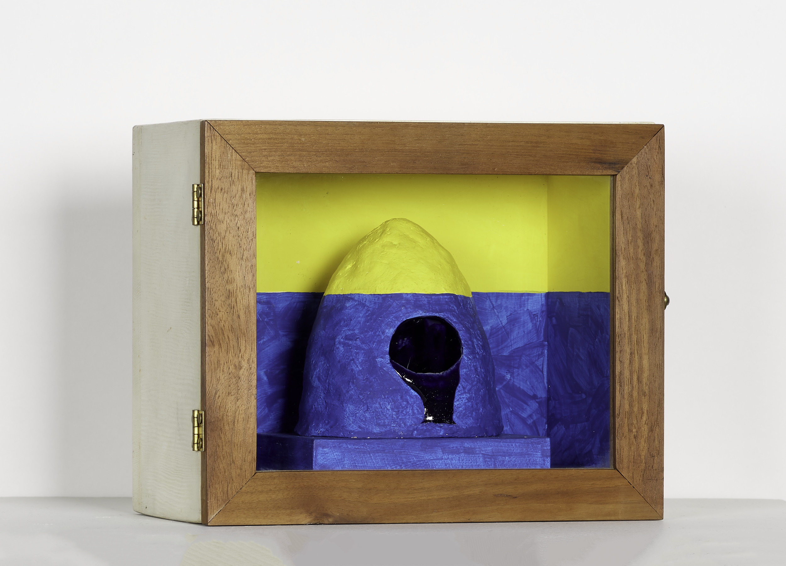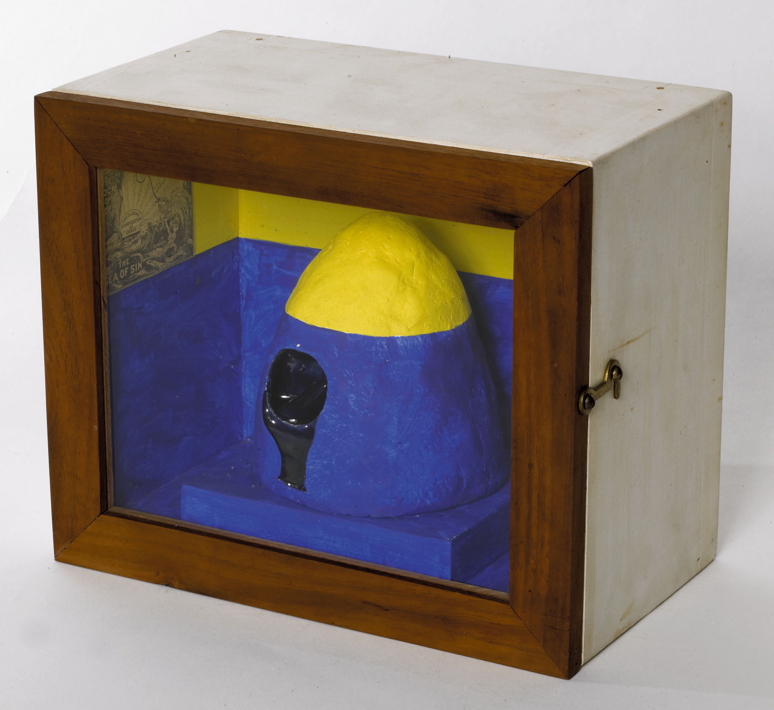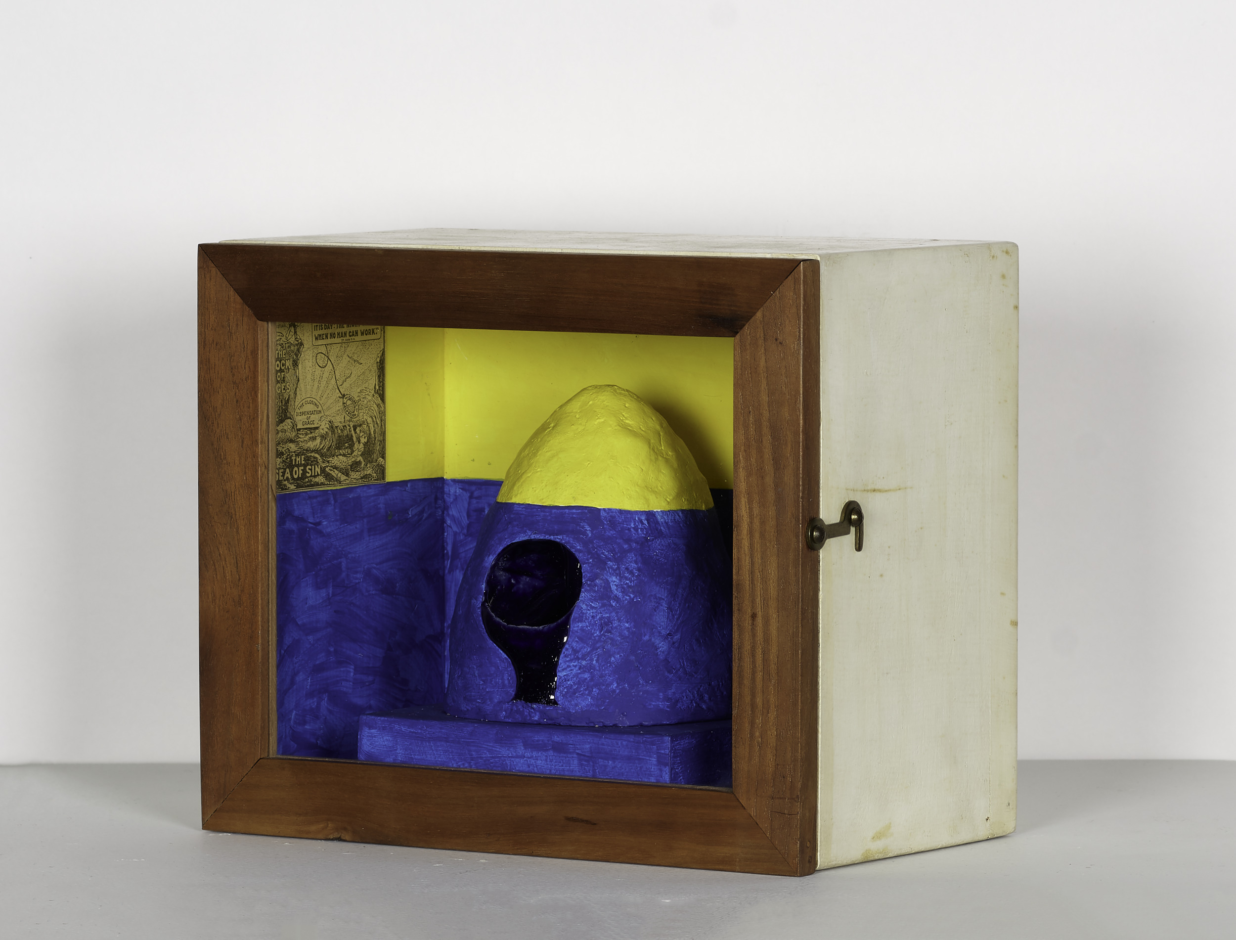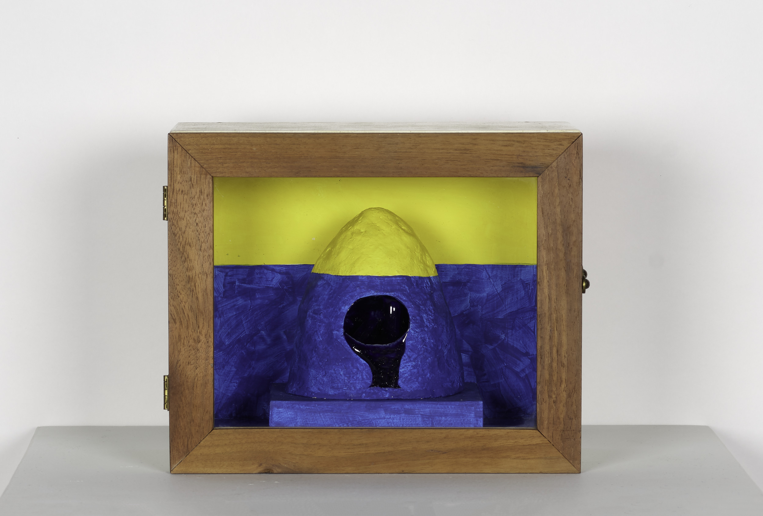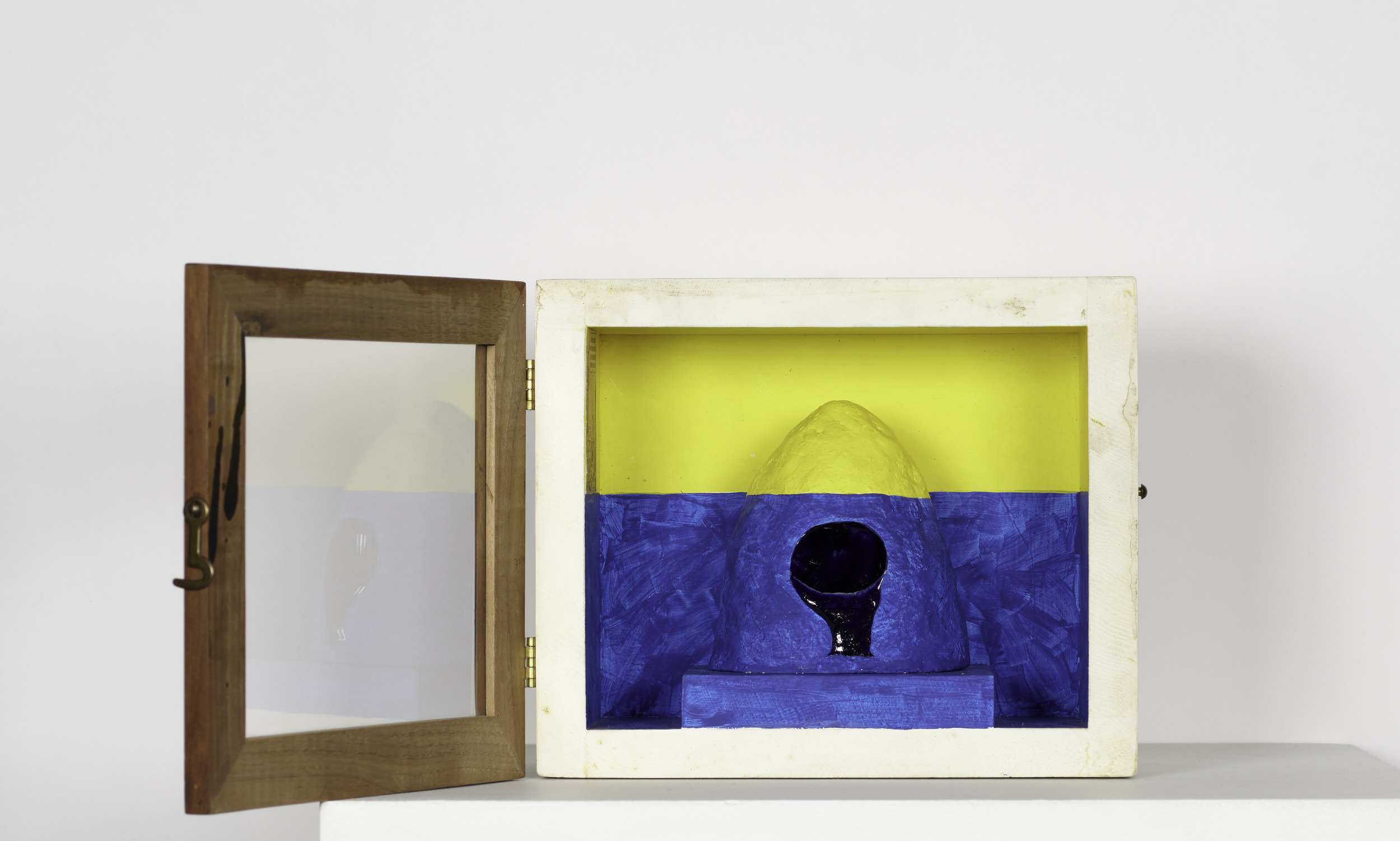 collage, tempera, and terracotta in wood and glass box