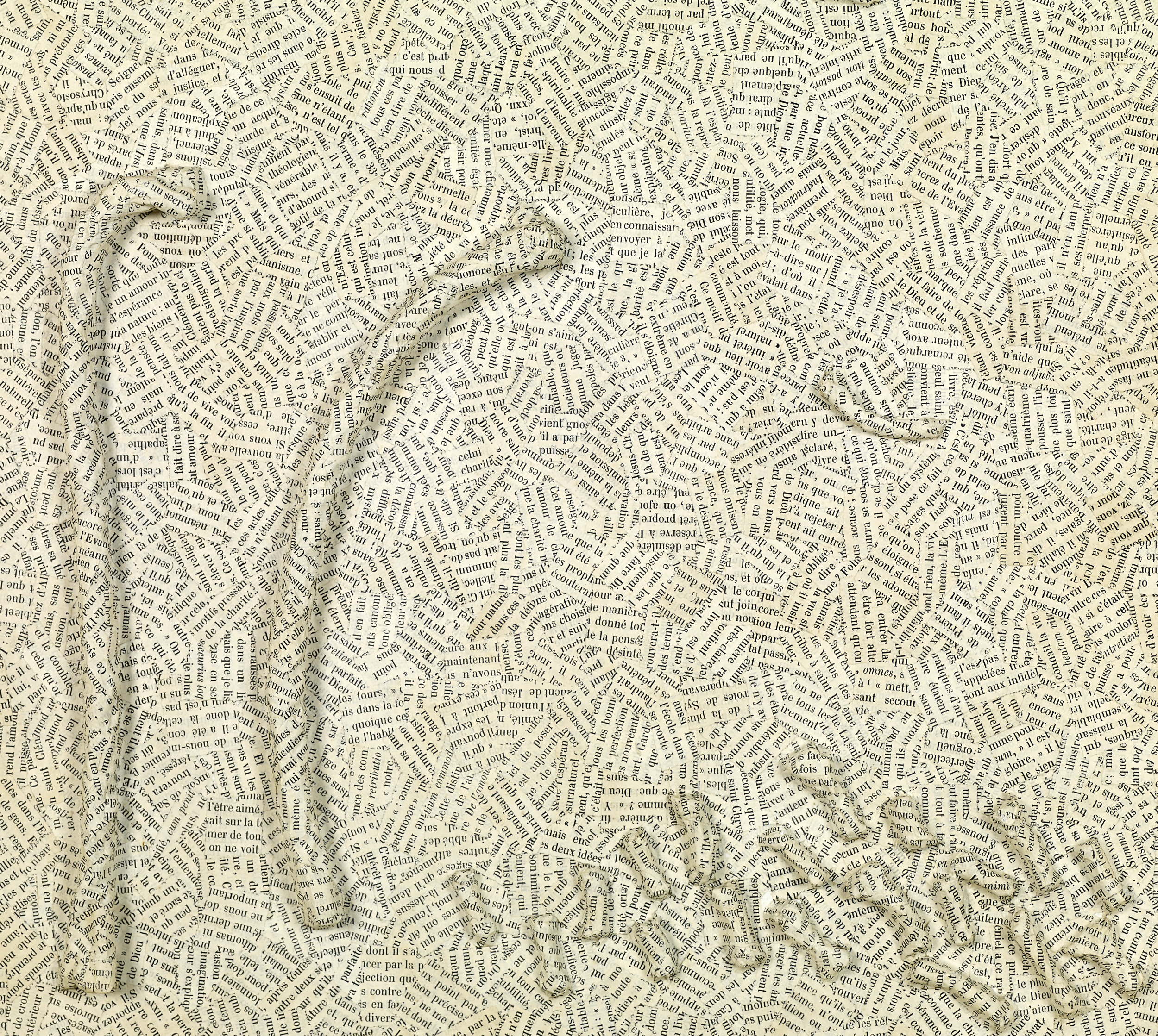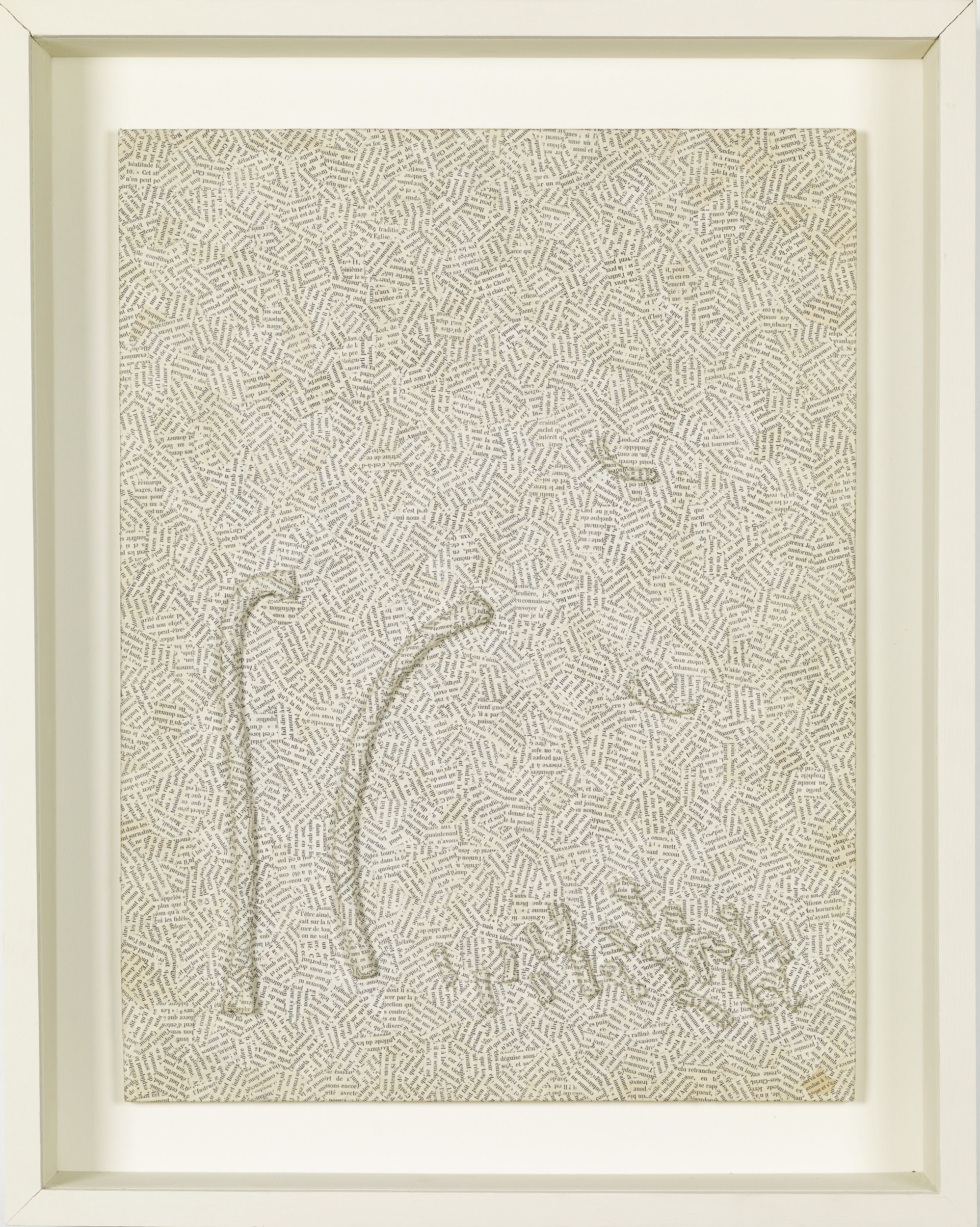 In his experiments with poetry and verbal collage, Jiří Kolář sought to free words from their normal function and meaning. When he began making collages during the early 1950s, he repurposed these skills to convert written texts and works by other artists into designs that had a purpose independent of their original components. In St. Francis Preaching to the Birds (after Giotto), individual French words, such as "béatitude," "foi," and "reconnaître" (beatitude, faith, and recognize), become secondary to the overall composition, which was inspired by Giotto’s (Italian, 1266/67–1337) late-thirteenth-century fresco of the same title. In Catholicism, St. Francis of Assisi (Italian, ca. 1181/82–1226) is the patron saint of animals and is said to embody God’s love for all creatures. Here, Kolář wrapped sections of rope in pieces of printed text to construct shapes that mimic the major components of Giotto’s painting—a slightly bowed St. Francis, a second figure who stands behind him, birds grouped on the ground, and a few that hover in flight.