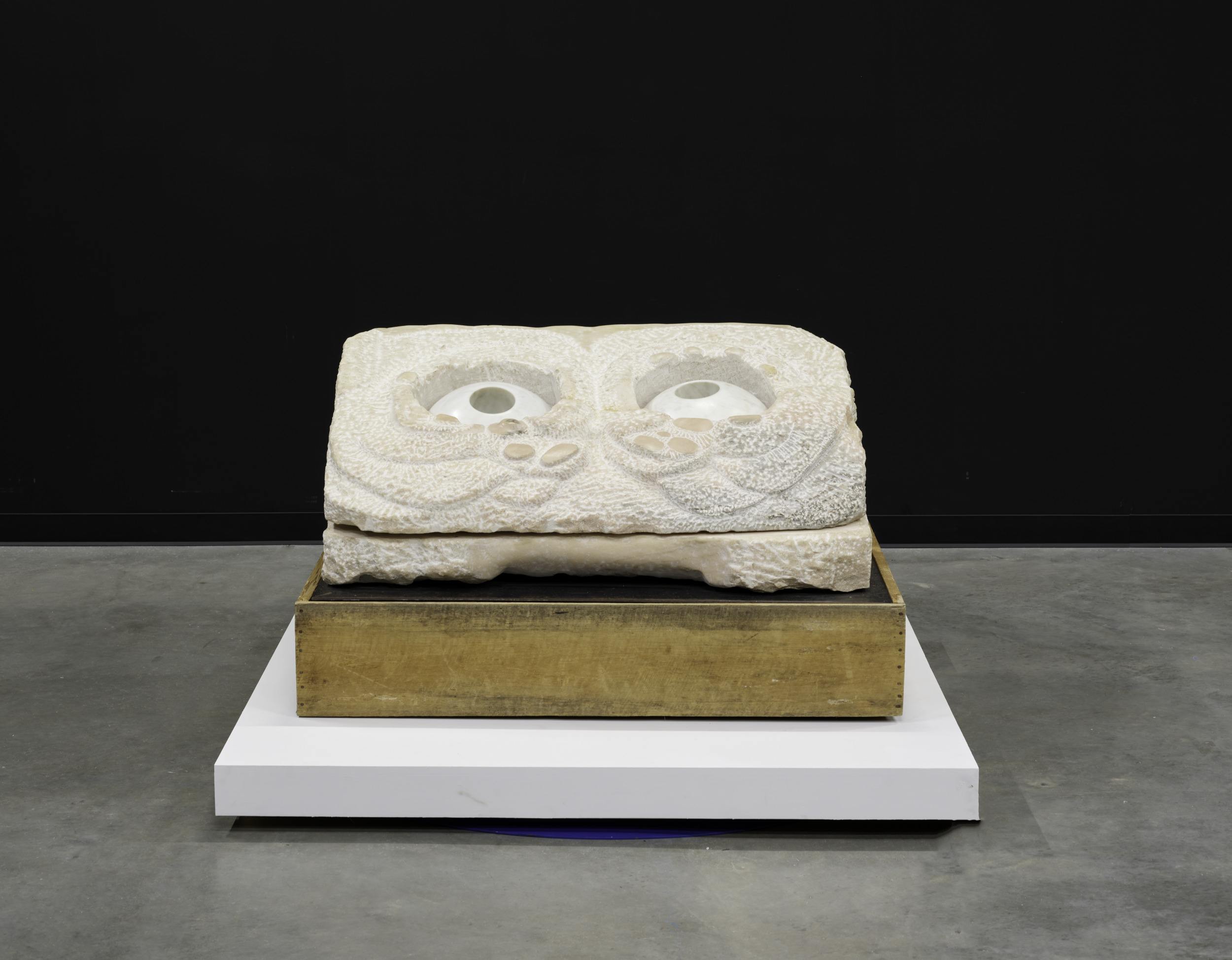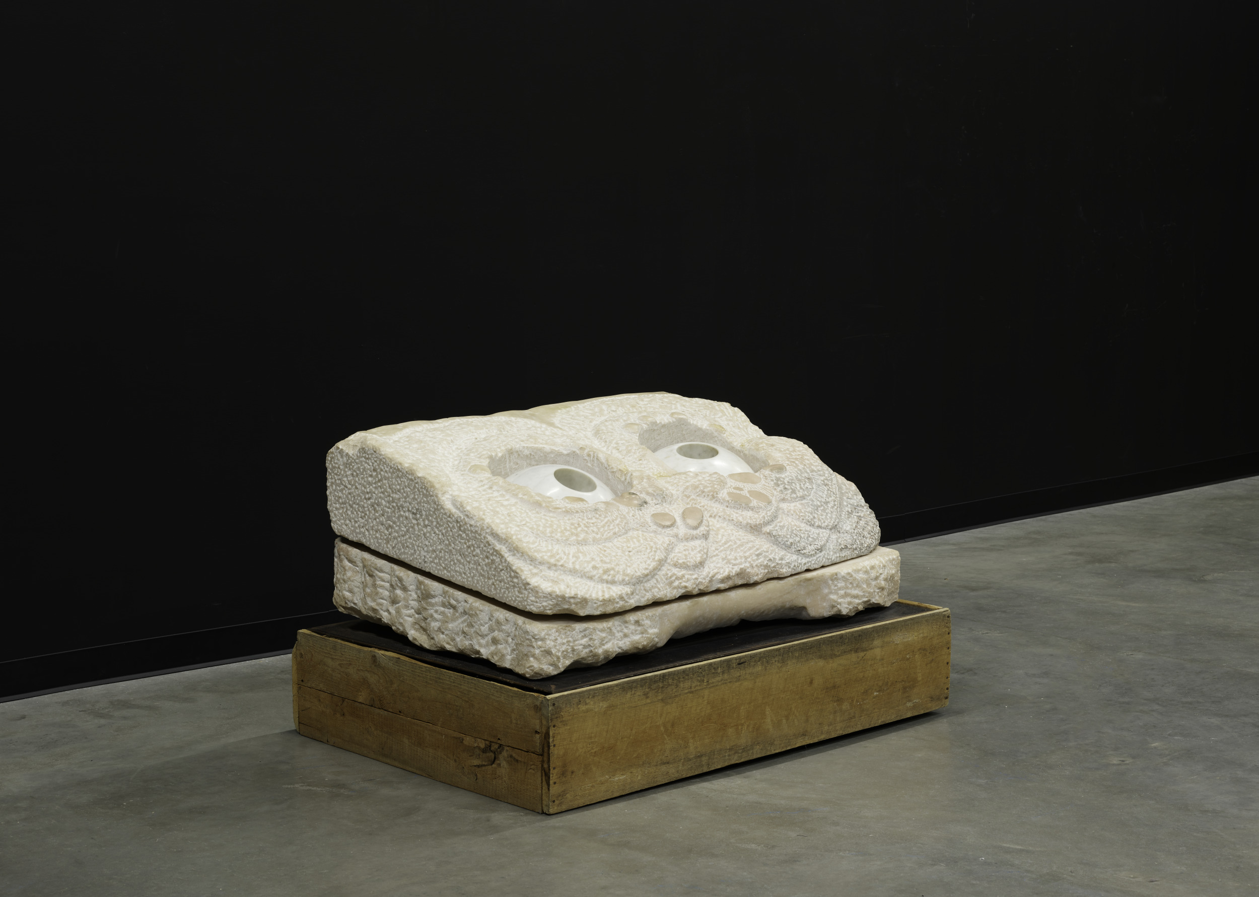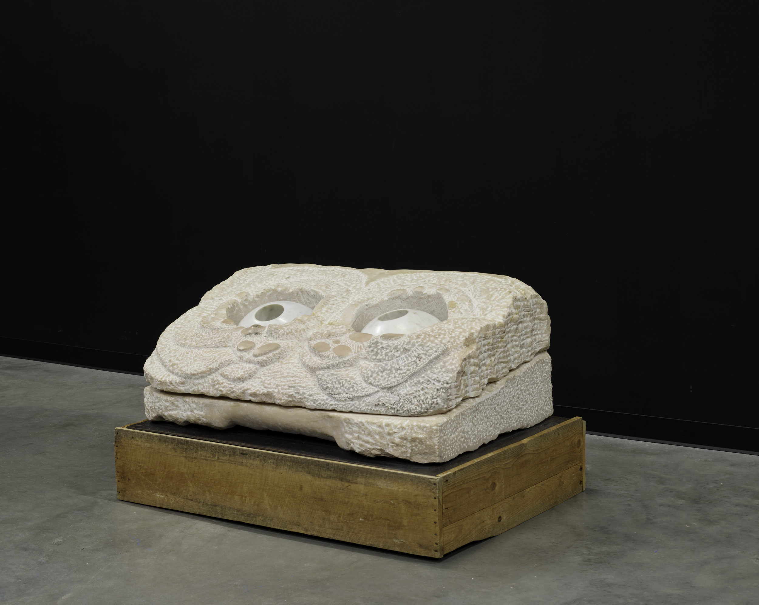 In this sculpture, the white marble “eyeballs” are not integrally connected to the pink slab. If the work were lifted, they would roll away. For the artist, this instability reflected the potential of losing control of one’s emotions when communicating through the eyes. Bourgeois chose pink marble not only because it recalls a flesh tone but also because she found the color seductive and feminine. She further worked the marble surface to create multiple indentations that represent life’s inevitable difficulties and their often imperfect resolutions.