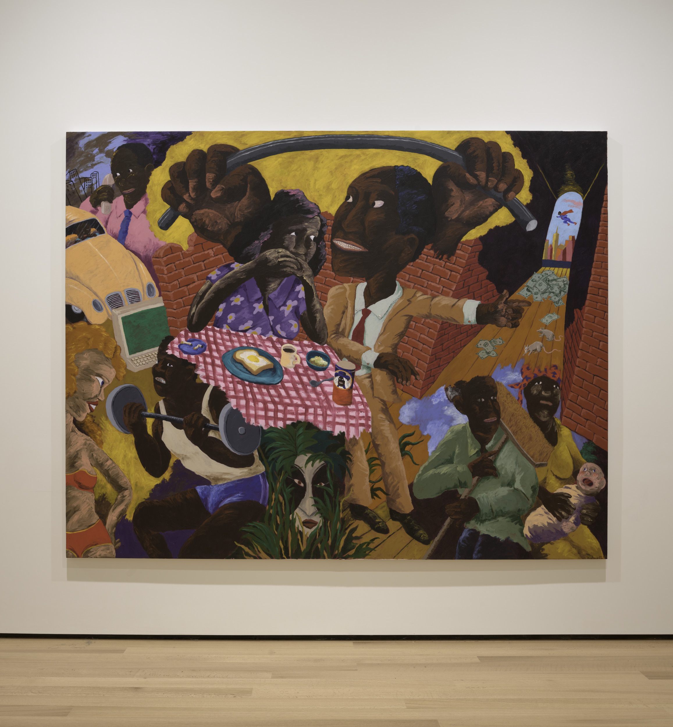 With its loud colors and teeming but tight compositional structure, Feeling His Oats embodies Robert Colescott’s ability to incite social commentary through visual narrative. Tackling themes such as sex, politics, and race, Colescott did not shy away from social taboos in his art. This painting depicts a man who seems to be enjoying the luxurious life. He is surrounded by his material possessions, such as a car and money. However, he is not alone. Several recognizable figures fill the scene. Stereotyped caricatures of the black athlete and a “Mammy” figure are given prominence. Two well-known cultural icons—the Quaker Oats man and Superman—appear on a much smaller scale and, unusually, are rendered as black. Both humorous and provocative, Colescott prompts viewers to consider the history and meaning of these stereotypes and the tensions they may create in contemporary society.