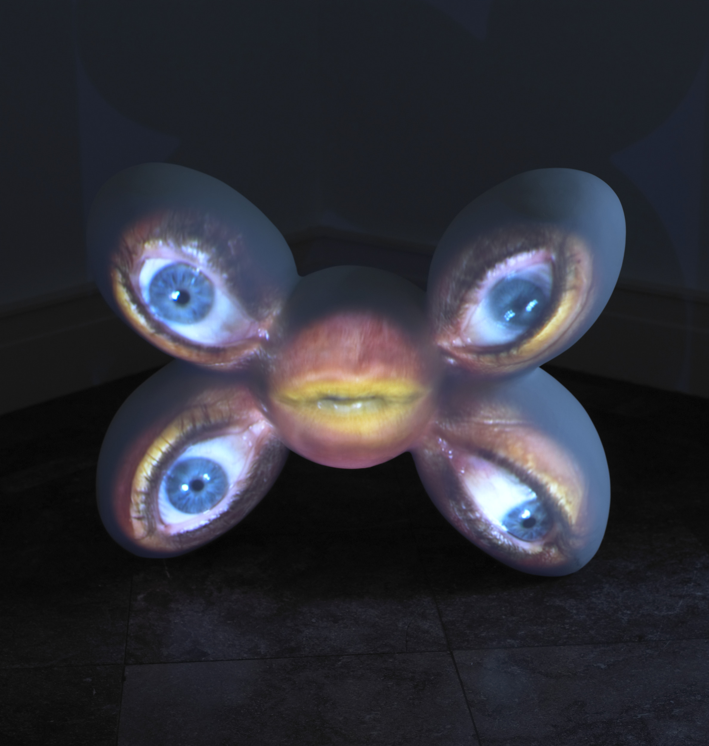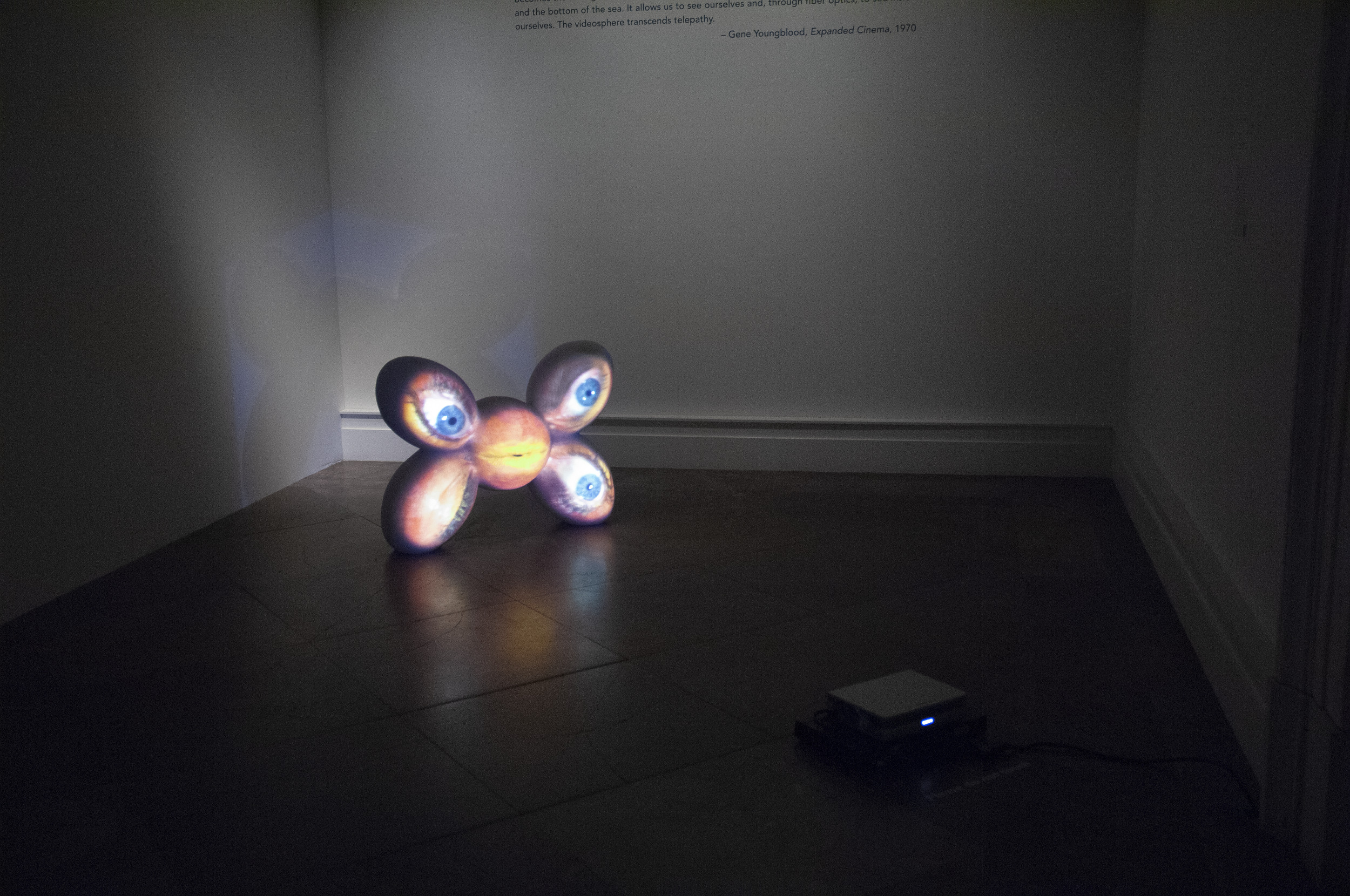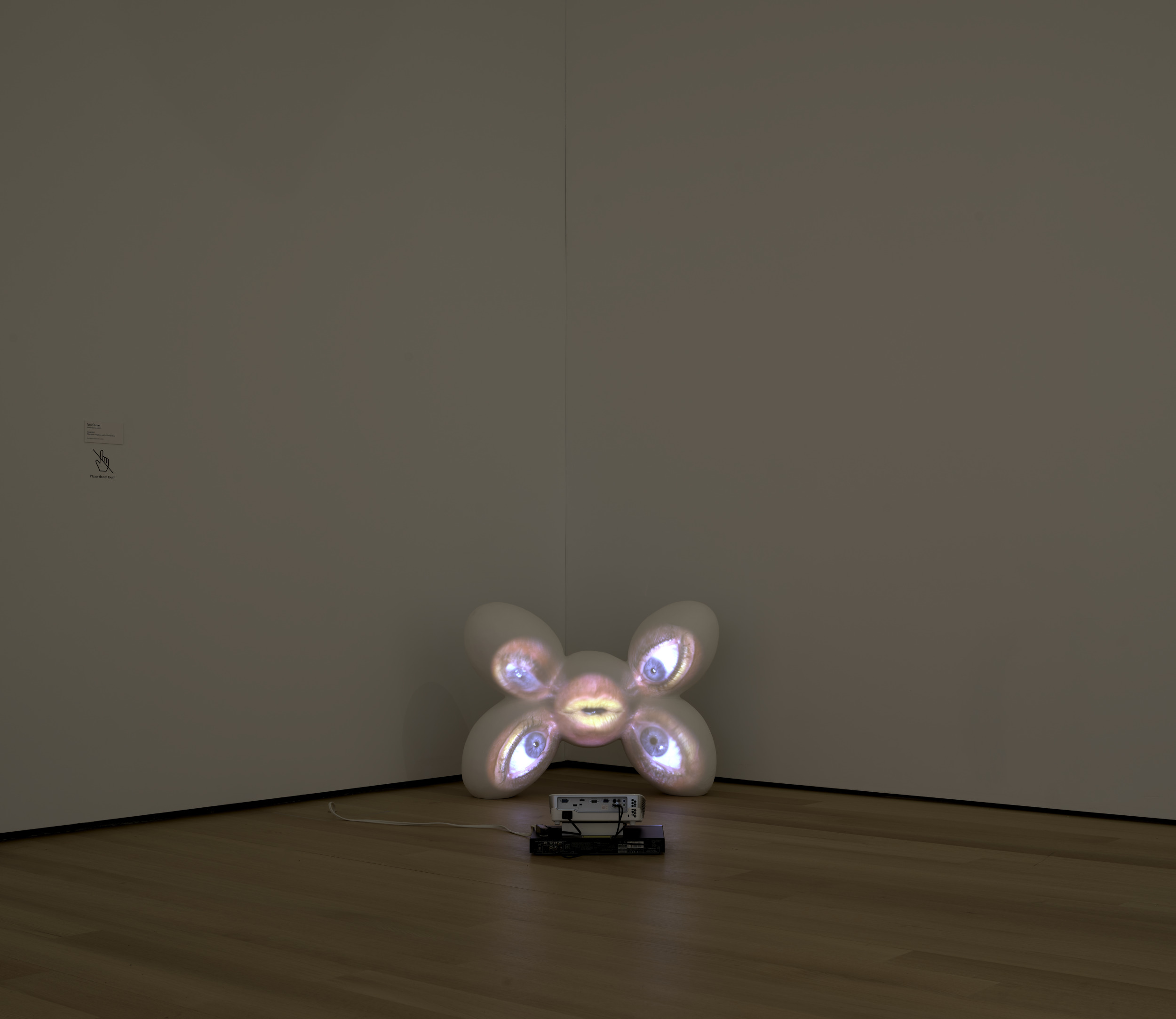 Tony Oursler is recognized as a leading figure in experimental film and video art, having emerging alongside a group of artists—including Mike Kelley (American, 1954–2012), Stephen Prina, and Jim Shaw—who attended the California Institute of the Arts (CalArts) in the 1970s. Since 1991, Oursler has projected video images onto doll-like dummies, disembodied heads, and strange alien forms to create uncanny, unsettling, and ultimately funny figures. Junk is part of a series of works begun in 2003 in which the artist projects large eyes and talking mouths onto abstract shapes. This work features Oursler’s own eyes and mouth performing a script of random words, statements, and thoughts. He calls these conversations, which exist only in our minds, the “undertow of language.” The overall strangeness of the large, disembodied features and the incoherent vocals proves captivating and causes us to attempt to decipher the speech—the same way we would try to search for meaning in a nightmare.