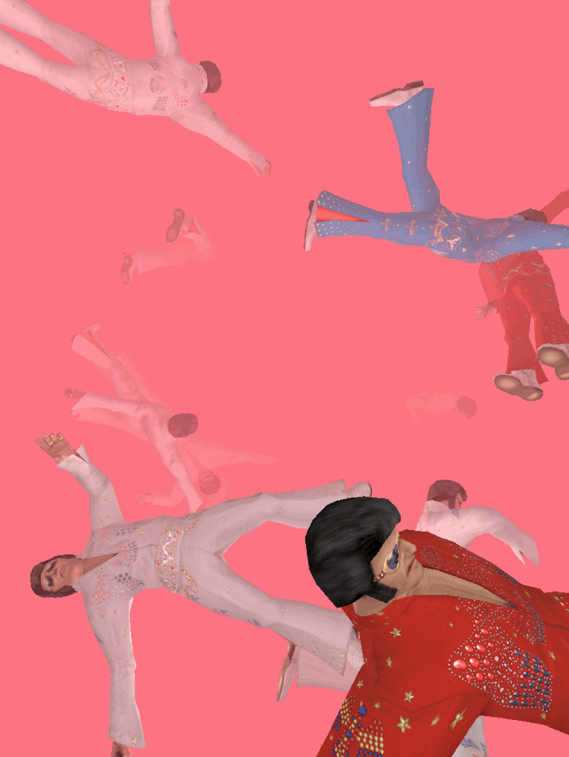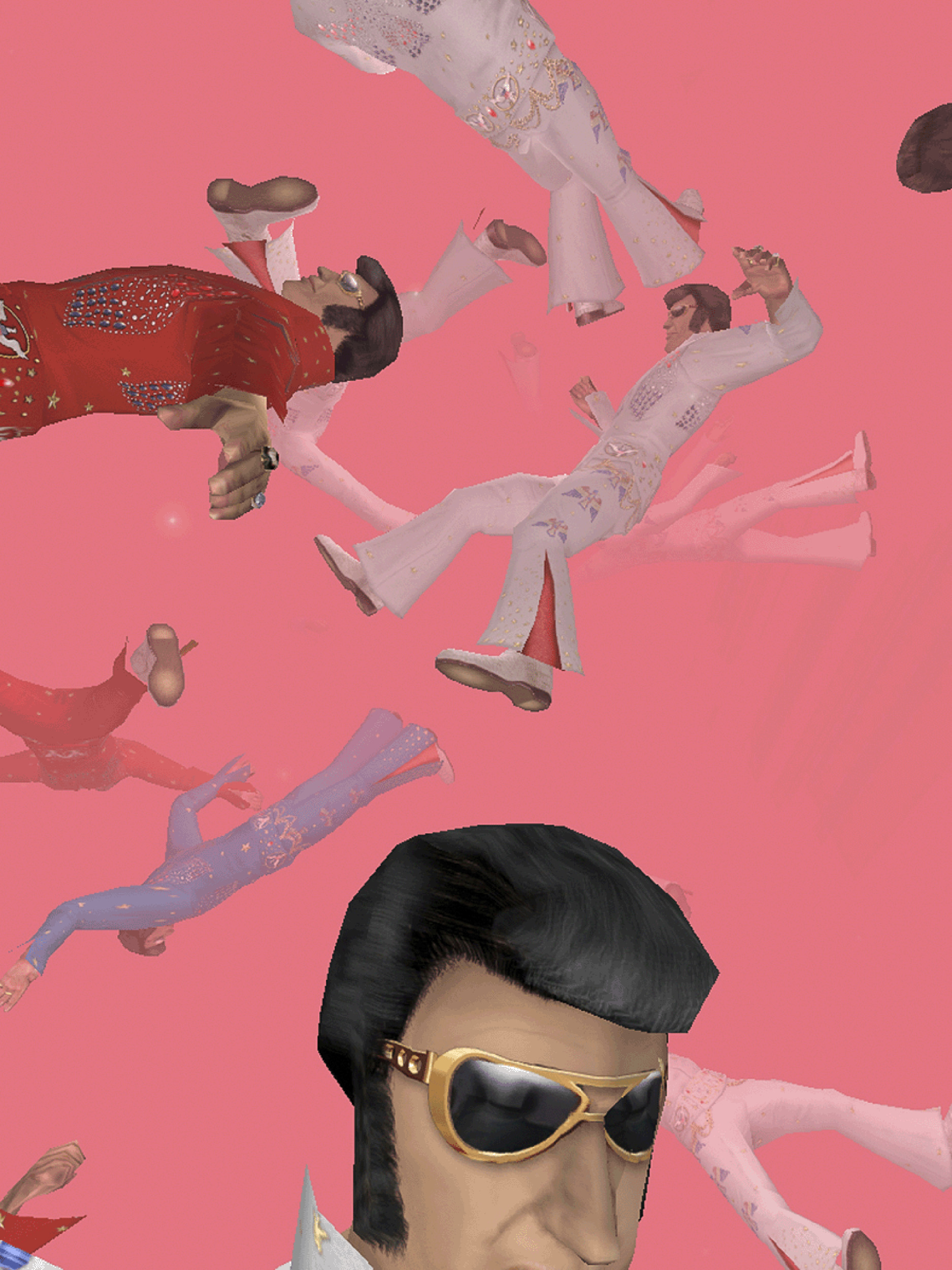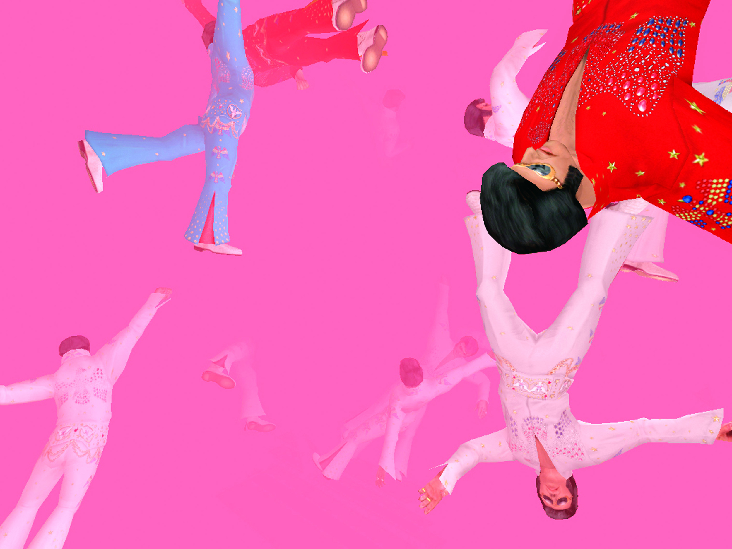 Today, interactive media has become ubiquitous in a world made increasingly small by technology. Brody Condon is part of a group of artists who take inspiration from and transform their adolescent memories of these technological advancements. To create DeRez FX.Kill (KarmaPhysics<Elvis), Condon modified a version of Unreal, a series of first-person computer games released between 1998 and 2007. Condon isolated the programming in the game’s original real-time physics system—called Karma, it controls what happens to a character when they are killed—and immerses the viewer in an endless abyss of pink fog filled with countless flailing Elvis Presley bodies. Here, “The King of Rock and Roll” lives on forever as the figures float aimlessly in space. In this work, Condon has commented that he misuses the Karma system as a “new representation of death via code, not just the visual surface of trauma but the physical dynamics of the falling figure.” While the premise of the work may seem dark, Condon’s subversive sense of humor shines through. Death is a grave matter in real life, but in the world of gaming, it is more of an inconvenience: video game characters lose their lives every day, only to start all over again.
