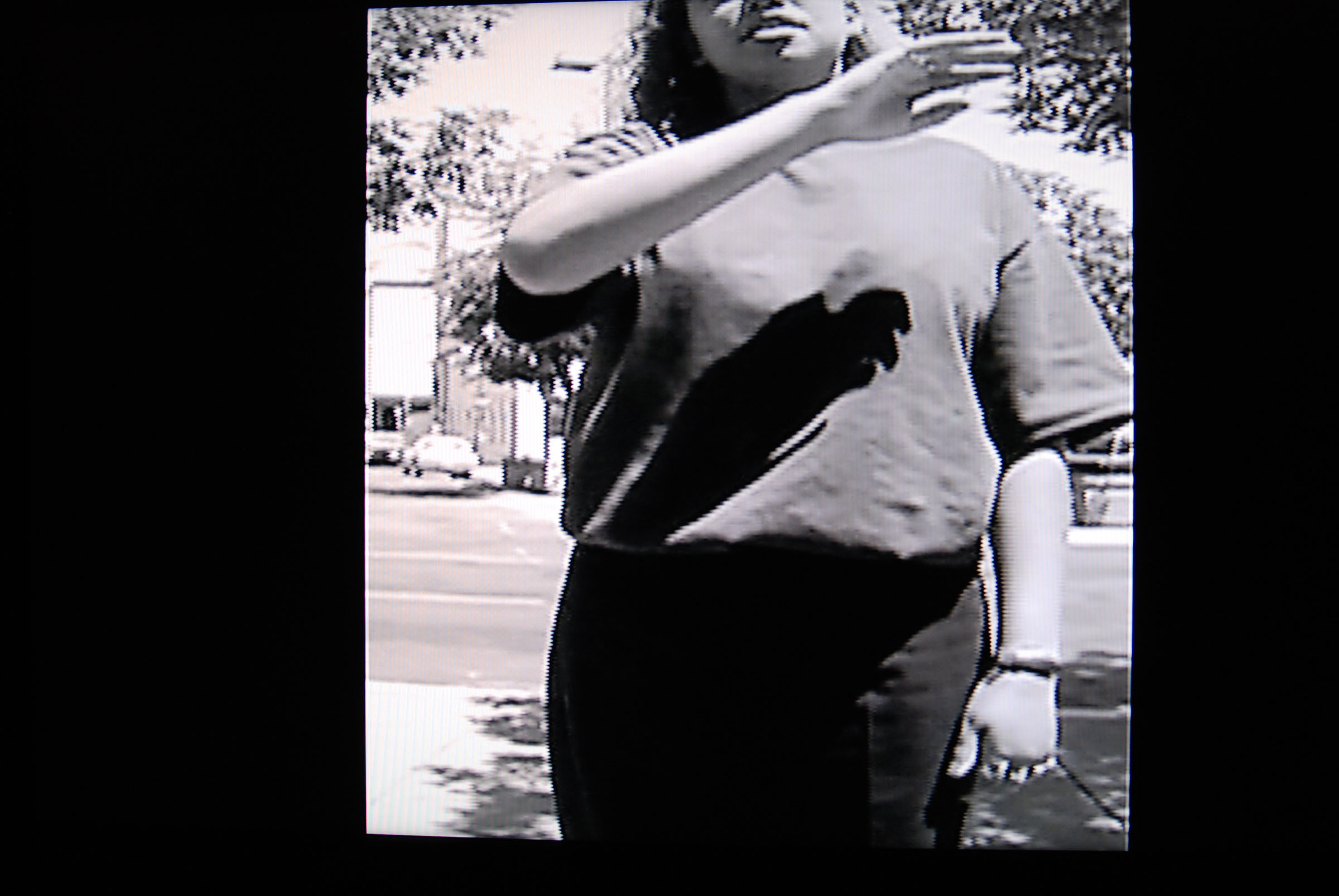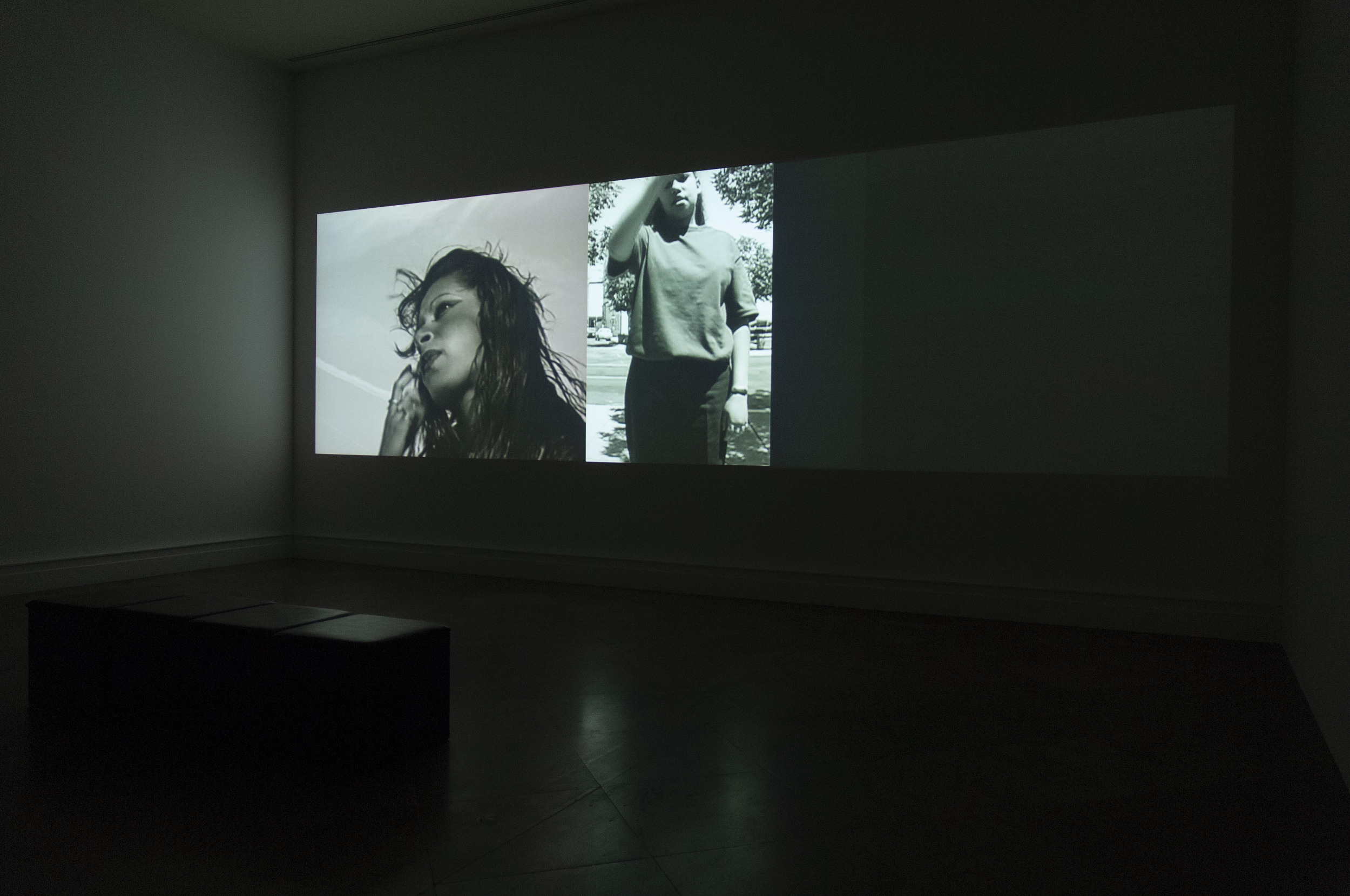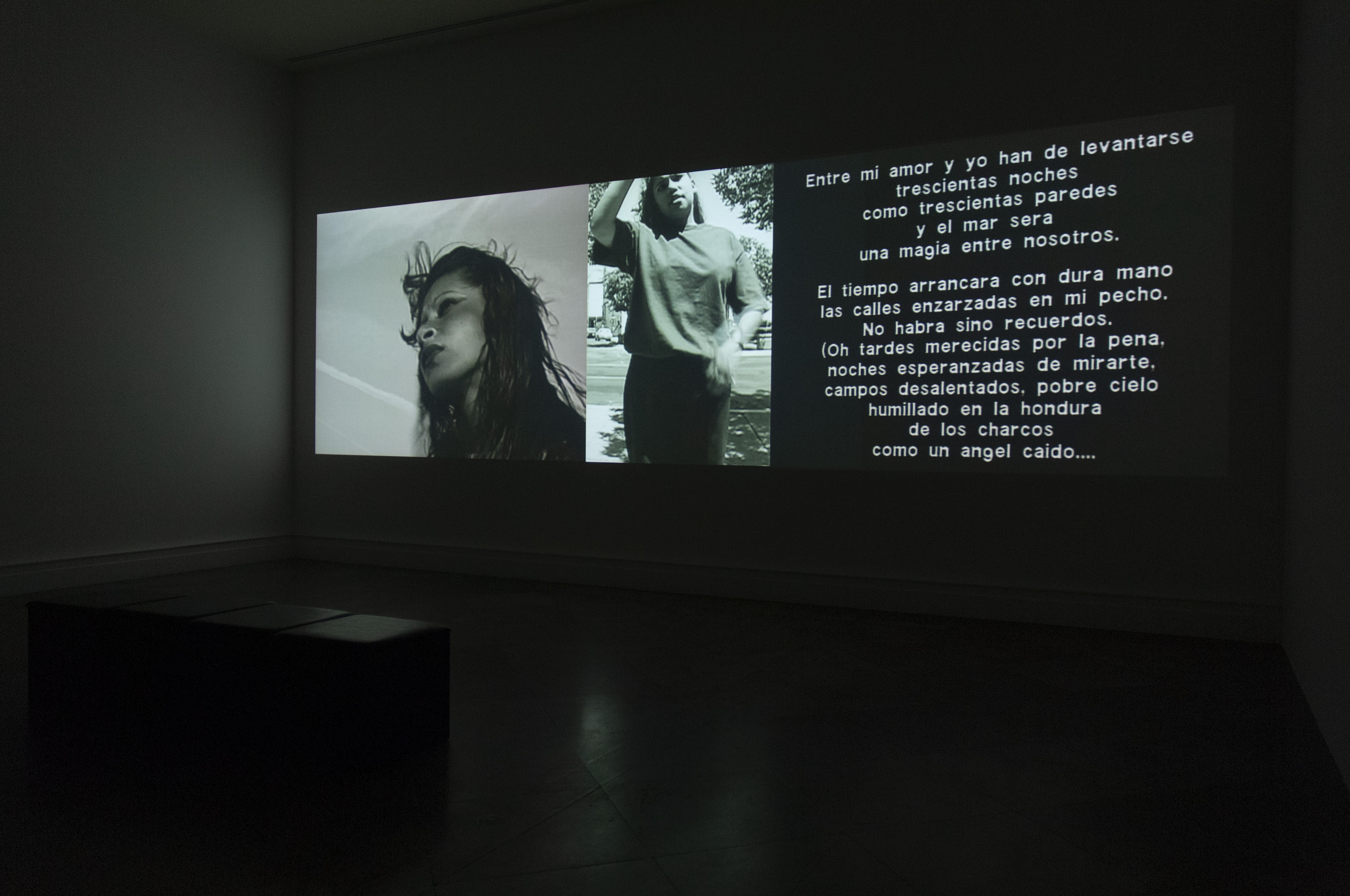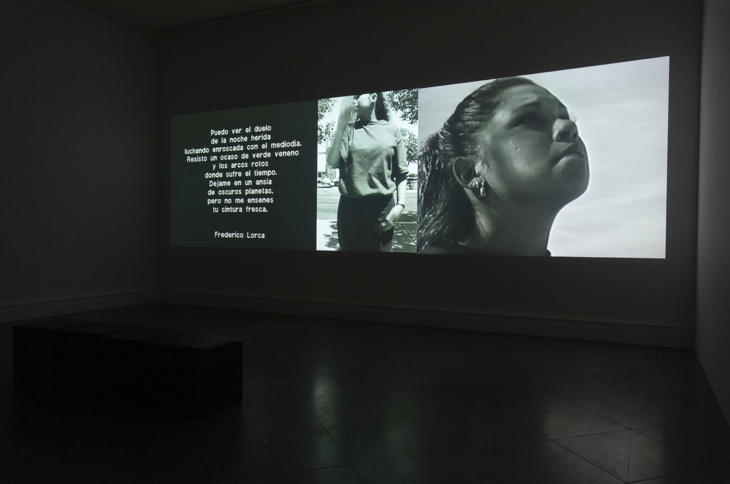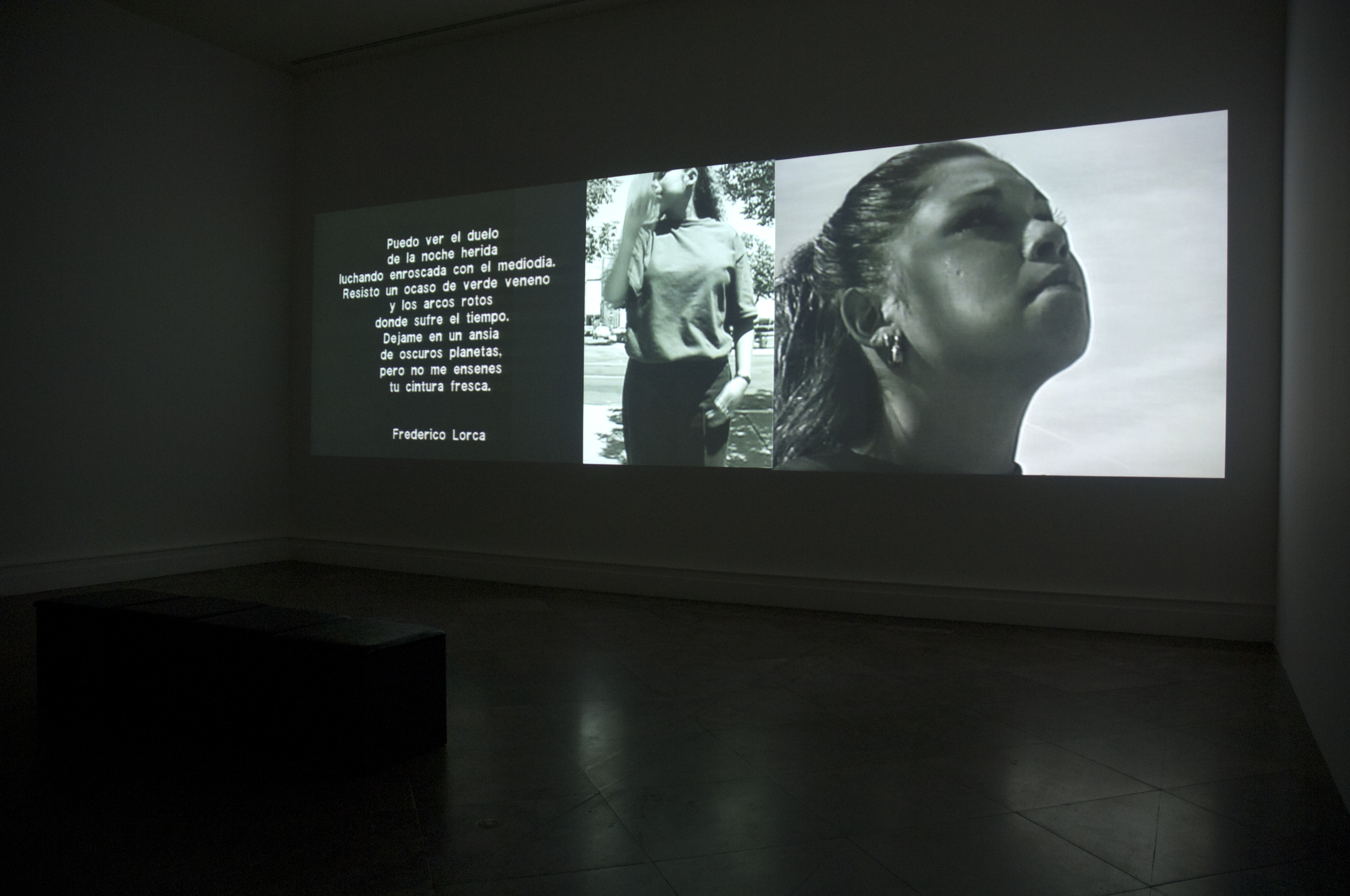 In James Drake’s Tongue-cut Sparrows communication is relegated to gestures within a set of limitations imposed by outside forces. The installation centers on a silent sequence of video projections of three women—Gabriella, Angie, and Liz—standing on a sidewalk outside a jail in El Paso, Texas. To avoid the bureaucracy of entering the jail, the women communicate with prisoners inside the building using a homemade sign language. Drake, fascinated by the great lengths to which these, and other visitors, go to communicate with their loved ones, asked them to interject poetic texts in their communication and then be recorded on video. Drake worked with the women to select texts from an array of sources, including the writings of the Spanish poet Federico García Lorca, as well as Shakespeare and Dante. Later, the artist completed a series of large-scale charcoal drawings centering on the same subject matter; in the drawings, images of the figures are joined by some of the words that were communicated between the couples. Often, there is a breakdown, or strain, in the communication—a tension that is emblematic of Drake’s ongoing interest in the social dynamics along the United States/Mexico border.