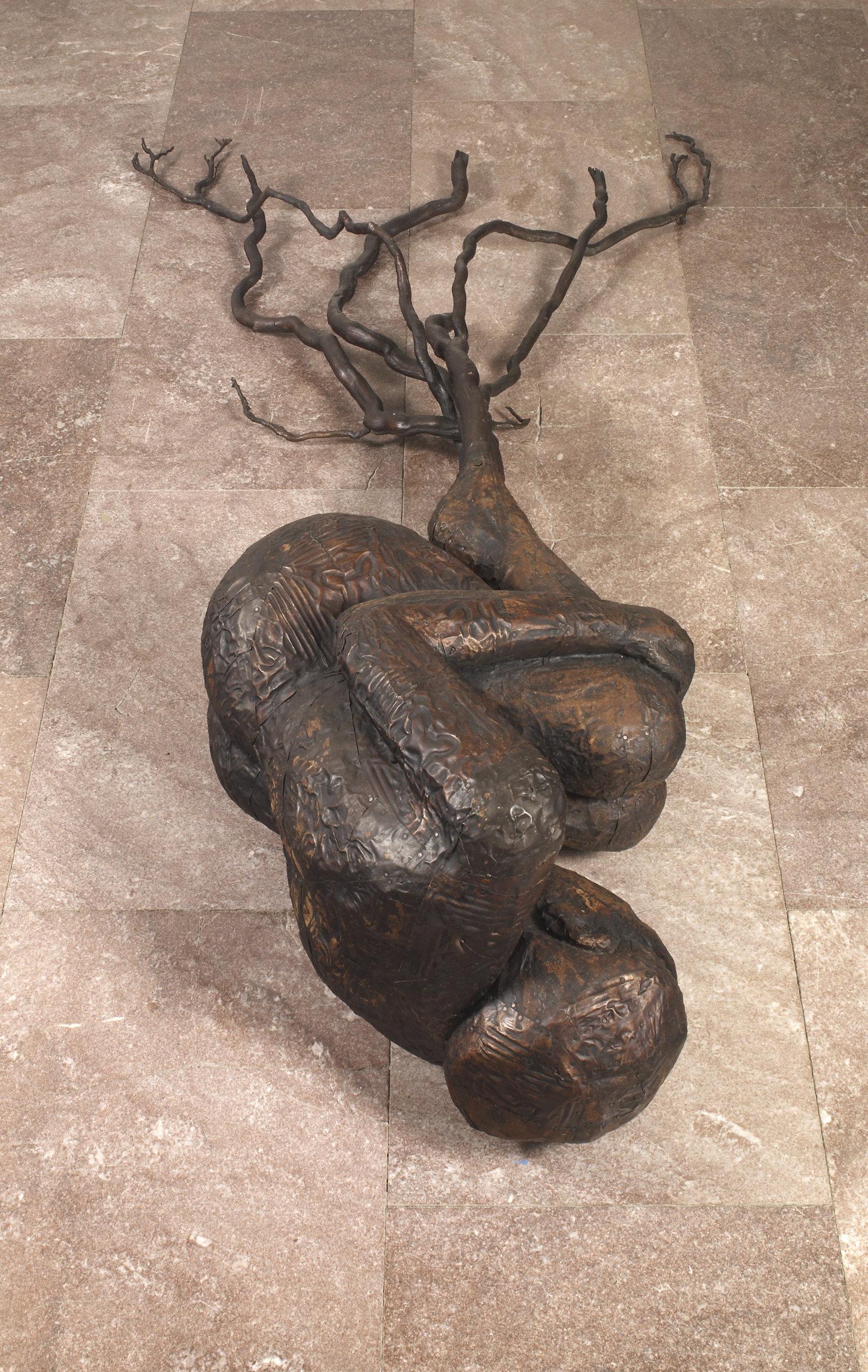 Growing up, Alison Saar assisted her father with restoration work and came into contact with a variety of cultural artifacts. She links this early exposure to her use of reclaimed items, such as tin ceiling tiles, old linoleum, and used skillets, in her work. Reflecting her multicultural heritage, Saar models many of her subjects after African deities as a means to glorify and celebrate the black female body. In Bareroot a female figure lies on its side, knees pulled tightly to its chest and its feet melded into a series of meandering roots. The figure, who appears to have undergone a process of scarification, is clad with reclaimed ceiling tiles patinated with tar. While the roots imply a connection to the earth, they also suggest the figure has been ripped from the soil and rendered non-ambulatory by her uprootedness.