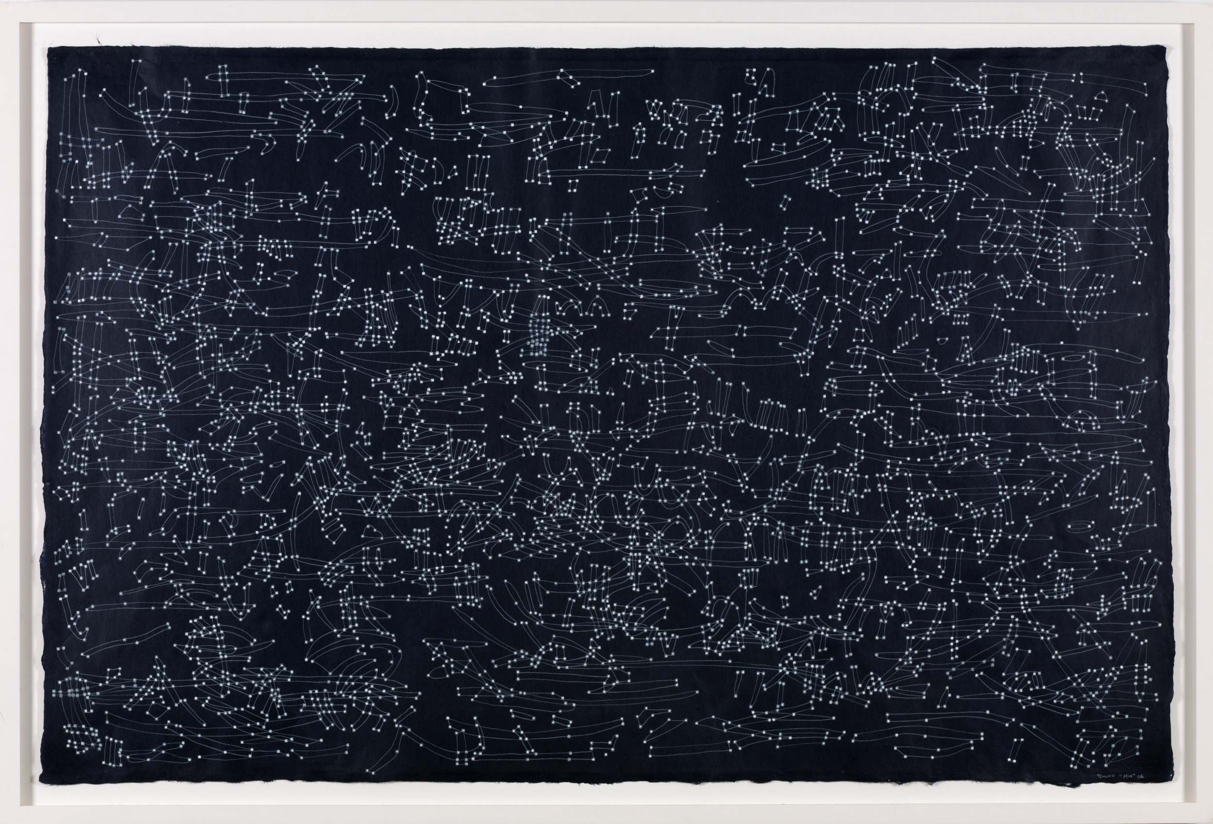Theresa Chong combines computer-generated landscapes and doodles with the scanned and manipulated imagery of abstract painters. However, her intricate, detailed, and fragile work invokes the hand of the artist rather than its digital origins. To develop her compositions, the artist traces gestural marks from the creations of significant Abstract Expressionist painters, such as Willem de Kooning. She then digitally merges these with her own linear interventions to create a singular image. The resulting forms establish the basis for a final drawing that she maps out by hand onto rice paper. Additionally, Chong adds what she calls “joint points” wherever two lines can be connected to emulate a brush stroke. This aesthetic element is meant to mimic the “highlight” function found in many software programs, such as Adobe Illustrator. Throughout her practice, Chong’s painstaking combination of old and new mediums stems from her desire to keep “the heartbeat of the abstract expressionist gesture alive,” despite the prevalence of contemporary technology.