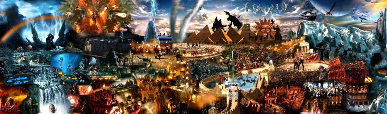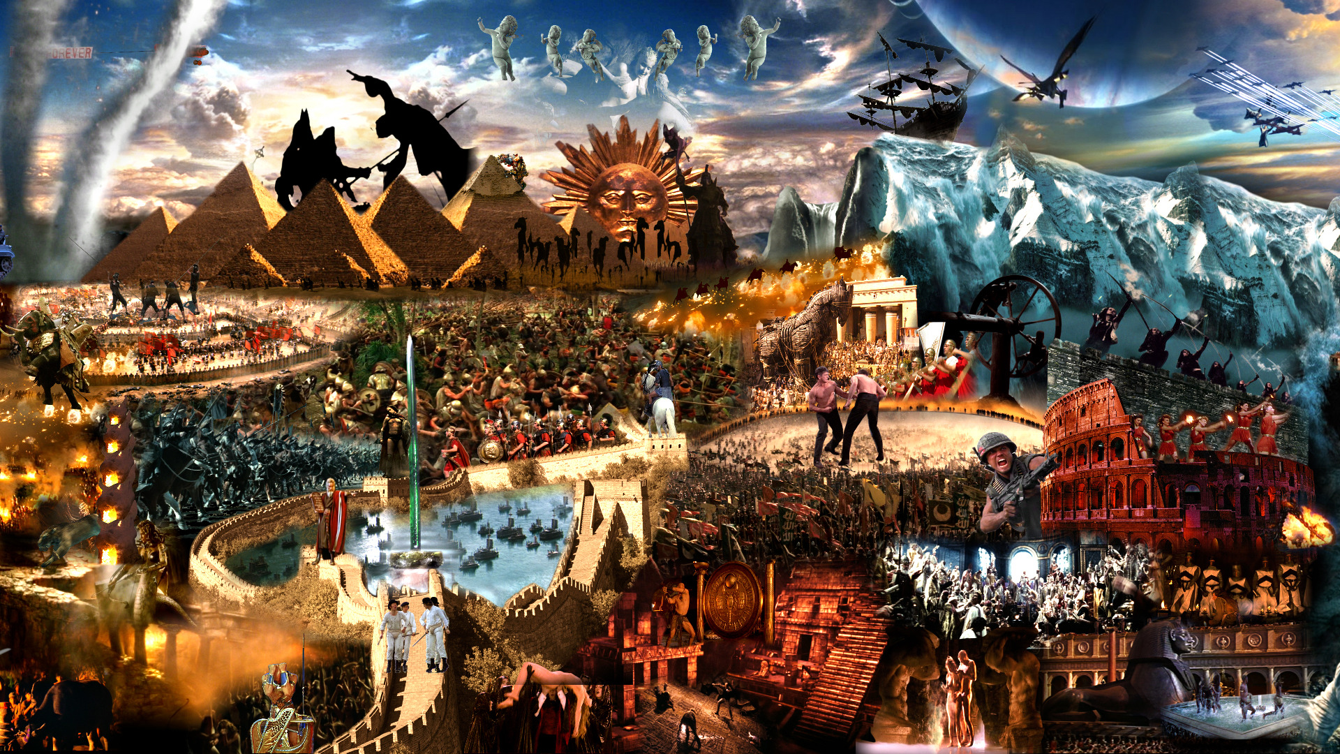 Created using the compositor software Flame and the Maya 3-D modeling program,Evolution (Megaplex) presents a scrolling epic of the spectacle of human conflict as recounted by the cinematic lens. It is part of Marco Brambilla’s “Megaplex” series—alongside Civilization (Megaplex), 2008, and Creation (Megaplex), 2012—and each work in the trilogy takes on a world-historical theme worthy of its grandiose title.