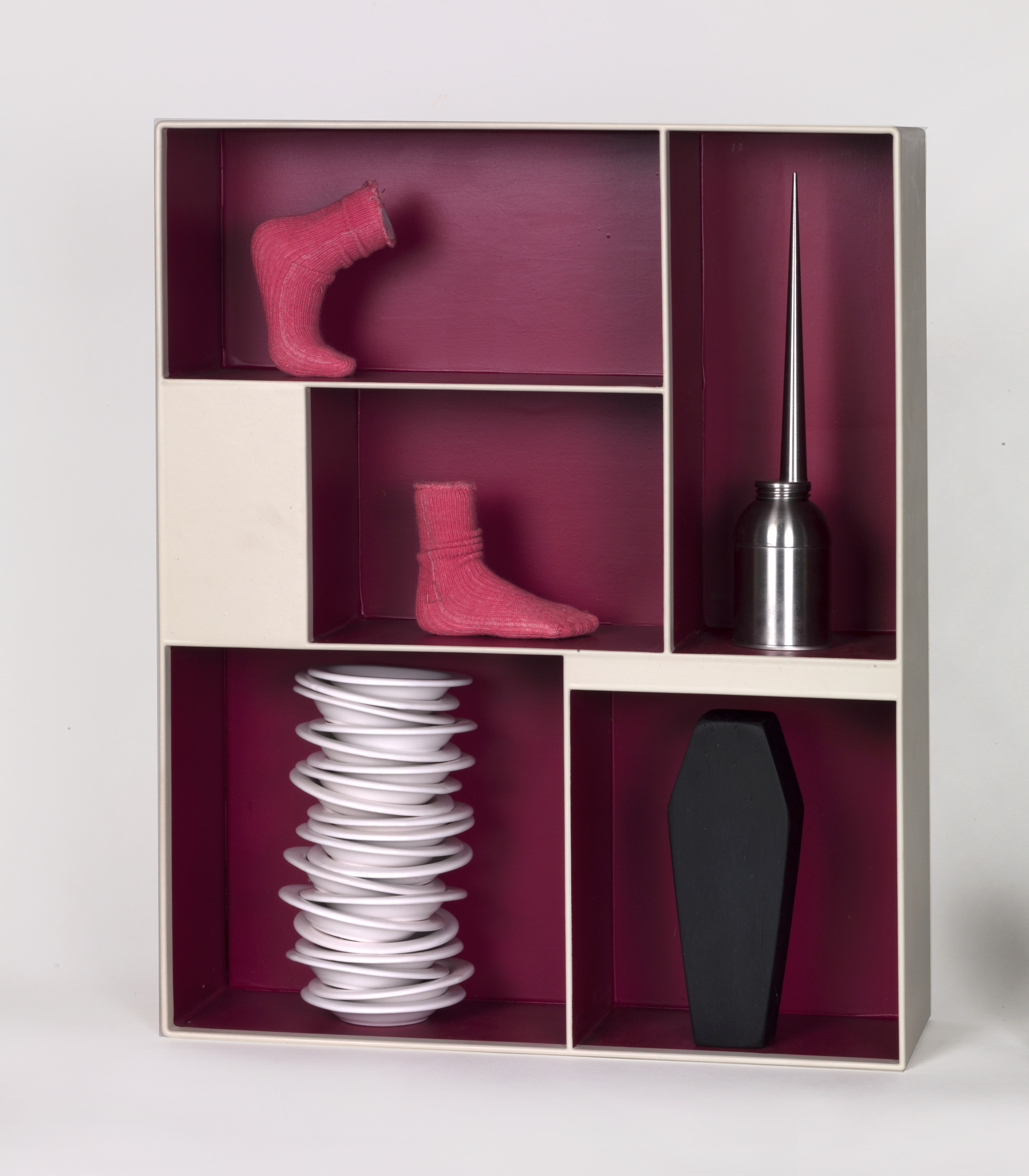 box: paint on metal, feet: plaster with cotton, oilcan: stainless steel, plates: glazed ceramic, coffin: ink on wood