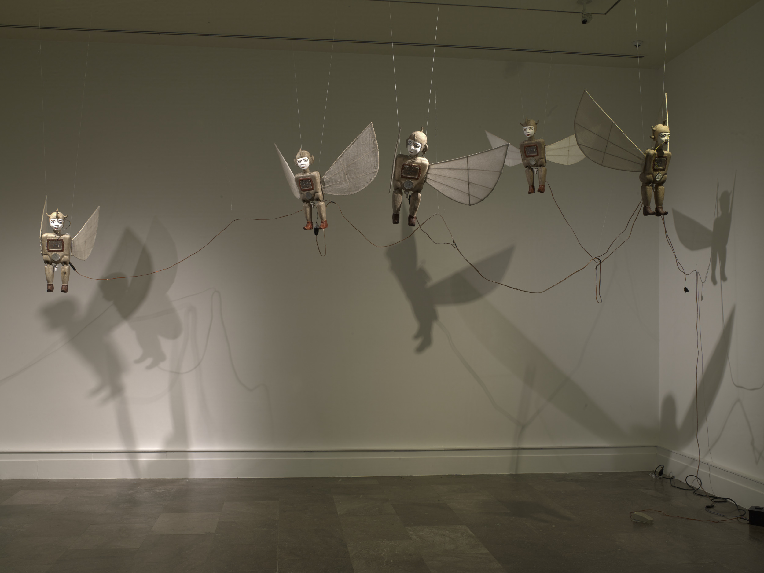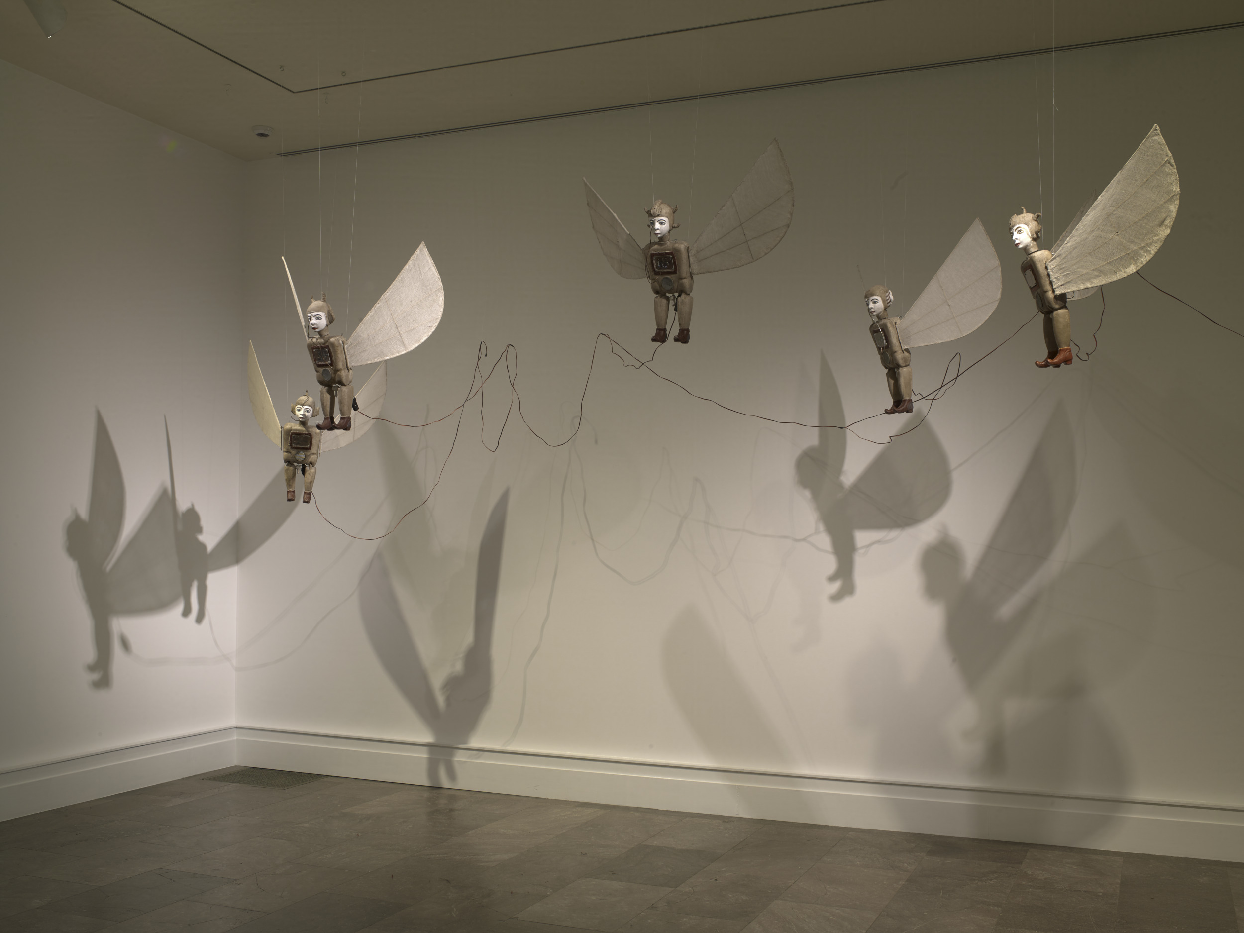 Heri Dono’s Bidadari (Flying Angels) are reminiscent of the figures found in wayang golek, a puppet theater tradition native to Indonesia. The artist also cites Flash Gordon and other science fiction characters as an influence, and his handmade angels connect folk and popular culture. Dono created this work during a period of intense political repression in Indonesia, and he chose to engage with the imagery of puppetry because of its long history as a platform where otherwise taboo social and political issues may be addressed through allegory and symbolism. Here, Dono offers us a small moment of personal freedom: you may choose to activate the work—causing the bidadari to flap their wings and make noise— by stepping on one of the two floor pedals. Referencing both traditional and contemporary Indonesian culture, Bidadari (Flying Angels) also functions as a symbol of liberty and the power of the human imagination.